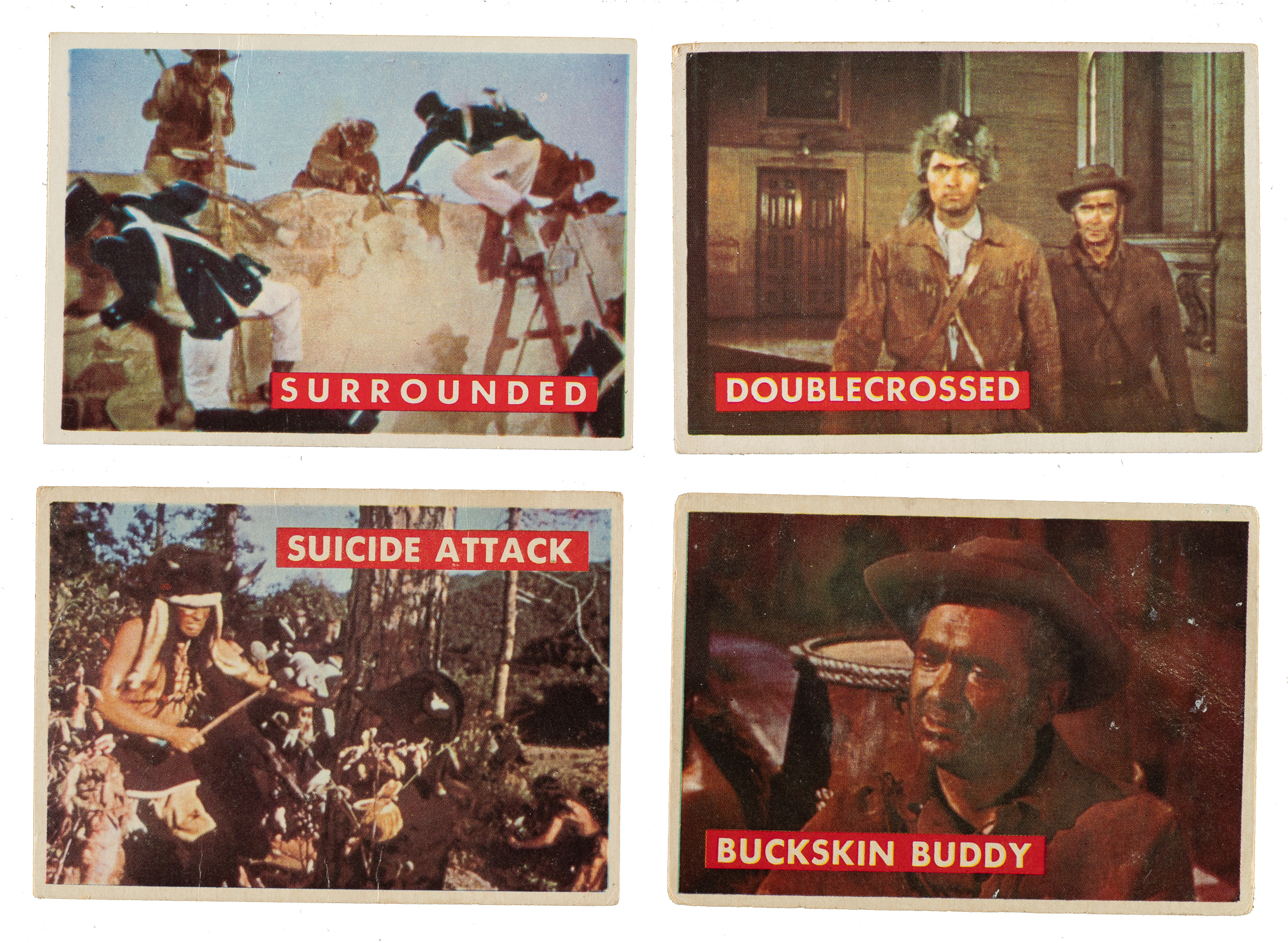 Complete 80-card set of 1956 Topps "Davy Crockett" Green Back trading cards. Includes two duplicates (#27a and 80a). Condition ranges from Pr to Vg-Ex, averaging Gd-Vg. Total: 82 cards. The size/weight of this item requires that there will be an additional shipping charge for this lot.