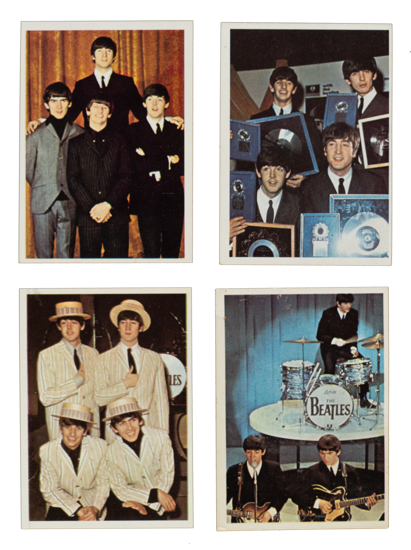 Complete 64-card set of 1964 Topps "Beatles - Color" trading cards. Condition ranges from Vg to Ex-Mt (averaging Vg-Ex/Ex), with one Gd and a few Nr/Mt. Total: 64 cards. The size/weight of this item requires that there will be an additional shipping charge for this lot.