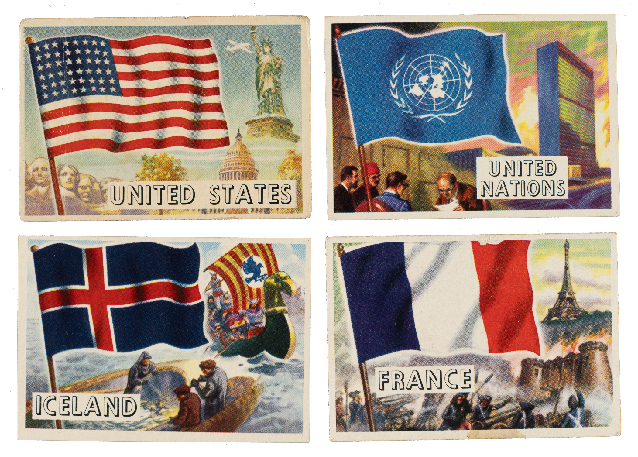 Complete 80-card set of 1956 Topps "Flags of the World" trading cards. Condition is 36% Ex to Ex-Mt (including a couple Nr/Mt), 50% Vg to Vg-Ex, and 14% lesser. Keys: #1 United States (Gd) and 80 United Nations (Ex). Total: 80 cards. The size/weight of this item requires that there will be an additional shipping charge for this lot.