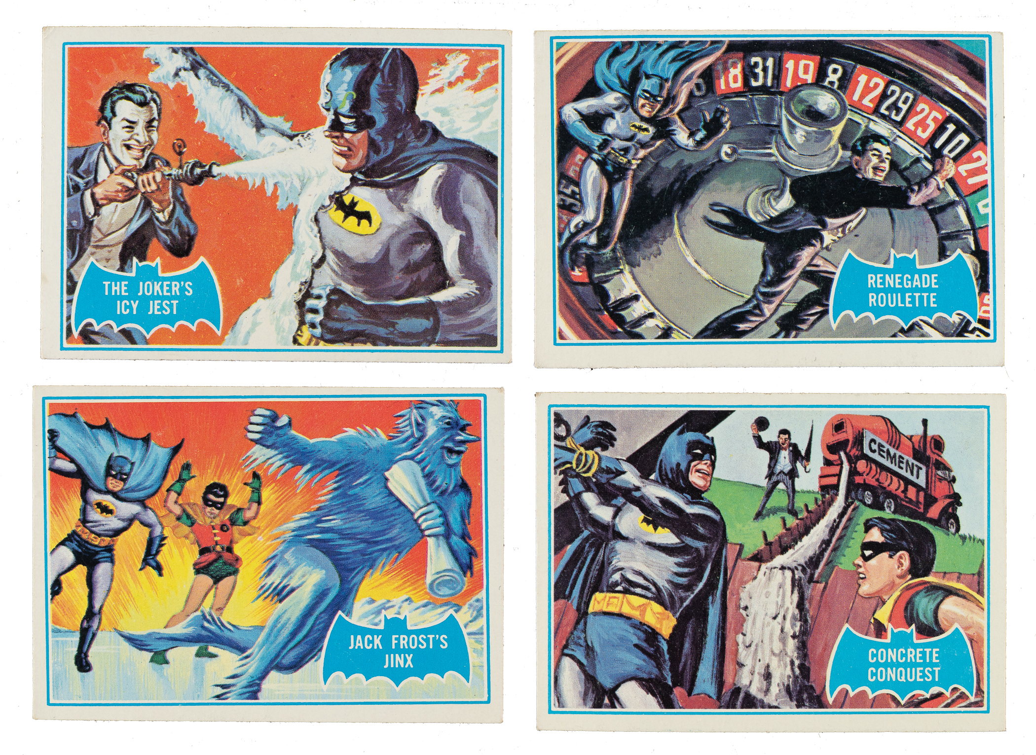Complete 44-card set of 1966 Topps "Batman" Series B (Cowl Back) trading cards. Condition ranges from Vg to Ex (averaging Vg-Ex), including a couple with a slight miscut. This set was produced with two back variations (cowl back and puzzle back), with this set consisting entirely of cowl backs. Total: 44 cards. The size/weight of this item requires that there will be an additional shipping charge for this lot.