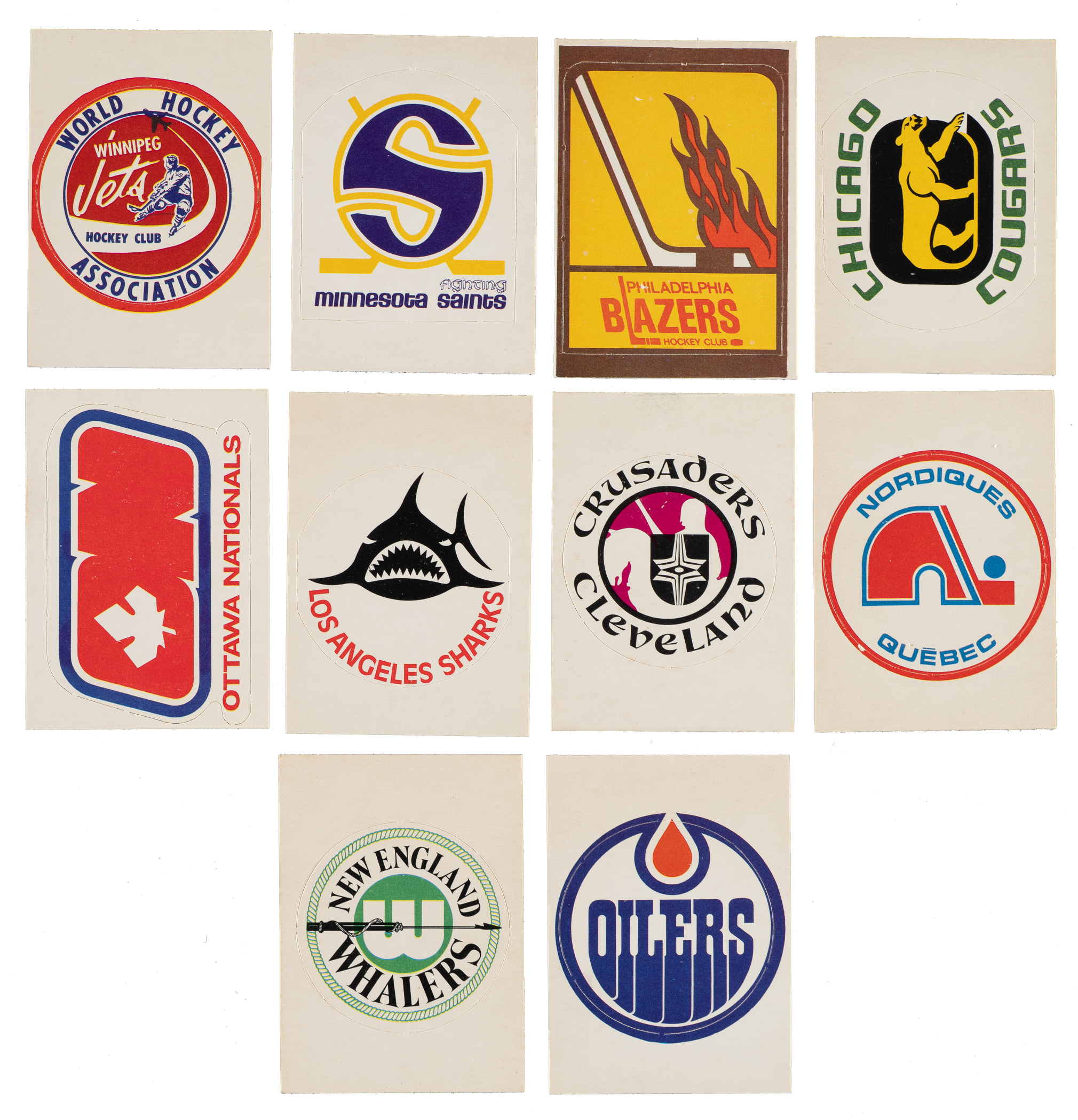 Presented is a collection of ten 1972-1973 O-Pee-Chee Hockey Team Logo cards. Condition is Vg-Ex to Ex-Mt overall, with two lesser. This collection consists of the following: Blazers, Cougars, Crusaders, Jets, Nationals, Nordiques, Oilers, Saints, Sharks, and Whalers. Total: 10 cards.