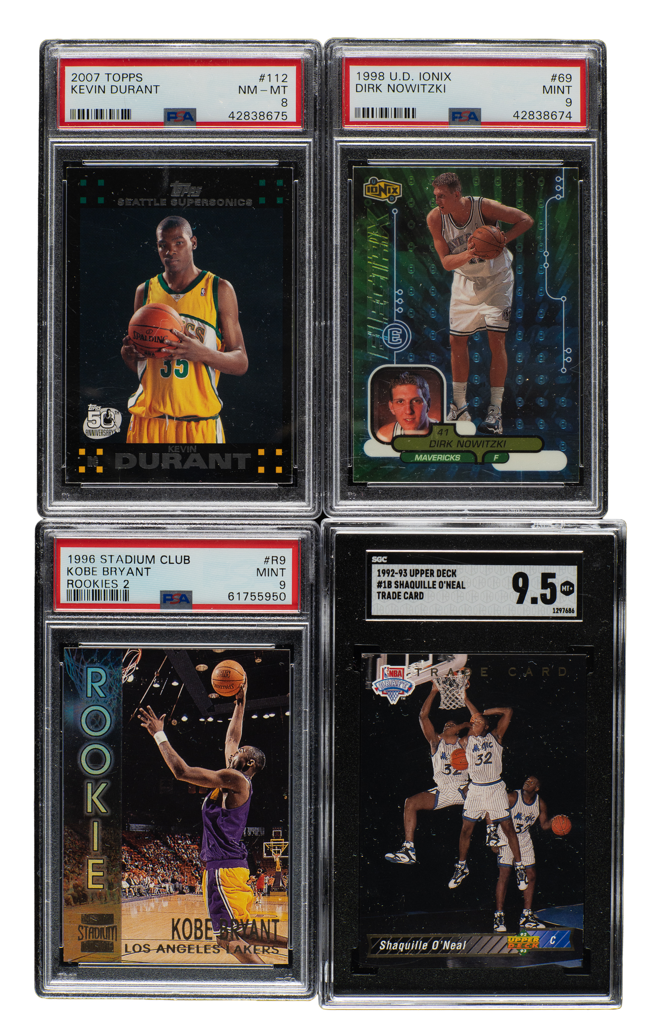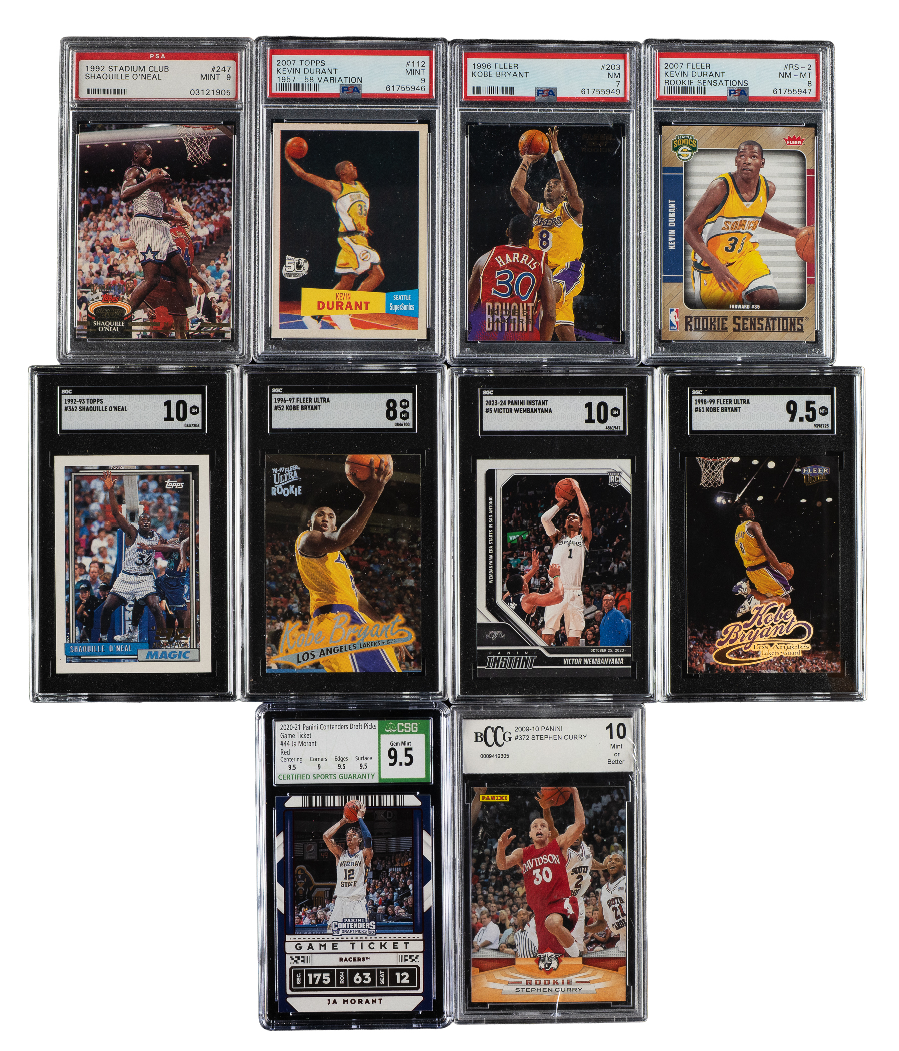 Presented is a high-grade collection of thirteen cards from five different Topps baseball-card sets spanning the years 1992 to 2023. This lot consists entirely of Hall of Famers and stars, including rookie cards of Shaquille O'Neal, Kobe Bryant, and Kevin Durant. The thirteen cards are graded and encapsulated by PSA (7), SGC (5), and CSG (1). This collection consists of the following: 1) 1992-1993 Upper Deck Trade Card (1 card): #1B O'Neal RC (SGC MINT+ 9.5). 2) 1992-1993 Topps (1 card): #362 O'Neal RC (SGC GEM MINT 10). 3) 1992-1993 Topps Stadium Club (1 card): #247 O'Neal RC (MINT 9). 4) 1996-1997 Fleer Ultra (1 card): #52 Bryant RC (SGC NM/MT 8). 5) 1996-1997 Topps Stadium Club Rookies 2 (1 card): #R9 Bryant RC (MINT 9). 6) 1996-1997 Fleer (1 card): #203 Bryant RC (NM 7, scratched holder). 7) 1998-1999 Fleer Ultra (1 card): #61 Bryant (SGC MINT+ 9.5). 8) 1998 Upper Deck Ionix (1 card): #69 Nowitzki RC (MINT 9). 9) 2007-2008 Topps (1 card): #112 Durant RC (NM-MT 8). 10) 2007-2008 Fleer Rookie Sensations (1 card): #RS-2 Durant (NM-MT 8). 11) 2007-2008 Topps (1 card): #112 Durant/1957-1958 variation RC (MINT 9). 12) 2020-2021 Panini Contenders Draft Picks Game Ticket Red (1 card): #44 Morant (CSG GEM MINT 9.5). 13) 2023-2024 Panini Instant (1 card): #5 Wembanyama (SGC GEM MINT 10, print run of 44,142). Total: 13 cards. The size/weight of this item requires that there will be an additional shipping charge for this lot.