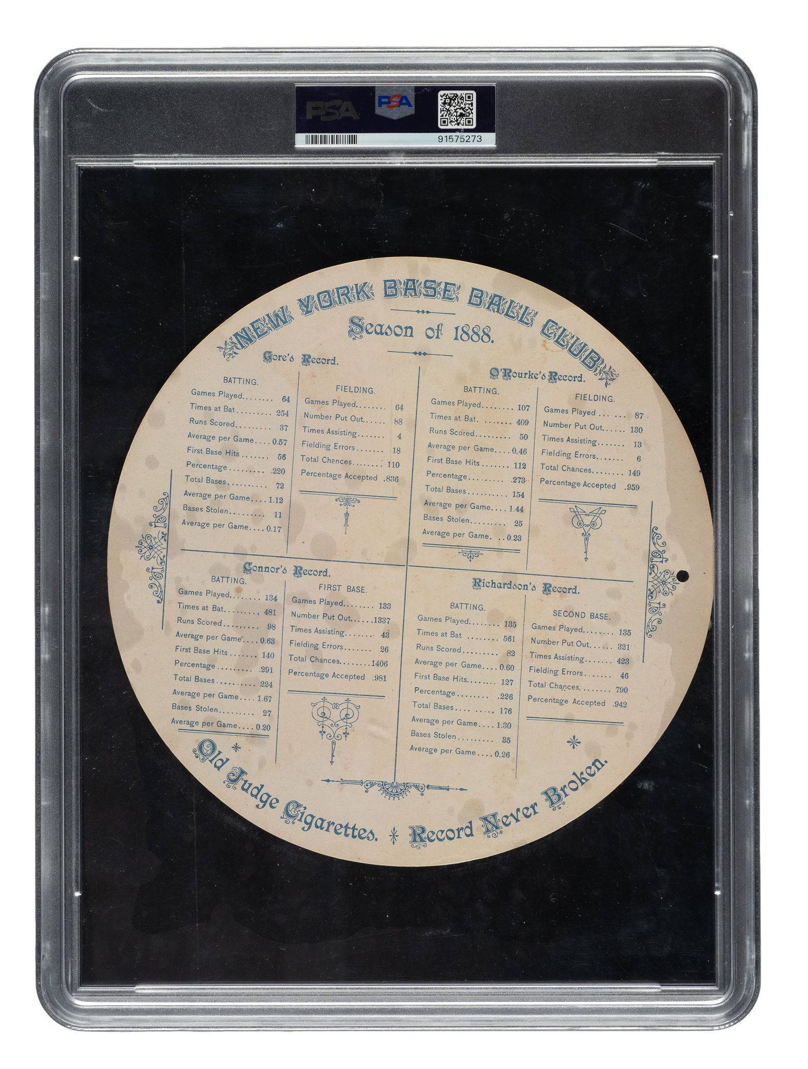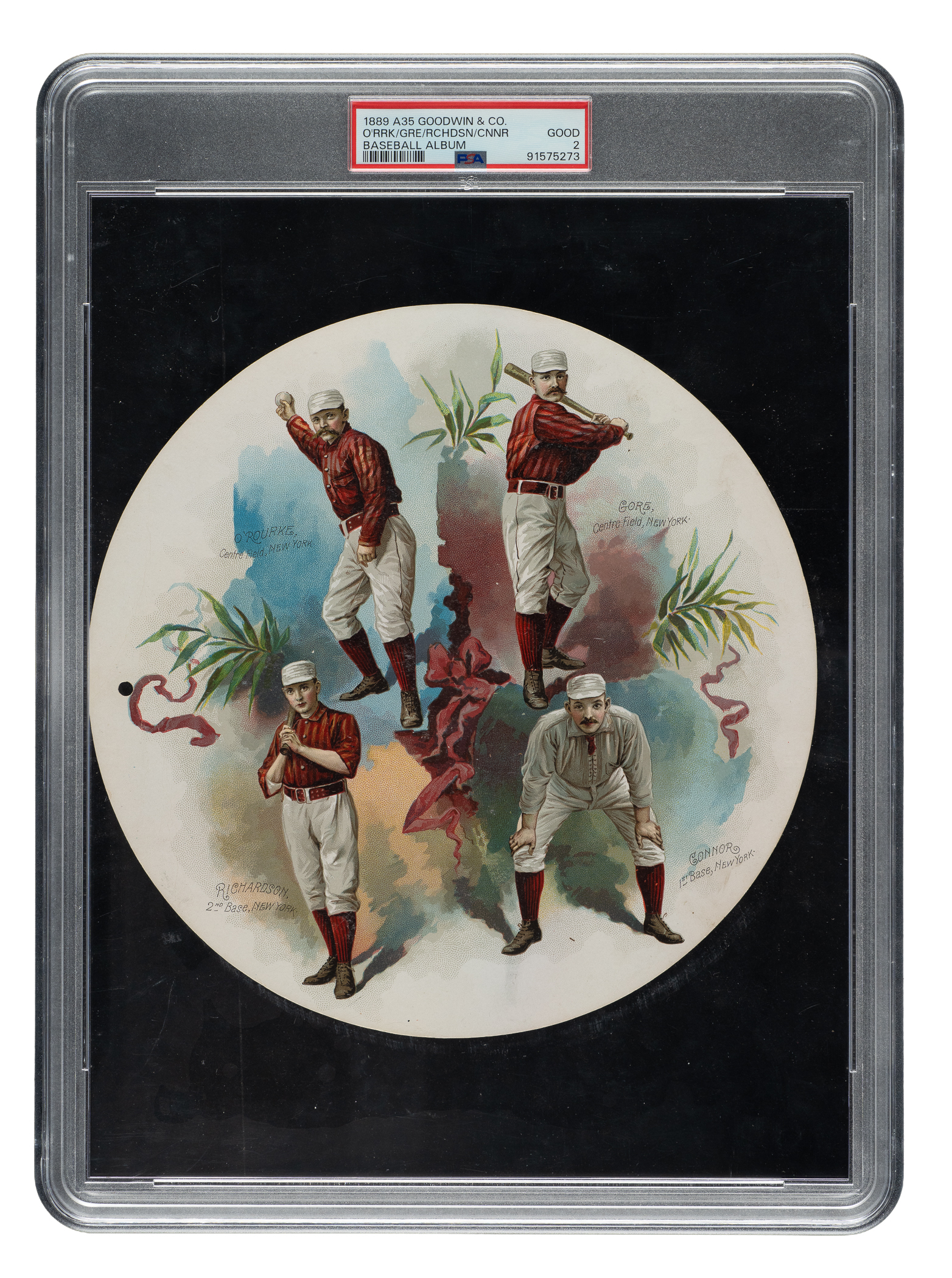 Presented is a single album page from the 1889 Goodwin "Round Album" series. The page features individual illustrations of four different members of the New York Giants. Those pictured are Hall of Famers Jim O'Rourke and Roger Connor, as well as George Gore and Danny Richardson. In addition to the illustrations on the front, the page features the respective players' statistics for the 1888 season on the reverse. The page presents with beautiful color. Graded GOOD 2 by PSA (one of just two examples in total evaluated by PSA), the piece has a couple of light creases near the edges and a few tiny chips of paper loss on the front. The reverse is lightly toned. Despite these flaws, this is a very attractive example from the extremely desirable "Round Album" series featuring two key Hall of Famers. Diameter: 8.25 inches.