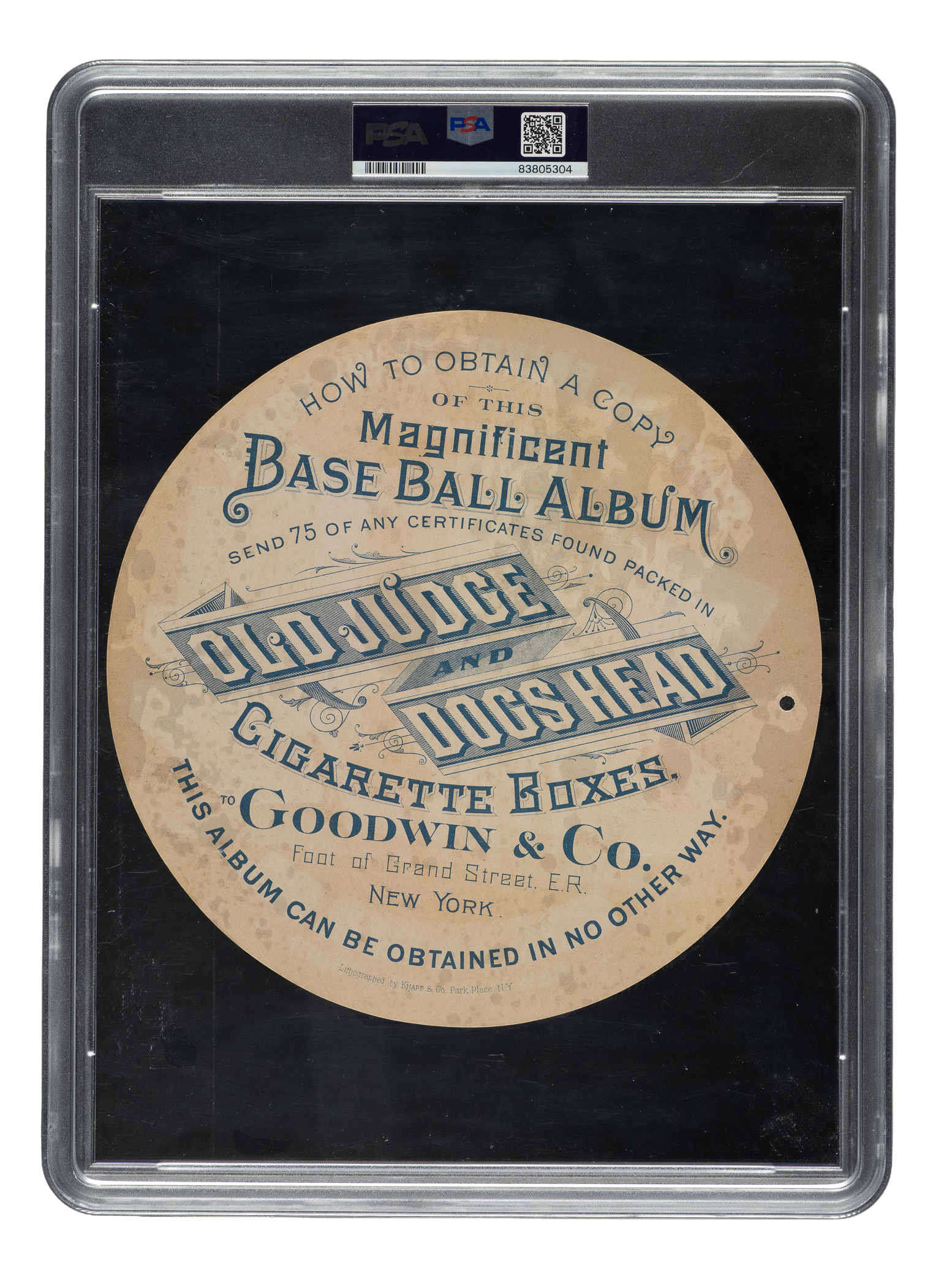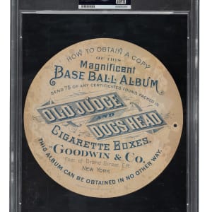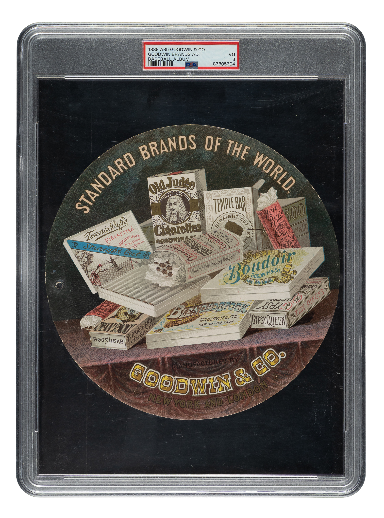 Graded VG 3 by PSA. This is the ONLY example that has ever been graded by PSA (or SGC)! Presented is a single album page from the 1889 Goodwin "Round Album" series. The page features advertising for Goodwin & Company on both the front and back. The page presents with vibrant colors. The piece has minor wear visible along the edges and light toning on the reverse. A very attractive example from the extremely desirable "Round Album" series. Diameter: 8.25 inches.