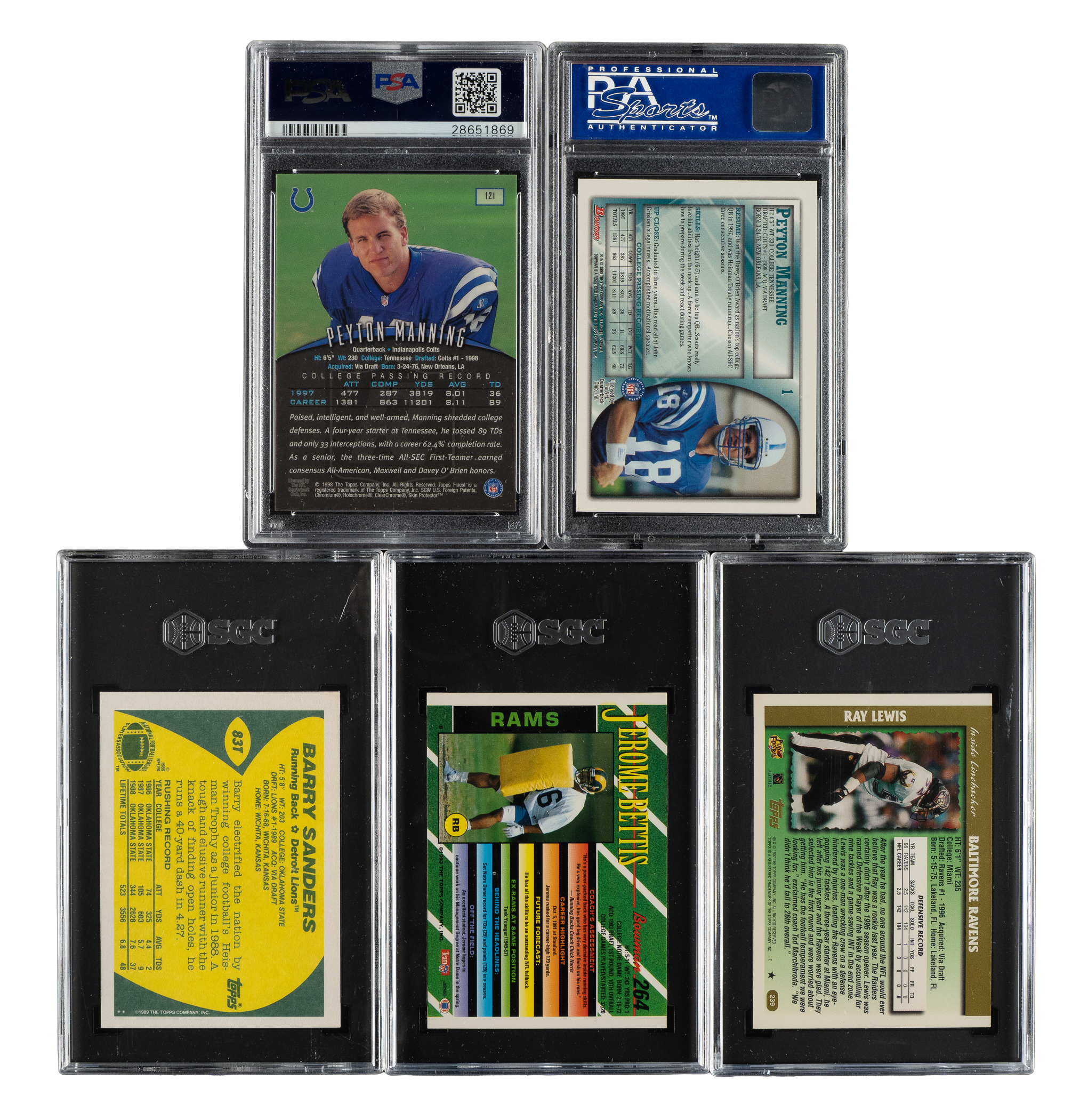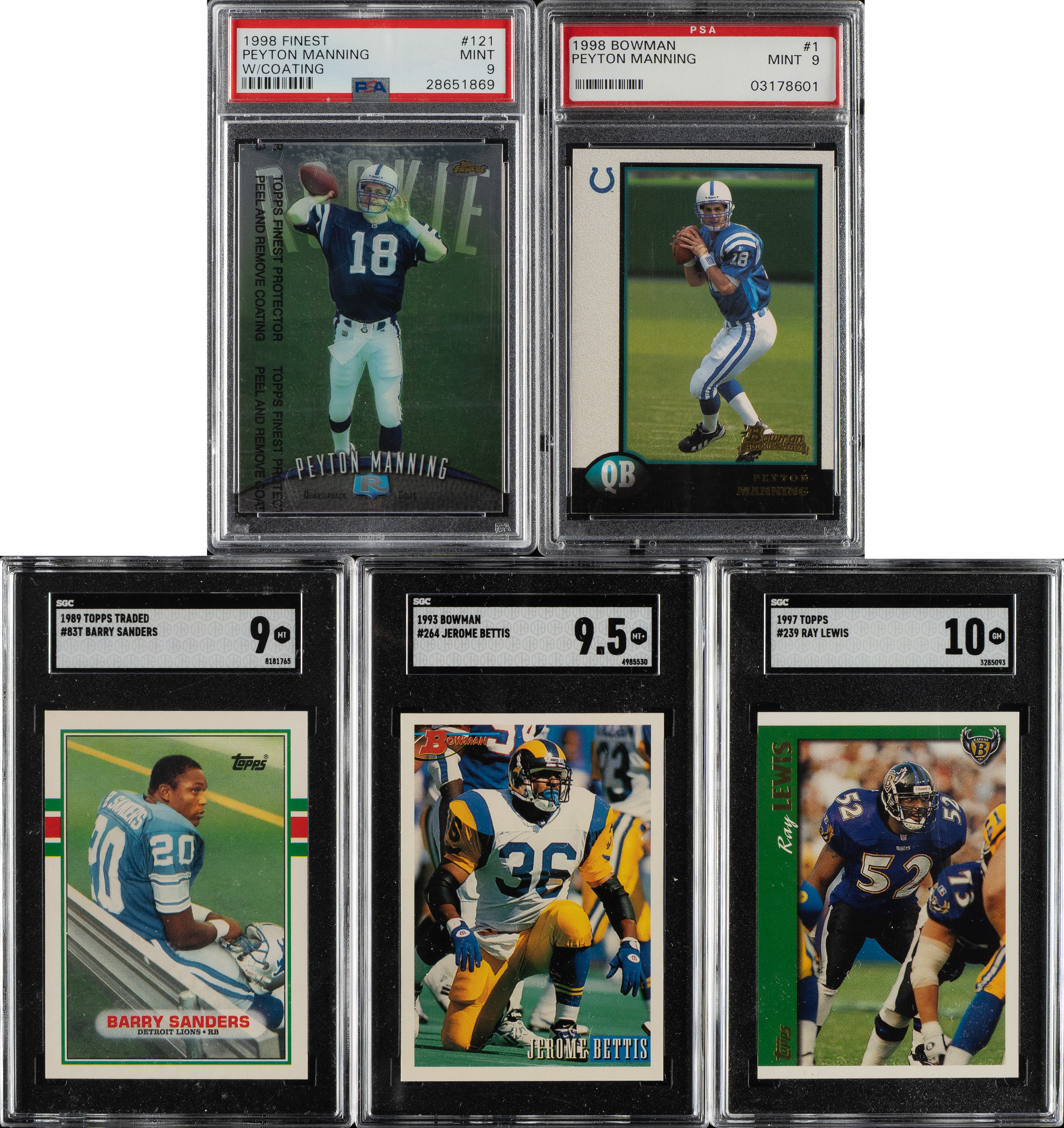Collection of five 1989 to 1998 Topps and Bowman football Hall of Fame cards, featuring Detroit Lion and Indianapolis Colts football Hall of Famers Barry Sanders and Peyton Manning. Each card has been graded and encapsulated by PSA (2) or SGC (3). This collection consists of the following: 1) 1989 Topps Traded (1 card): #83T Sanders RC (MINT 9). 2) 1993 Bowman (1 card): #264 Bettis RC (MINT+ 9.5). 3) 1997 Topps (1 card): #239 Lewis (GEM MINT 10). 4) 1998 Topps Finest (1 card): #121 Manning/with coating RC (PSA MINT 9). 5) 1998 Bowman (1 card): #1 Manning RC (PSA MINT 9). Total: 5 cards.