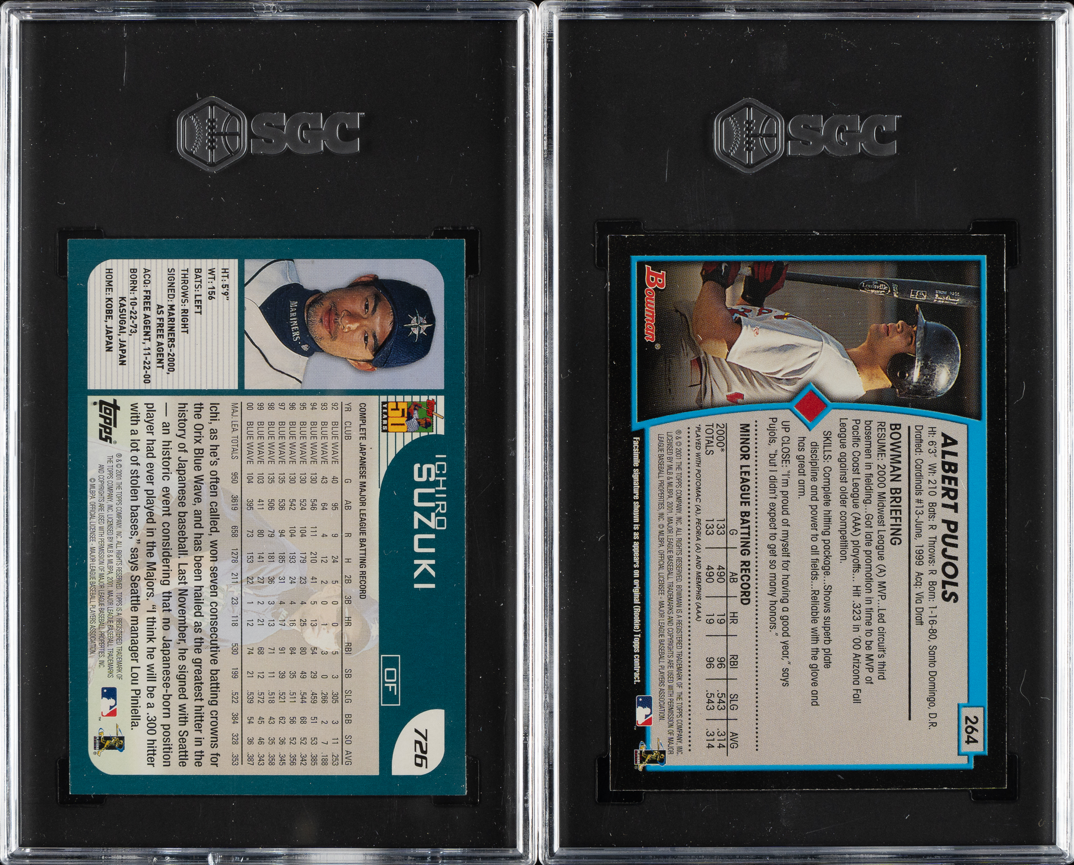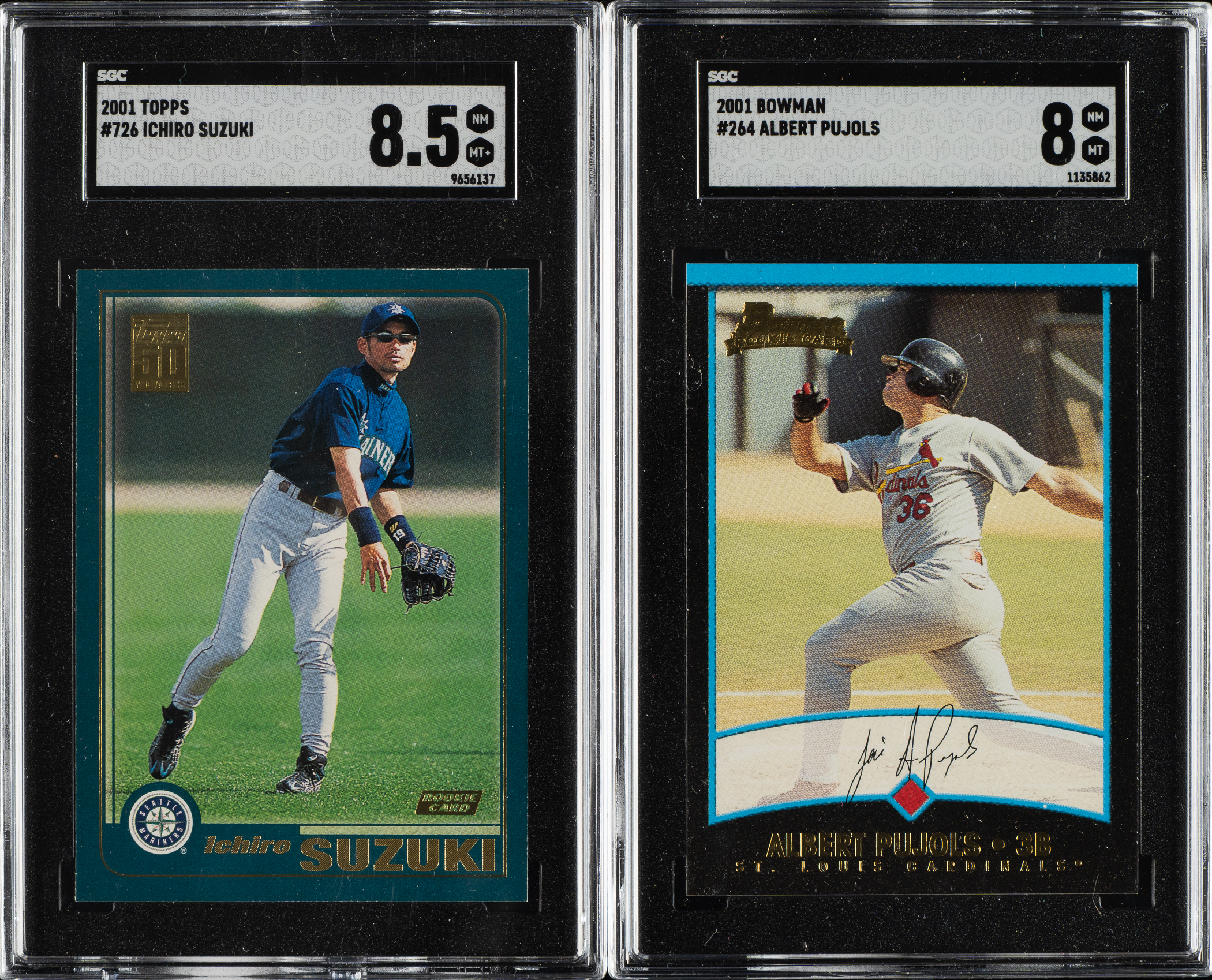 Pair of 2001 Topps and Bowman cards, featuring Seattle Mariners Hall of Famer Ichiro Suzuki. Both cards have been graded and encapsulated by SGC. This pair consists of the following: 1) 2001 Topps #726 Ichiro Suzuki Rookie (NM/MT+ 8.5). 2) 2001 Bowman #264 Albert Pujols Rookie (NM/MT 8). Total: 2 cards.