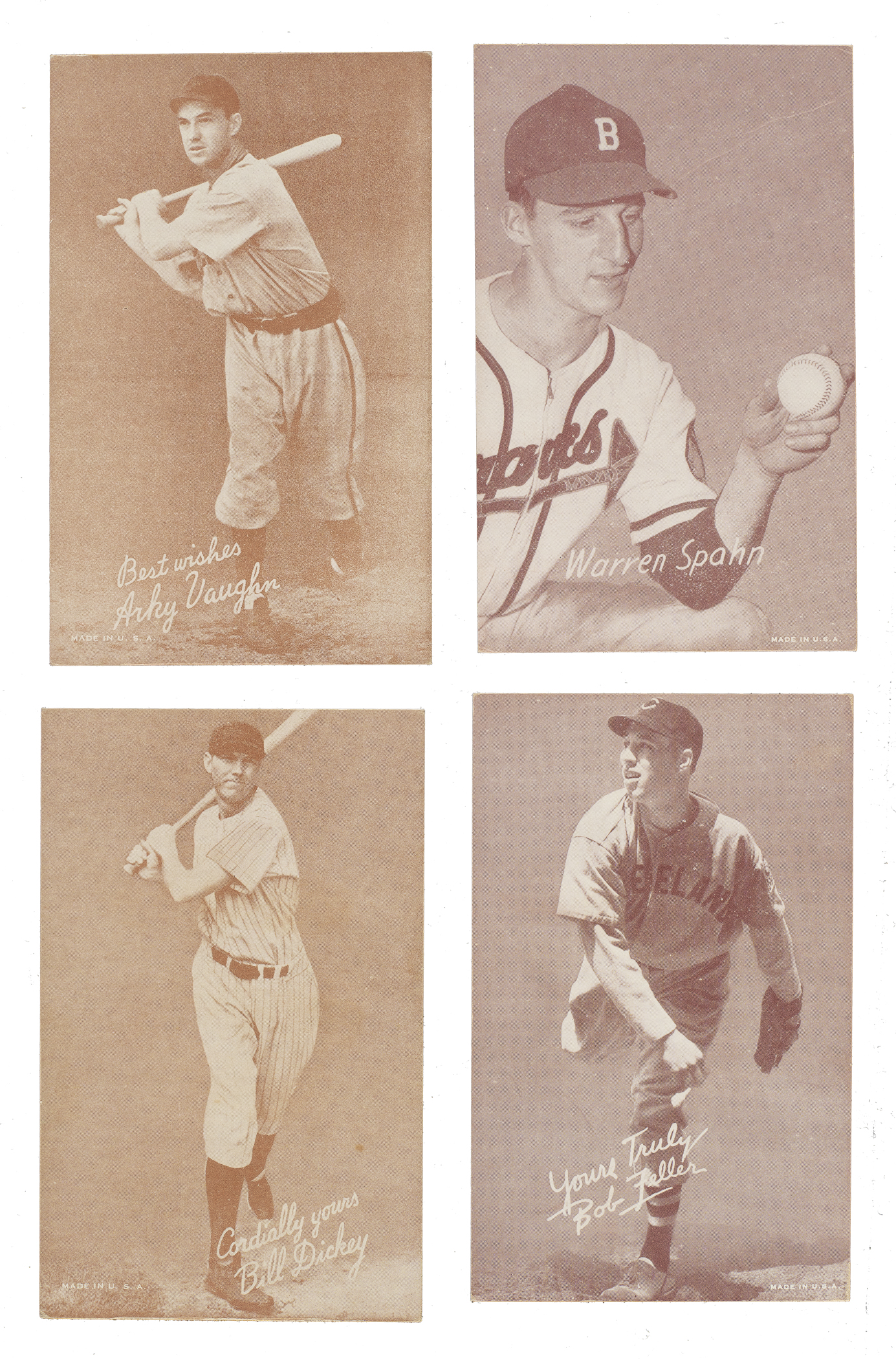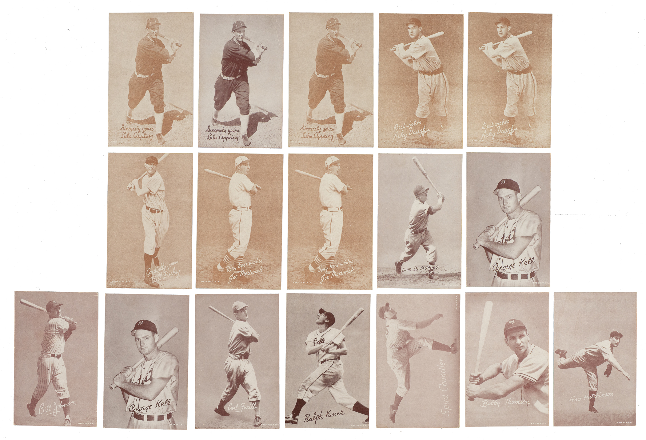 Presented is a substantial collection of fifty Exhibits cards from two different series, spanning the years 1939 to 1966 and highlighted by eleven Hall of Famers, including Bill Dickey, Bob Feller, and Warren Spahn. Exhibits cards were traditionally sold for one penny each from vending machines placed at arcades and amusement parks for more than four decades (from 1921 to the 1960s). This collection consists of the following: 1) 1939-1946 W462 Salutation Exhibits (26 cards): Condition ranges from Gd to Ex (averaging Vg+), with a few lesser. Includes: Two Appling/left corner (Ex and Fr-Gd), Appling/right corner (Gd+), Boudreau (Vg-Ex), two Clift, two Dickey/left corner (Ex and Vg), Feller/pitching (Vg+), two Heath/large, Higbe, Keltner, Kuhel, May, McCormick/left corner, McCormick/right corner, McQuinn/left corner, two Medwick (Ex and Pr-Fr), Louis Buck Newsom, Pollet/left corner, three Vaughn (Vg-Ex and two Vg), and Walker/D on cap. 2) 1947-1966 Exhibits (24 cards): Condition is Vg to Vg-Ex overall, with a couple lesser and a couple Ex. Includes: Chandler (Fr), W. Cooper, D. DiMaggio (Vg), Edwards, Ennis, Evers, Furillo (Vg+), two Galan, Hutchinson (Vg-Ex), B. Johnson (Vg), two Kell (Ex and Vg-Ex), Kiner (Vg), Kolloway, two Lowery, Spahn/"B" on cap (Gd+), Stephens/batting, Thomson (Vg-Ex+), Torgeson/Braves uniform, Verban, Vernon/throwing, and Wright. Total: 50 cards. The size/weight of this item requires that there will be an additional shipping charge for this lot.