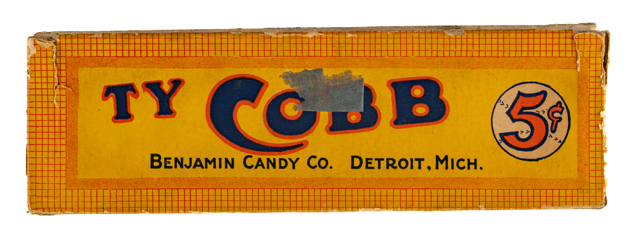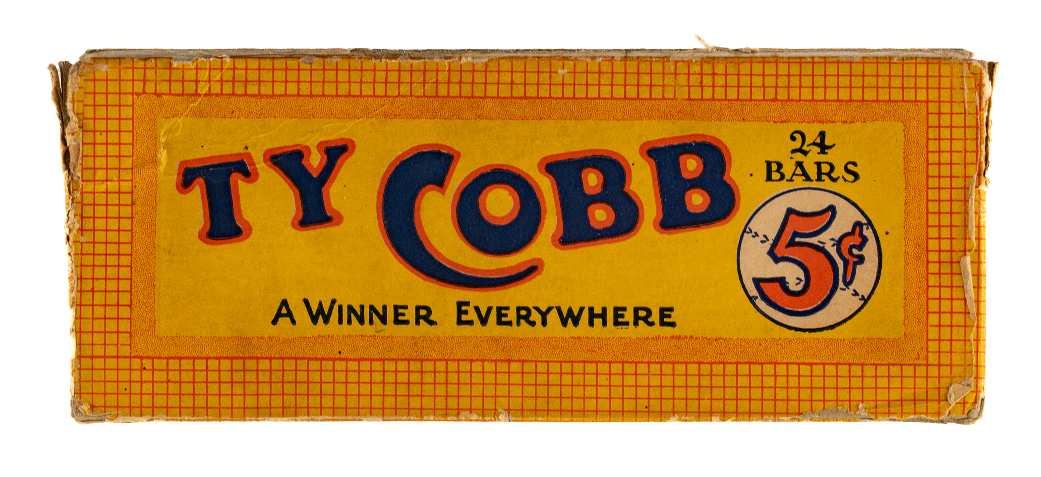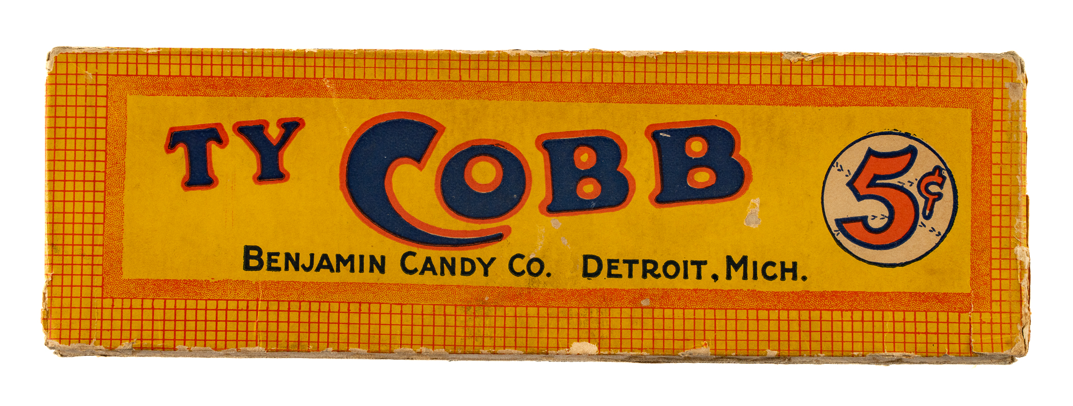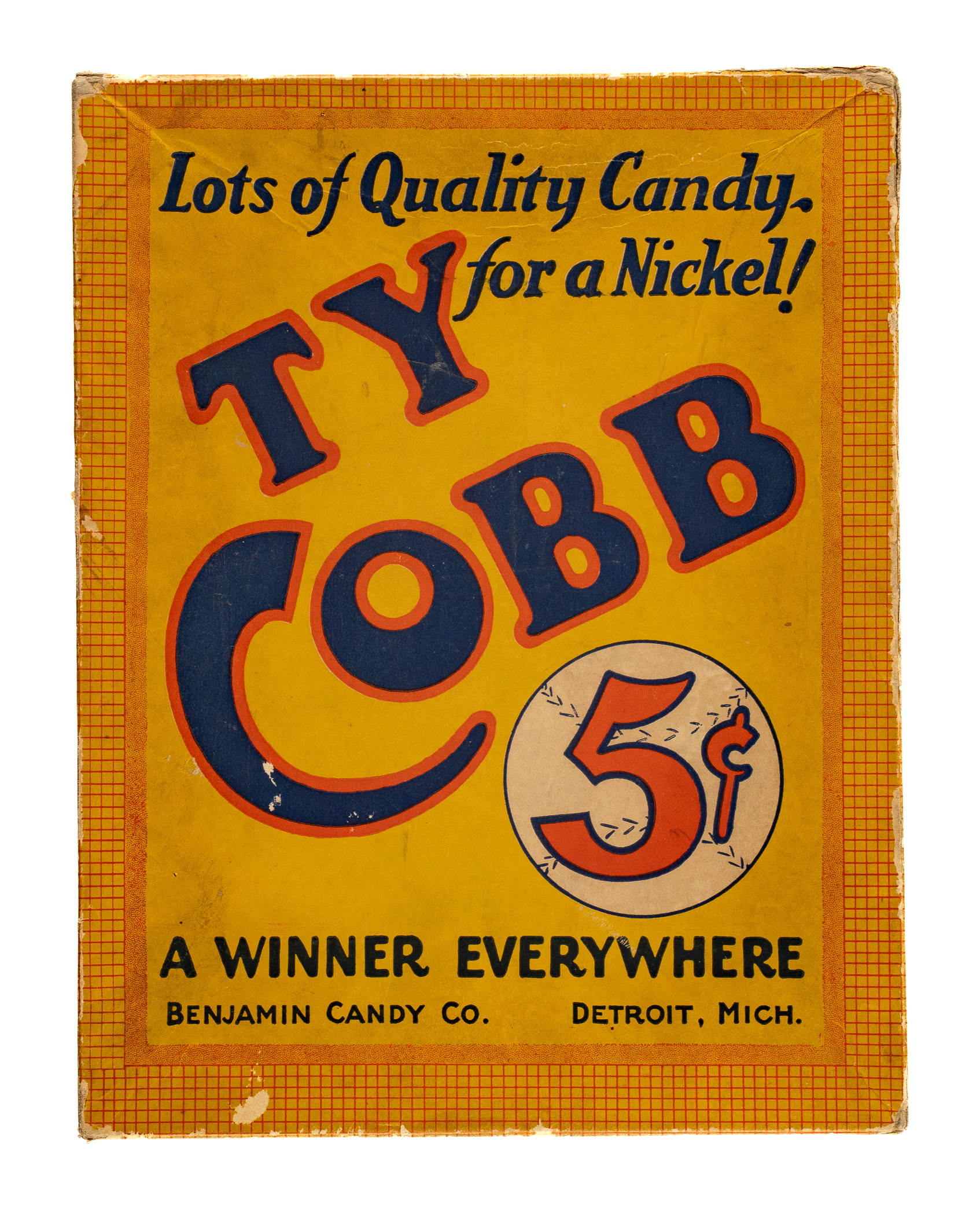 Presented is a Ty Cobb 24-count candy box dating from the 1920s. Almost all material relating to Ty Cobb's own brand of candy is scarce. This is the first example of the box we have offered in the past 22 years. The lid features the text reading "Lots of Quality Candy - for a Nickel! - Ty Cobb." The candy's slogan, "A Winner Everywhere" is printed along the base. Also noted on the lid and side panels is the name of the manufacturer: "Benjamin Candy Co. - Detroit, Mich." The box (6-7/8 x 9 x 2-3/4 inches) displays wear commensurate with its age and former use. The lid has a slight split along two flap seams. A number of small stains and abrasions are evident throughout. The bottom tray portion of the box has two pieces of gray tape on the bottom panel. A very attractive example of this seldom seen baseball confectionary box.