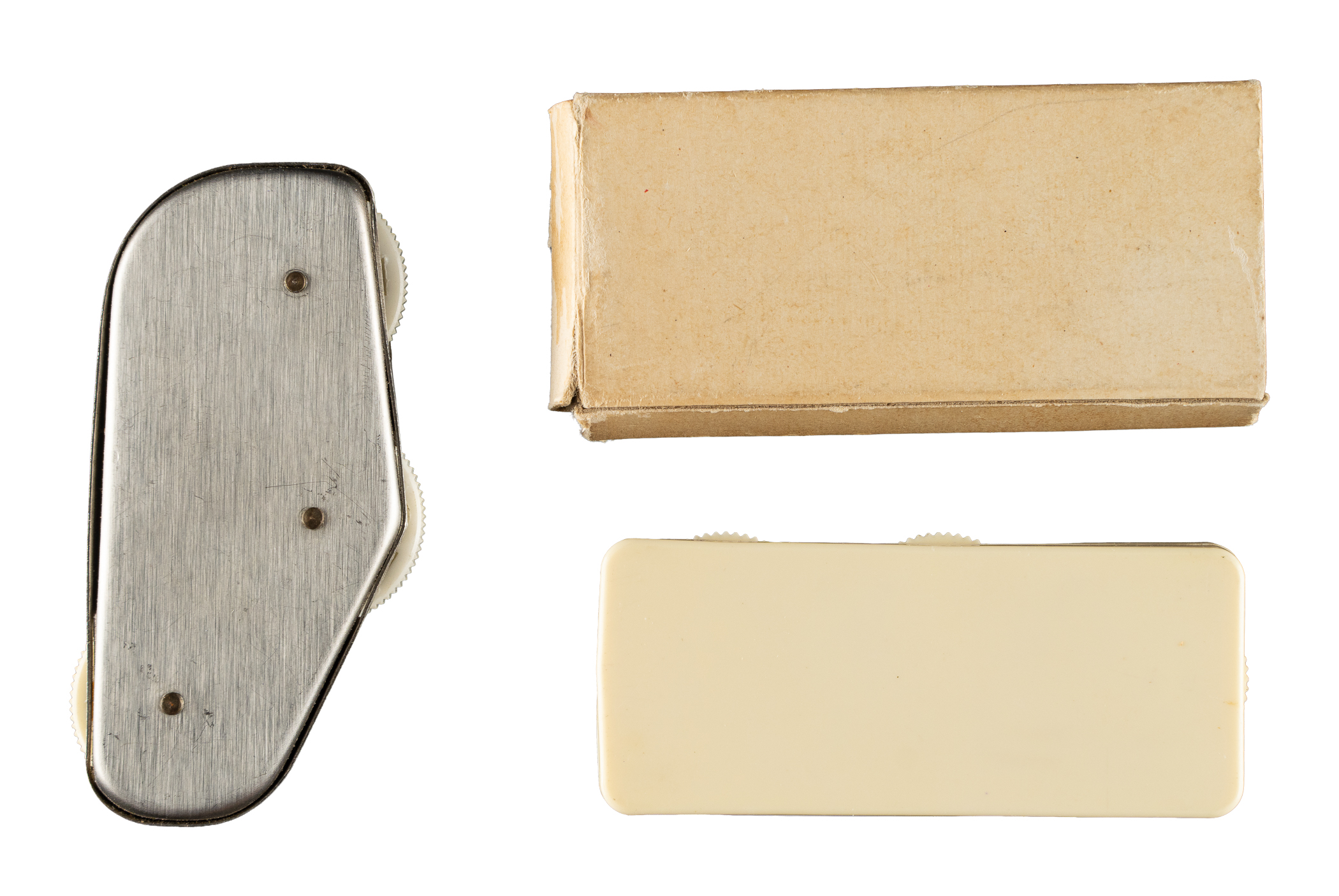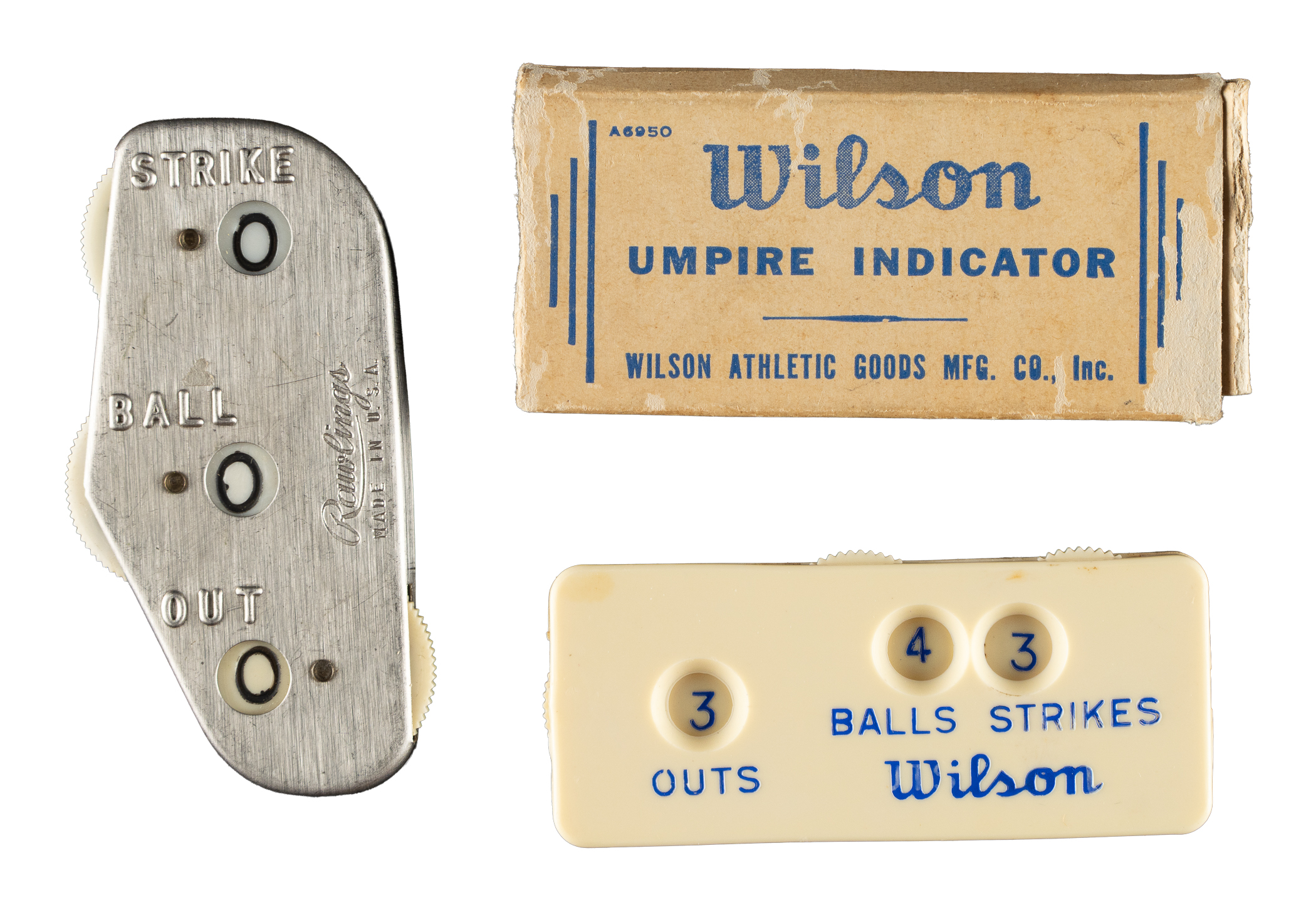 Pair of vintage baseball scorers, one produced by Wilson and the other by Rawlings. The offered scorers keep track of the balls, strikes, and outs. Both scorers are in working order with moderate wear from age and normal use. Please note that while the Wilson scorer is accompanied by a box, we cannot confirm whether it's the original one. Total: 3 items (2 scorers and 1 box).