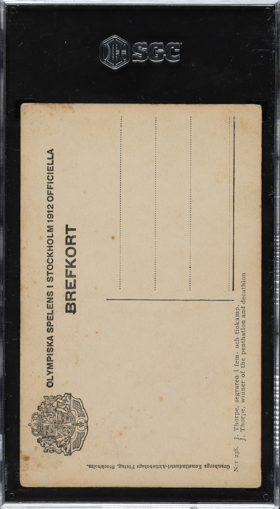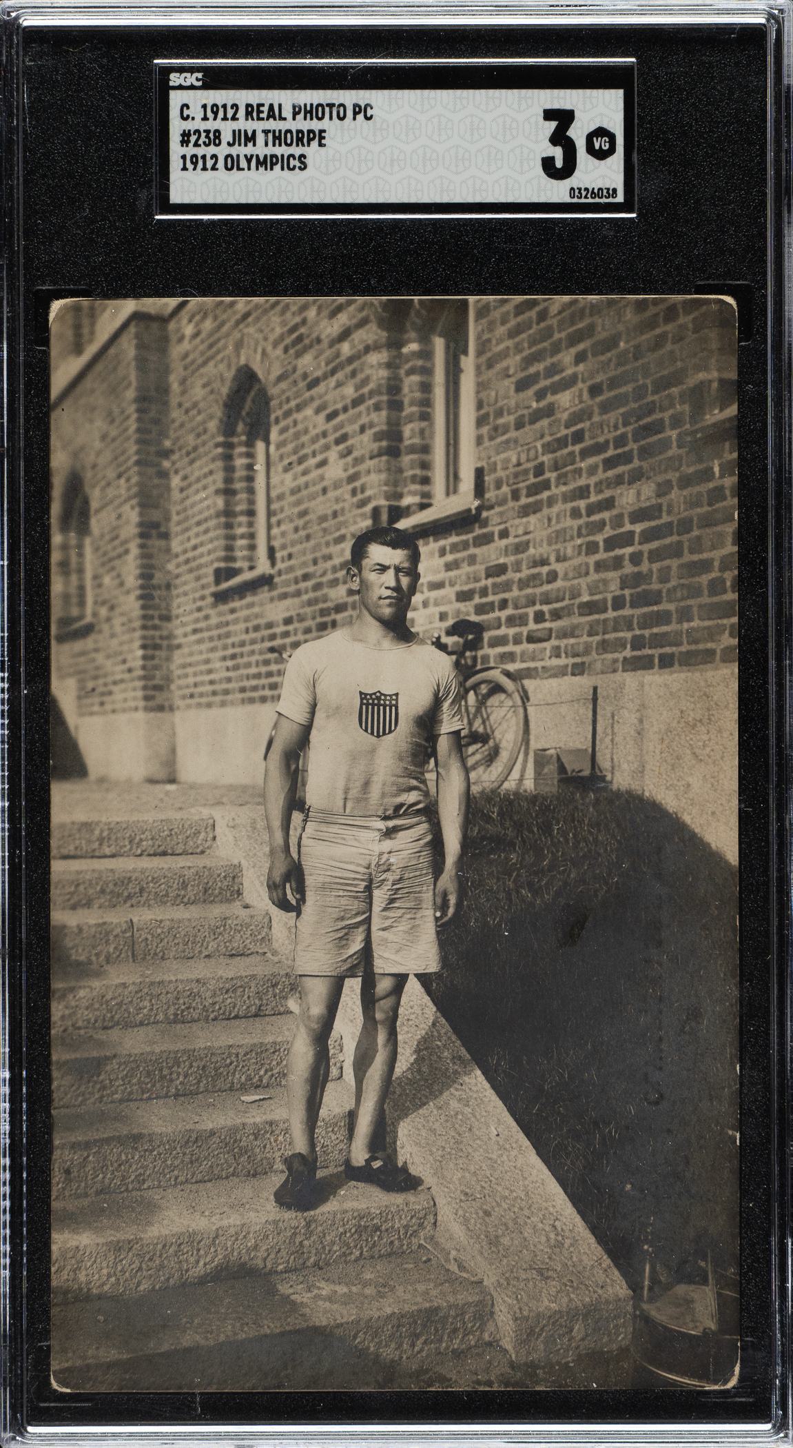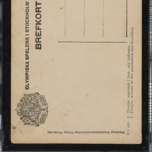 Graded VG 3 by SGC. Extremely desirable real-photo postcard issued in commemoration of Jim Thorpe's accomplishments at the 1912 Olympic Games. The photo features Thorpe in his track uniform standing on the steps during the 1912 Summer Olympics held in Stockholm, Sweden. The text on the reverse is printed in Swedish. The postcard (5.5 x 3.5 inches), which has not been addressed or mailed, displays a crystal-clear image, moderate corner wear, and scattered foxing on the reverse.