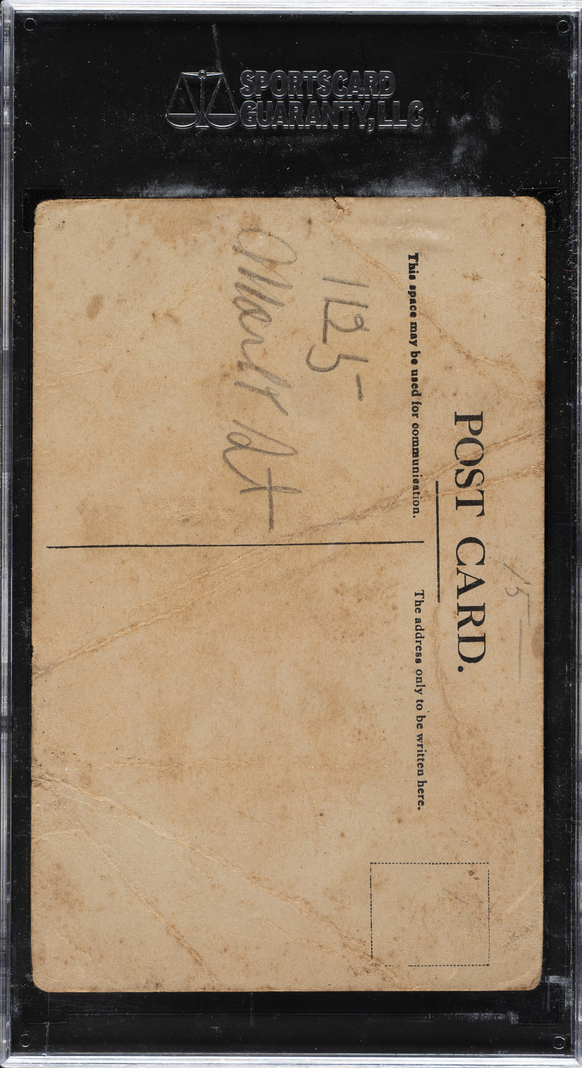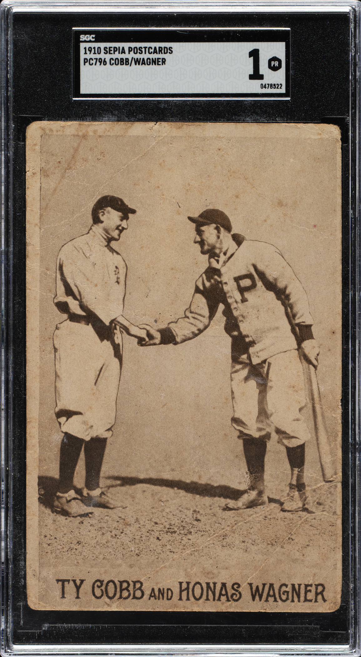 Modestly graded example of one of the key cards from this rare and popular 25-card sepia-toned postcard set, featuring Ty Cobb shaking hands with Honus Wagner during the 1909 World Series. This image is widely recognized as being one of the most classic to ever appear on a baseball card. Graded POOR 1 by SGC (submitted by REA) mostly due to multiple creases and excessive toning front and back. The card has never been mailed and has two penciled notations ("125 Markt St" and the number "15-") on its traditional postcard reverse. Very presentable low-grade example featuring two of the era's most legendary stars, from one of the rarest and most popular of all postcard issues. Dimensions: 3.5 x 5.5 inches.