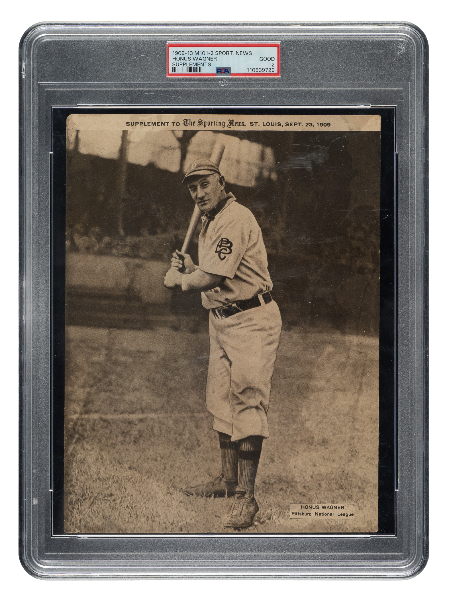 Graded GOOD 2 by PSA. This is the ONLY example graded at this level by PSA with just two higher. Rarely offered example of an M101-2 Sporting News supplement featuring legendary Pittsburgh Pirates Hall of Famer Honus Wagner. This sepia-toned premium set was issued with the Sporting News between the years 1909 and 1913. Each premium was issued on only a single day (September 23, 1909 in this case) and is dated in the upper right or left. Their method of issue and the thin paper stock on which they are printed make these unusual and striking premiums particularly susceptible to damage, but the offered example possesses exceptional eye appeal despite the assigned grade, with strong corners and intact edges. This example has a flawless image of Wagner in a batting stance, scattered creasing (more prominent on the reverse), and a small tear on the bottom edge. This is a very attractive example that represents a relatively affordable opportunity to acquire a card-related Wagner supplement dating from his playing days. Dimensions: approximately 7-3/8 x 9-7/8 inches.