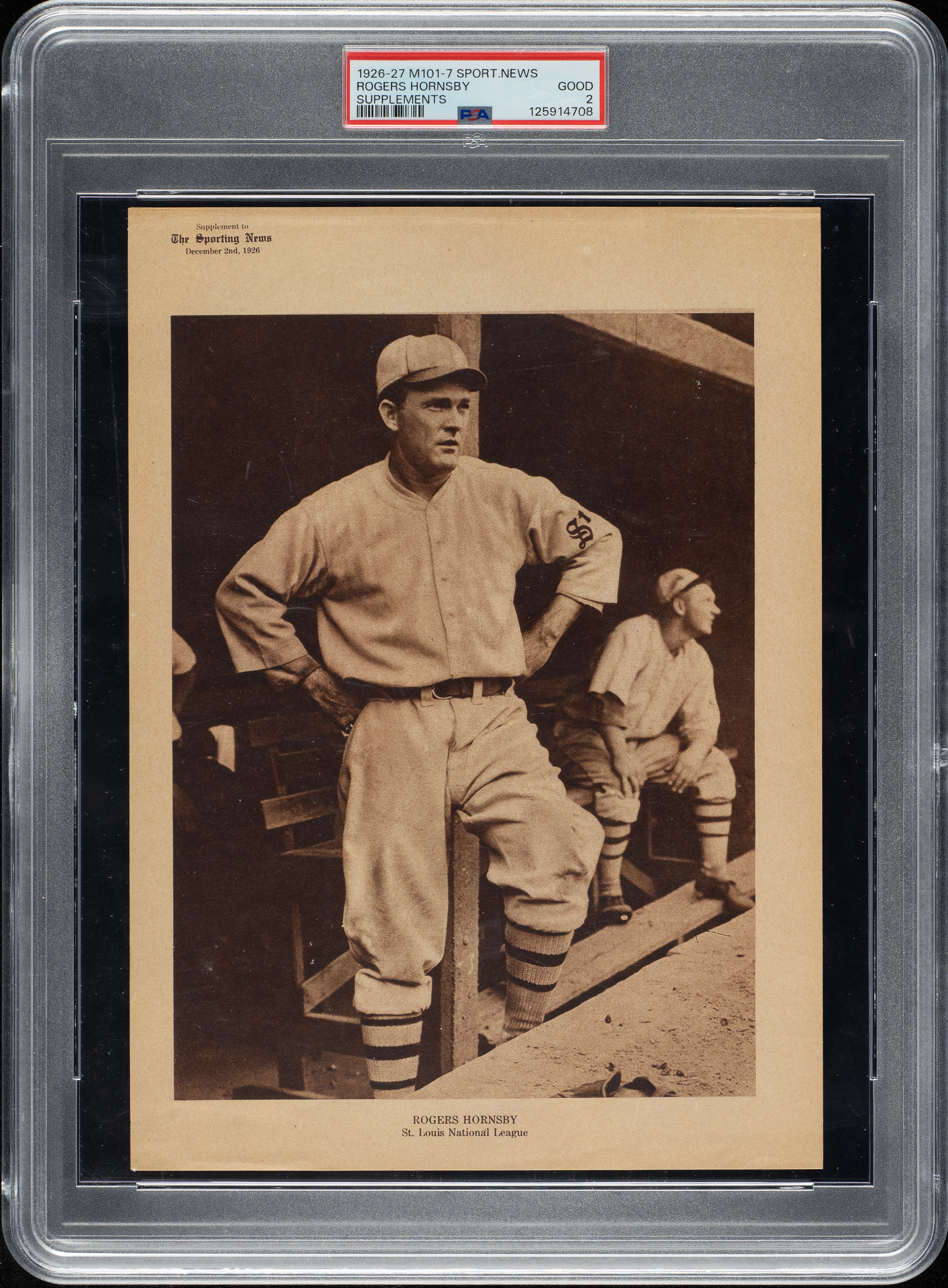 Graded GOOD 2 by PSA. One of only two examples graded at this level by PSA with none higher! Extremely desirable example of Rogers Hornsby from the 1926 M101-7 Sporting News Supplements series. These large (7 x 10 inches) sepia-toned player photos were issued as a weekly supplement by The Sporting News. The premium is printed on thin stock and depicts Hornsby standing at the edge of the dugout with his hands on his hip. The fragile paper stock of this issue makes high-grade examples extremely rare, and flaws such as light wrinkling, creasing, or tearing "come with the territory." The offered example is bright and crisp with a flawless image. Downgraded due to light, unobtrusive creasing. A very attractive 1920s premium featuring this popular Hall of Famer.