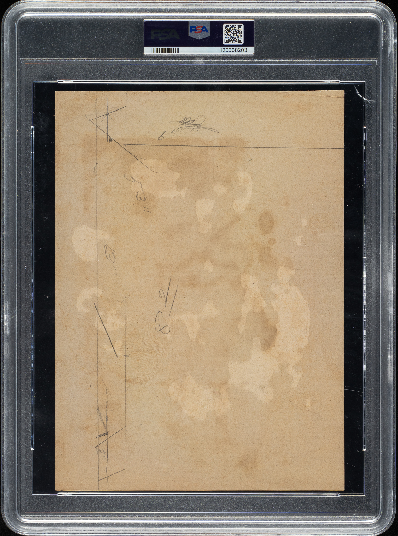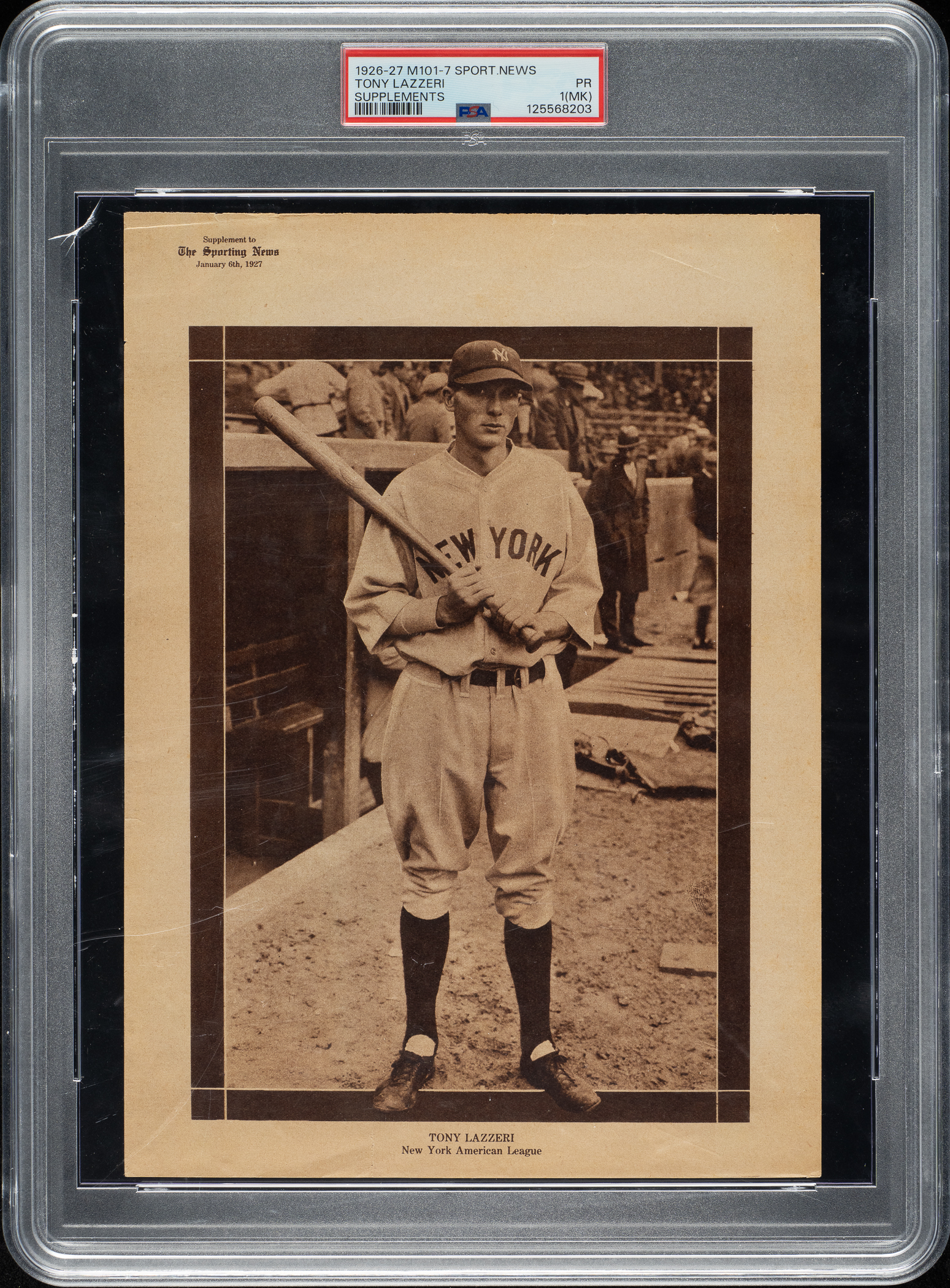 Extremely desirable example of Tony Lazzerifrom the 1926 M101-7 Sporting News Supplements series. These large (7 x 10 inches) sepia-toned player photos were issued as a weekly supplement by The Sporting News. The premium is printed on thin stock and depicts Lazzeri standing outside of the dugout holding his bat. The fragile paper stock of this issue makes high-grade examples extremely rare, and flaws such as light wrinkling, creasing, or tearing "come with the territory." The offered example is bright and crisp with a flawless image. Graded POOR 1 (MK) by PSA due to scattered creasing and writing on the reverse (hence the qualifier). A very presentable 1920s premium featuring this popular Hall of Famer.