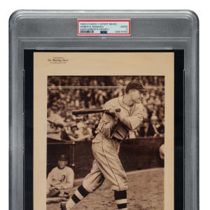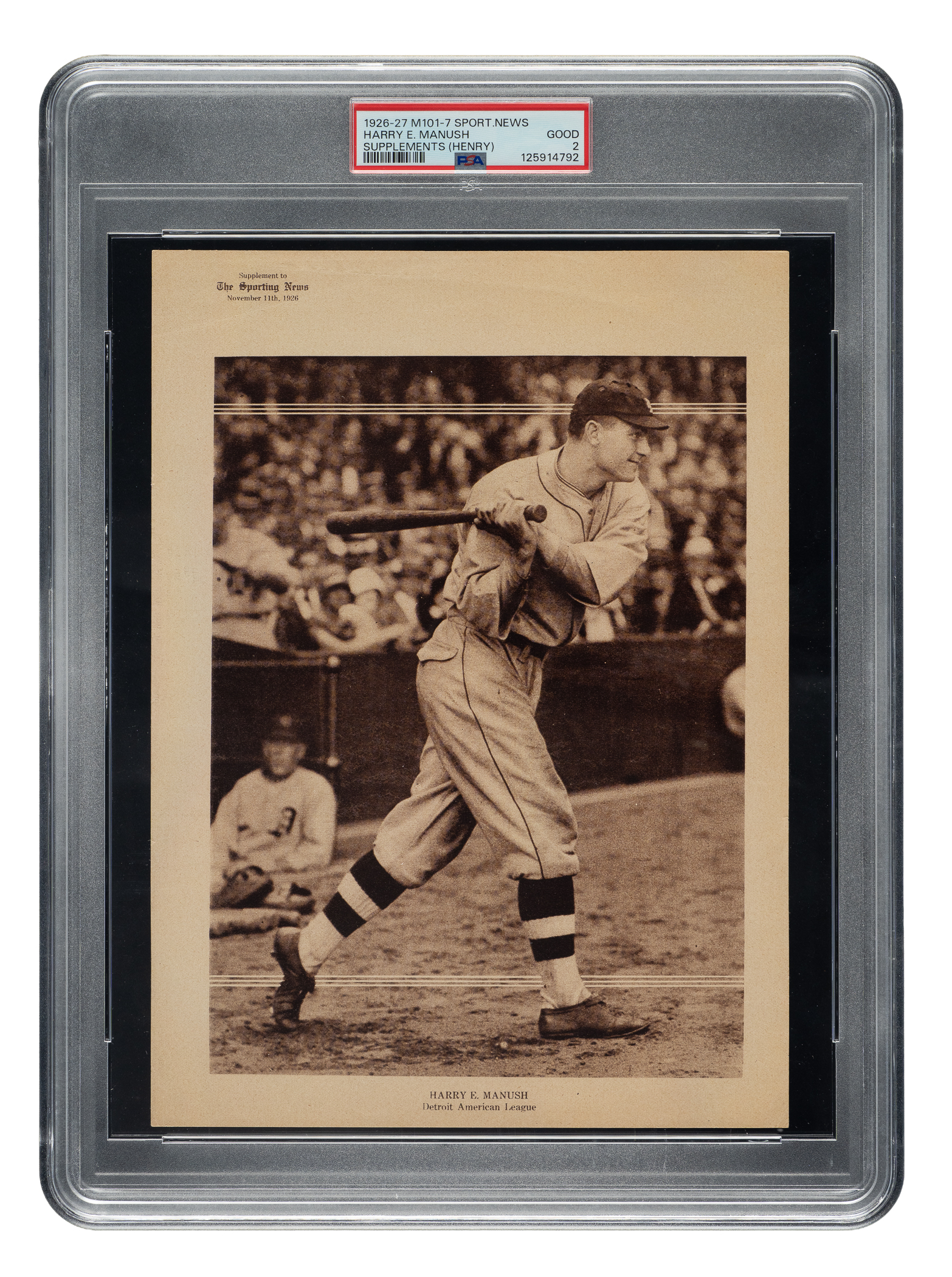 Graded GOOD 2 by PSA. One of only two examples graded at this level by PSA with just one higher. Extremely desirable example of Heinie Manush from the 1926 M101-7 Sporting News Supplements series. These large (7 x 10 inches) sepia-toned player photos were issued as a weekly supplement by The Sporting News. The premium is printed on thin stock and depicts Manush in a swing-through pose. The fragile paper stock of this issue makes high-grade examples extremely rare, and flaws such as light wrinkling, creasing, or tearing "come with the territory." The offered example is bright and crisp with a flawless image. Downgraded due to light, unobtrusive creasing. A very attractive 1920s premium featuring this Detroit Tigers Hall of Famer.