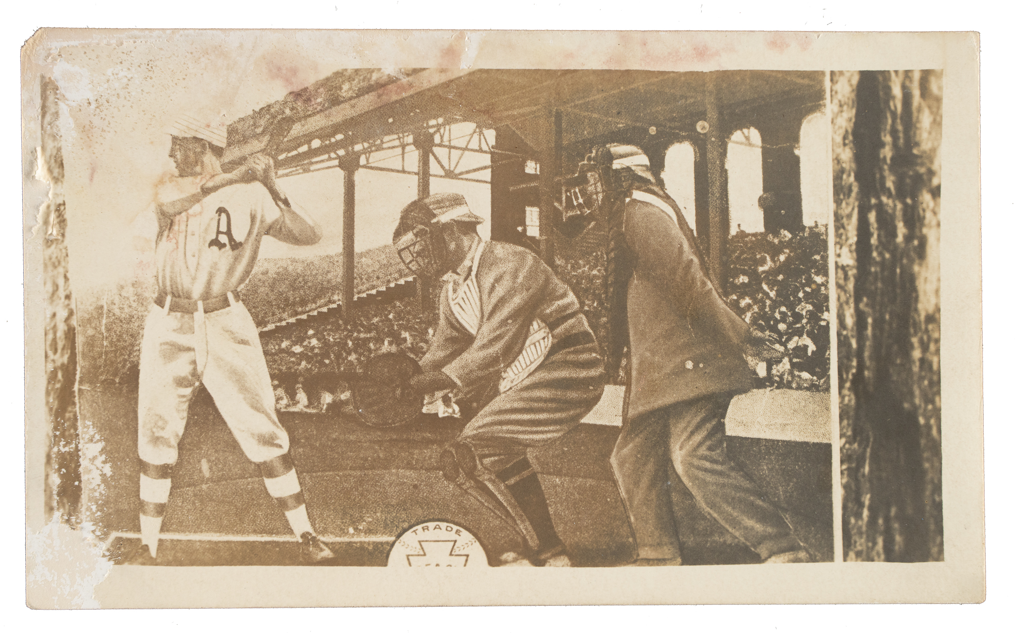 Circa 1912 Reach postcard featuring Philadelphia Athletics Hall of Famer Eddie Collins. This fascinating real-photo postcard pictures Collins at bat with the grandstands in the background. The Reach logo is partially visible along the base. This is the first example of this particular postcard that we have ever offered! Condition is Pr.