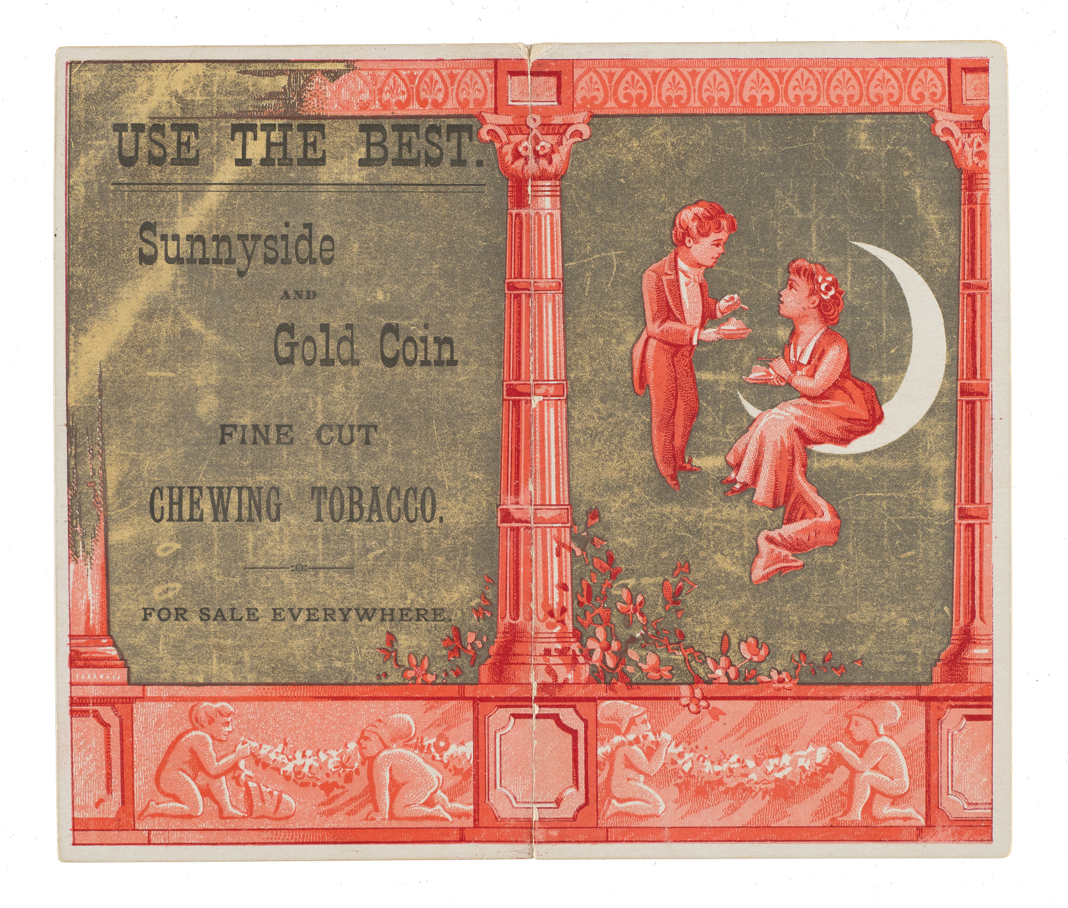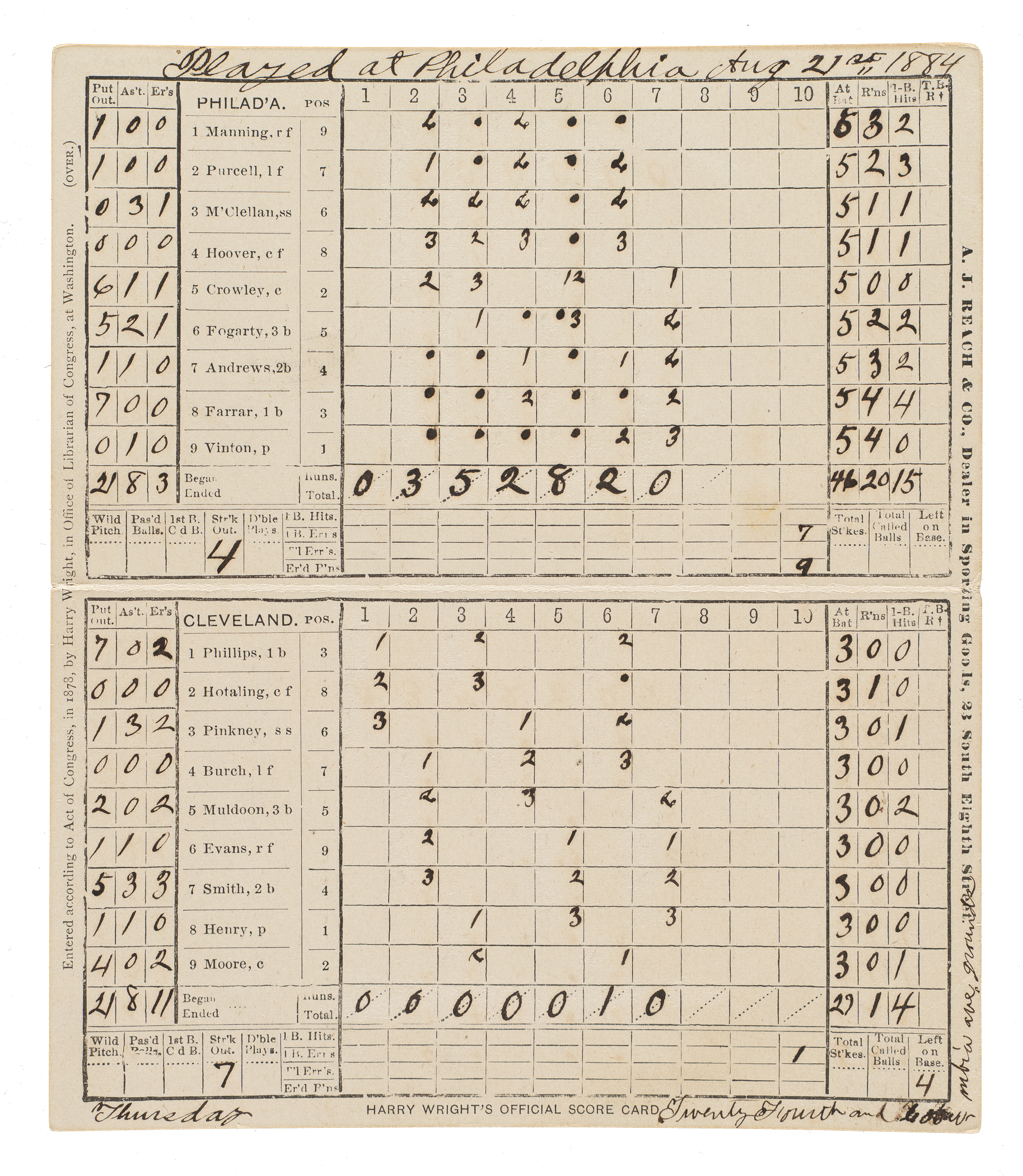 This fold-over scorecard, issued for an 1884 National League game between the Philadelphia Phillies and Cleveland Blues at Philadelphia’s Recreation Park, features a colorful image of a romantic scene on the front cover and a tobacco advertisement printed on the back cover. When Harry Wright became Phillies’ manager in 1884, part of his compensation was the club would use his scorecard at games and he would receive, in addition to his salary, a percentage of the fees businesses paid to advertise on the scorecard. The lettering "Harry Wright's Official Score Card" is printed along the base of the interior. The preprinted lineups include Manning, Andrews, Mulvey, Purcell, and Farrar for Philadelphia, and Phillips, Pickney, Muldoon and Moore for Cleveland. Neatly scored in black ink to record a 20-1 Philadelphia win. The location and date, "Played at Philadelphia Aug 21st 1884" are written in black ink along the top of the scoring side and research confirms that this game took place on that date. The scorecard (5-3/4 x 6-3/4 inches, unfolded) displays a light crease and moderate surface wear. In Very Good condition overall.
