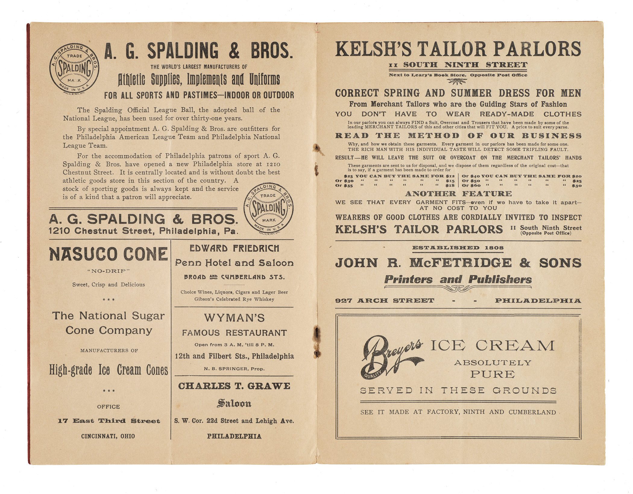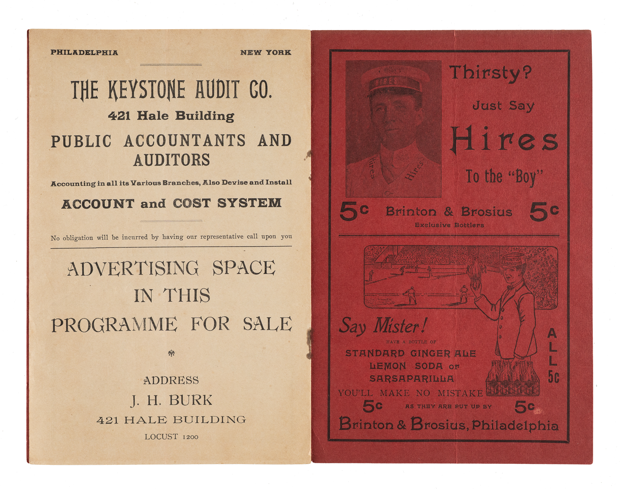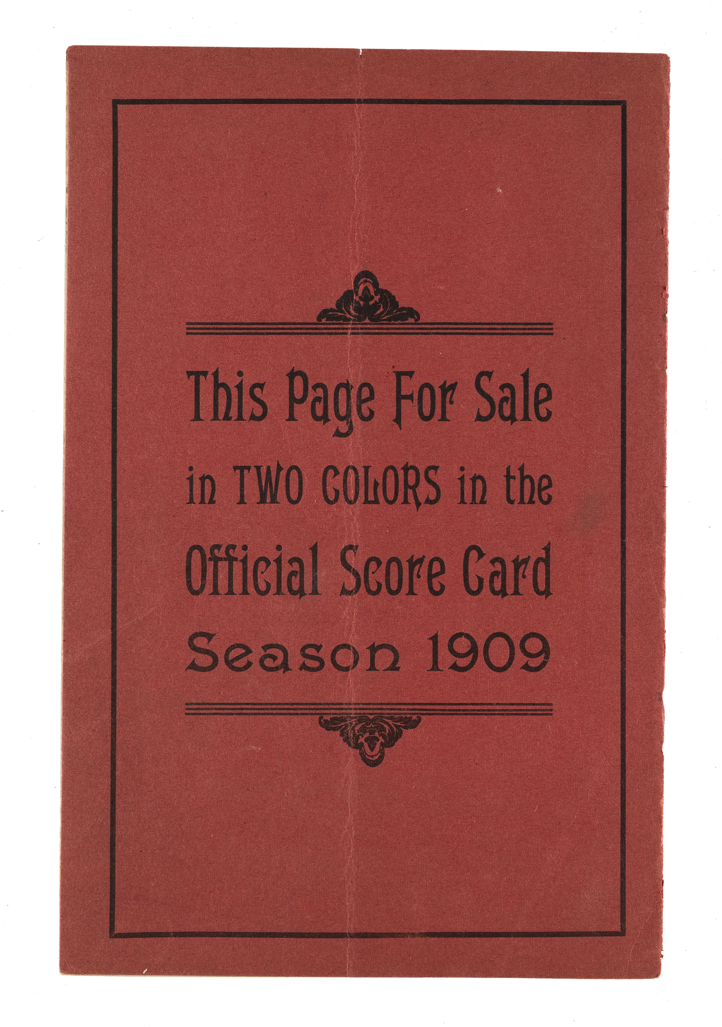 Early Philadelphia Phillies scorecard issued for a game at Philadelphia Ball Park in 1909. The unusual "burnt" orange-color cover features an illustration of a generic ballplayer in a batting stance. The staples were removed at some point and the scoring pages are missing. The remaining interior pages feature advertisements for local Philadelphia businesses. The scorecard (6.75 x 10.5 inches) displays a vertical fold line, along with minor edge and handling wear. In Fair to Good condition overall, but it should be noted that the scorecard displays at a far higher level than that suggested by its technically accurate grade. According to our consignor, an advanced Philadelphia-baseball collector, he states "1909 Phillies’ scorecards are scarce in the collecting world. I’ve never seen another example of this scorecard in 30+ years of collecting."