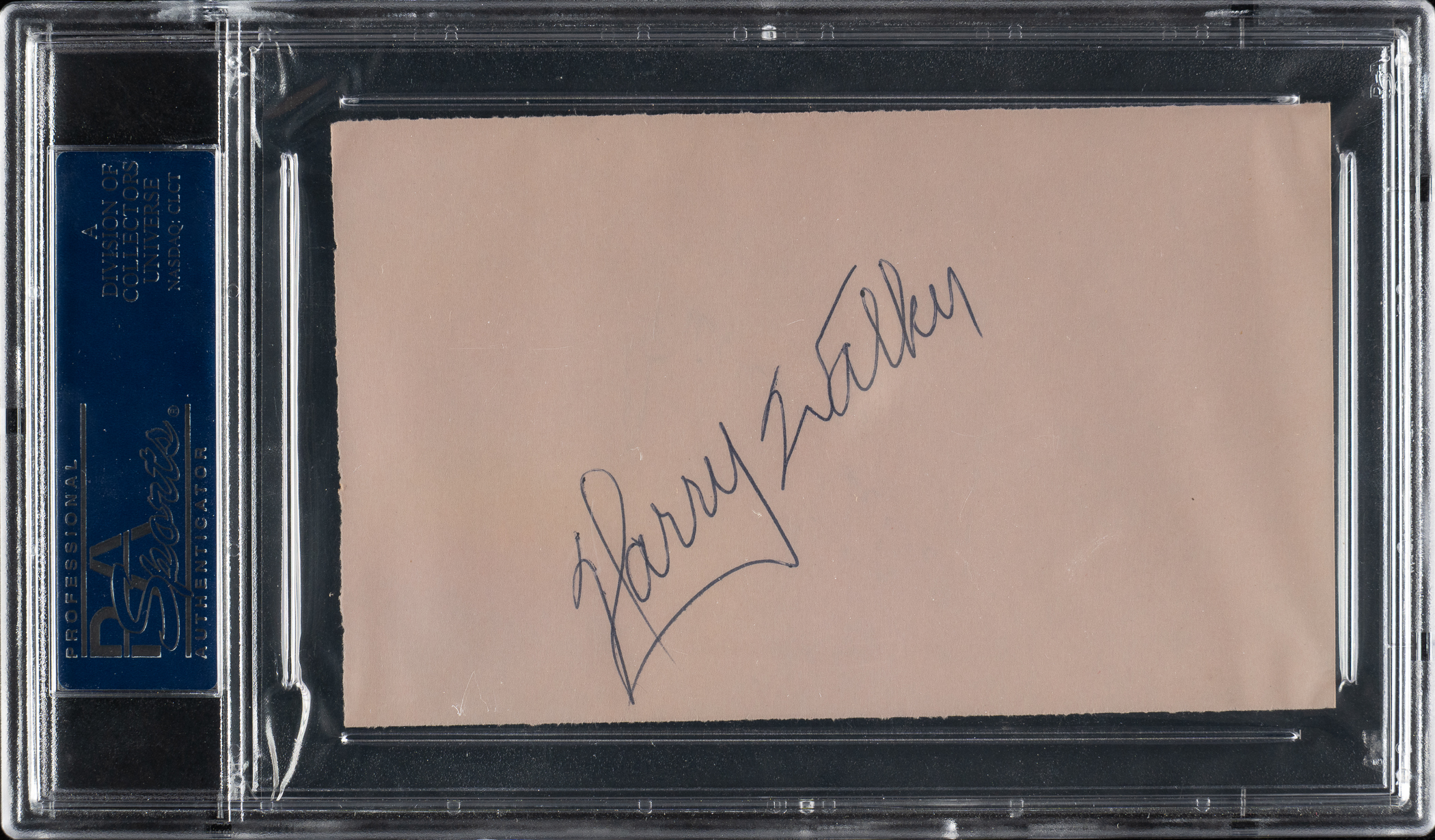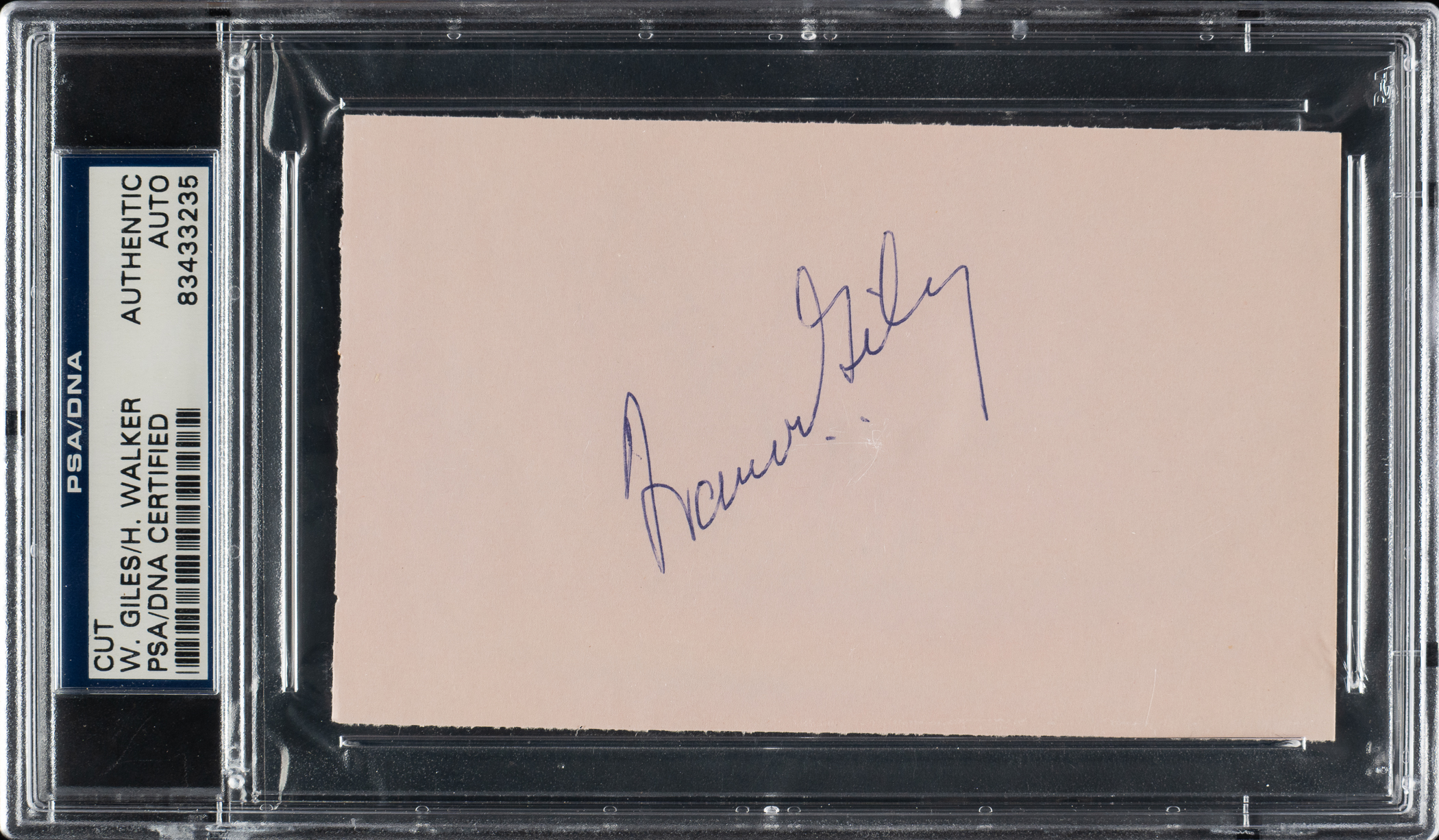 Album page signed in blue ink by Hall of Fame executive Warren Giles and former player and manager Harry Walker. PSA/DNA has encapsulated the page and certified the signatures as "Authentic." The page (5 x 3 inches) is in Excellent condition overall.