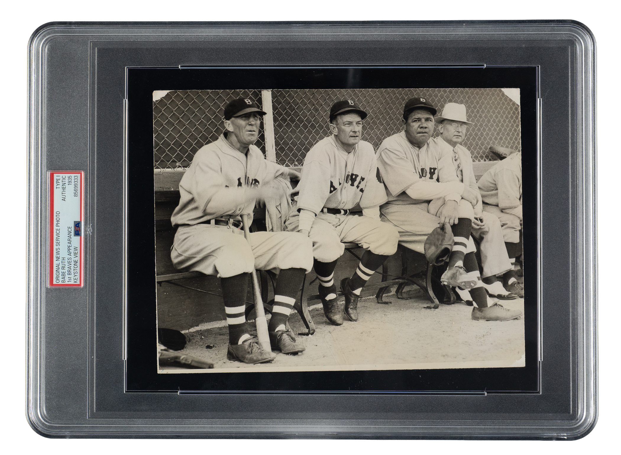 Original news photo of Babe Ruth during his first appearance in a Boston Braves uniform. Encapsulated and certified as an original Type I photograph by PSA/DNA. Ruth is captured sitting next to coach Hank Gowdy and manager Bill McKechnie during a spring training workout. On February 26, 1935, Ruth was given his unconditional release from the New York Yankees so that he could sign on with the Braves in a triple capacity: player, assistant manager, and vice president. Ruth actually had no desire to continue playing at this point. What he wanted, more than anything, was to manage at the Major League level. Ruth quickly realized that his signing was meant as a sideshow, not the springboard to a managerial role he had hoped for, and retired on June 1. The reverse bears a pair of "Keystone View" credit stamps, multiple editorial notations, and the original paper news caption displaying the handwritten date of "3/10/'35." The photo, which has been trimmed to its current dimensions of 6-5/8 x 8-1/2, exhibits surface loss along three corners and is in Good condition overall.