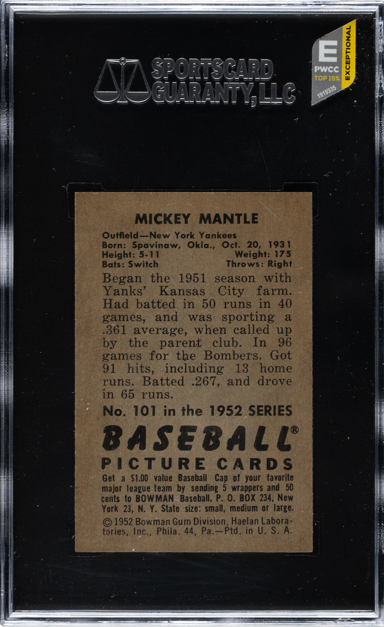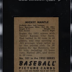 Graded NM+ 7.5 by SGC. Beautiful high-grade example of one of collecting's classic cards, the 1952 Bowman #101 Mickey Mantle. This card has bright colors, a crisp image, and strong corners. Boldly printed reverse. This is a fantastic example of one of New York Yankees Hall of Famer Mickey Mantle's most important cards and one of the most recognizable cards in all of card collecting. Awarded an MBA Silver Diamond by Mike Baker Authenticated for high-end eye appeal. A corresponding MBA sticker is affixed to the front of the holder.
