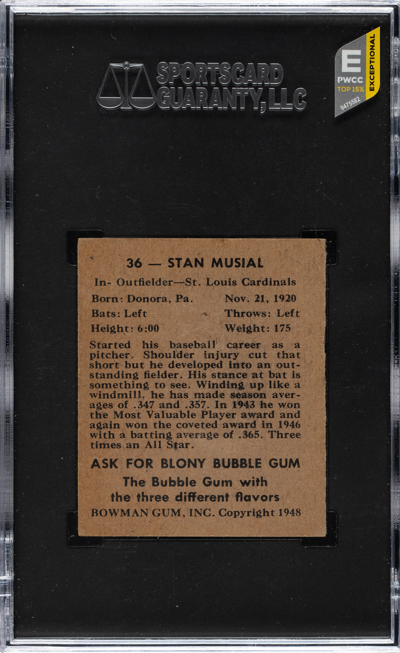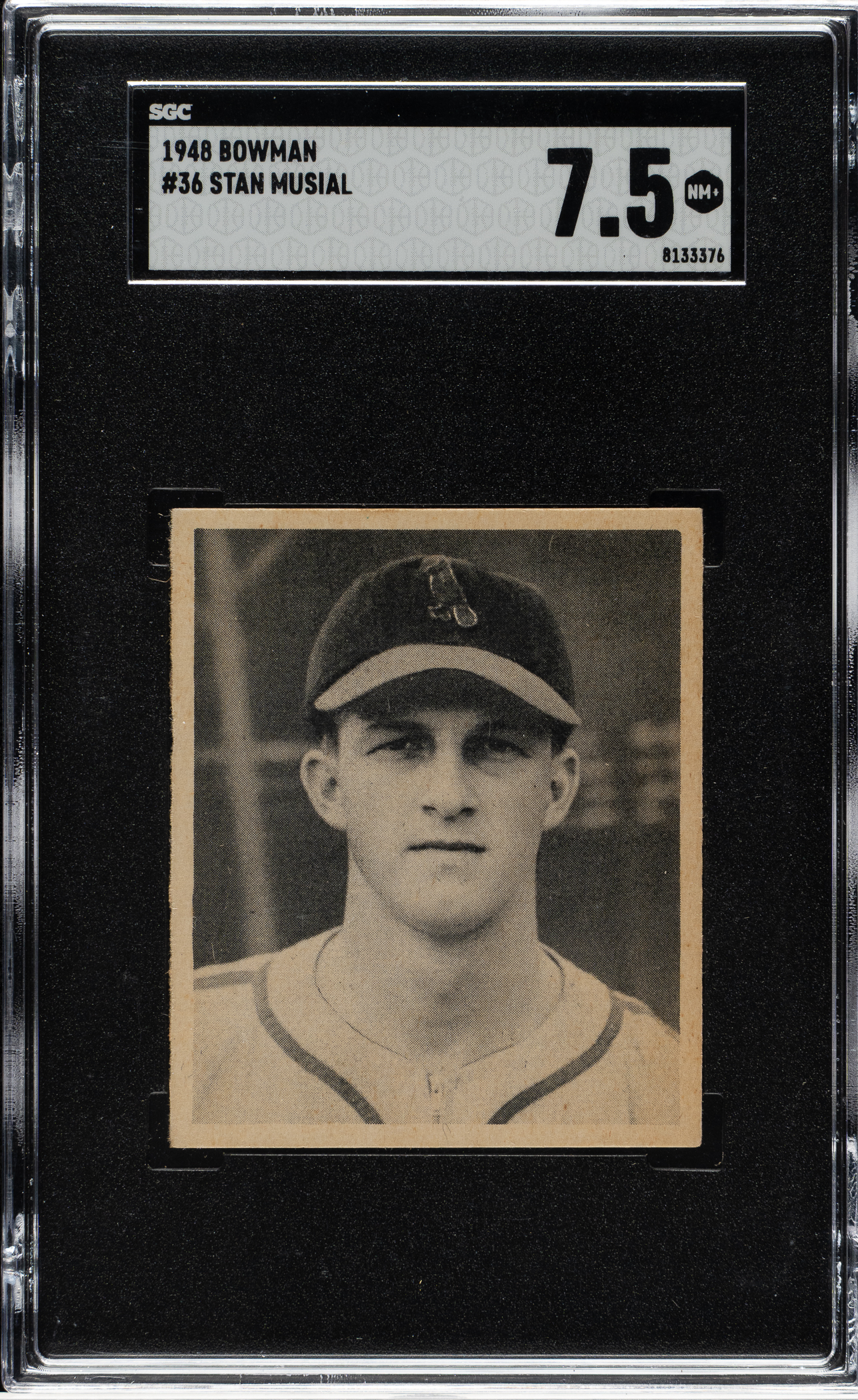 Graded NM+ 7.5 by SGC. Extremely attractive high-grade example of St. Louis Cardinals Hall of Famer Stan Musial's rookie card, one of the most important cards of the era and the key card of Bowman's first baseball-card set. The offered card features outstanding image clarity, impressive centering, and strong corners. Clean reverse with bold black print. A fantastic high-grade example of Hall of Famer Stan Musial's rookie card from the classic 1948 Bowman set.