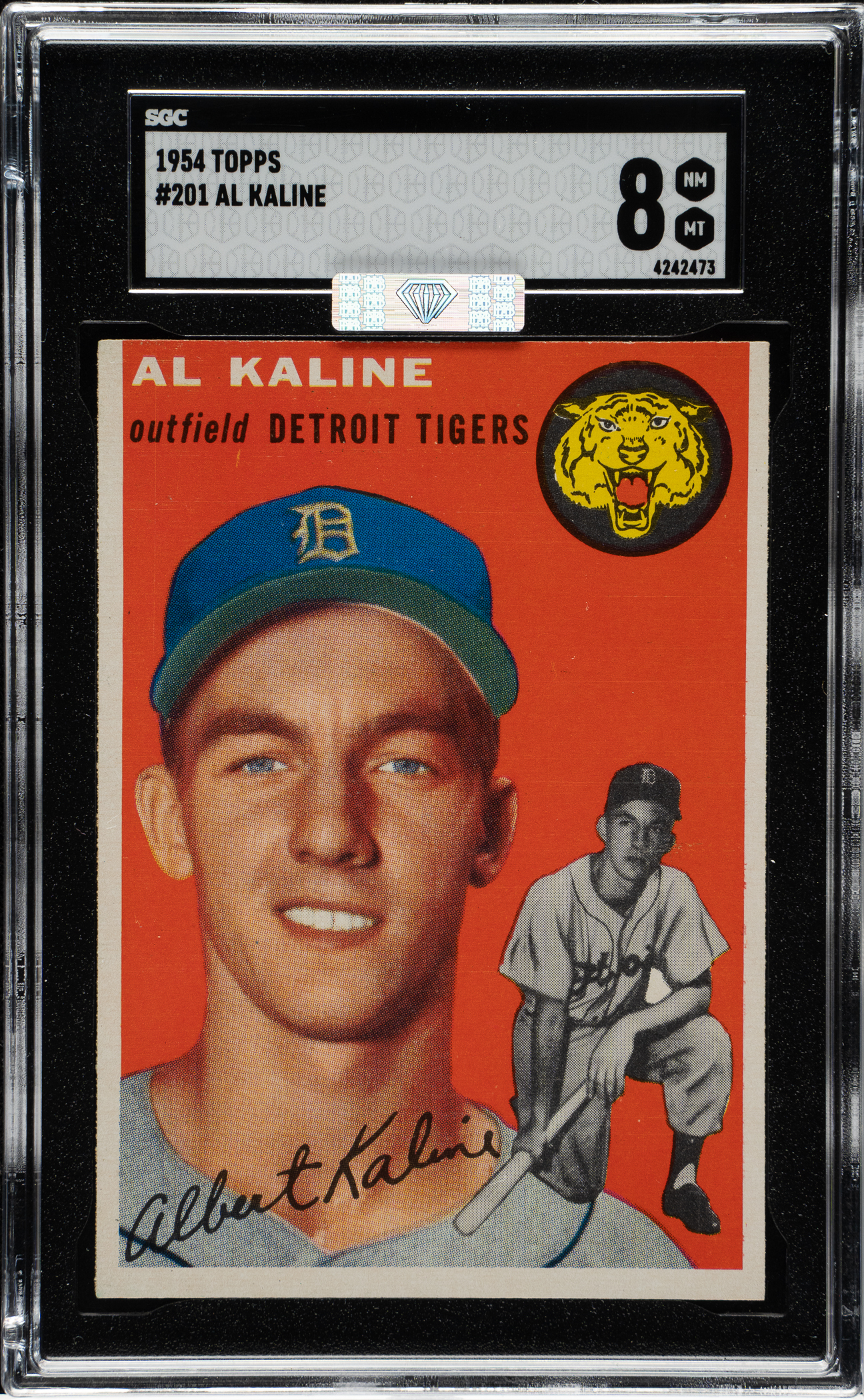 Graded NM/MT 8 by SGC. Superb high-grade rookie card of Detroit Tigers Hall of Famer Al Kaline from the 1954 Topps set. This card has vibrant colors, a crisp image, and strong corners. Clean reverse. An outstanding high-grade example of one of the classics of 1950s bubble-gum cards. Awarded an MBA Silver Diamond by Mike Baker Authenticated for high-end eye appeal. A corresponding MBA sticker is affixed to the front of the holder.