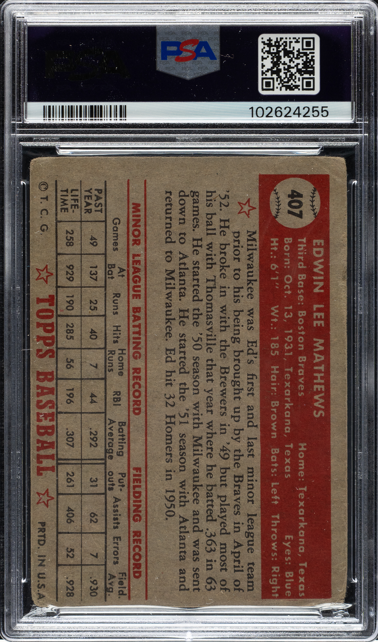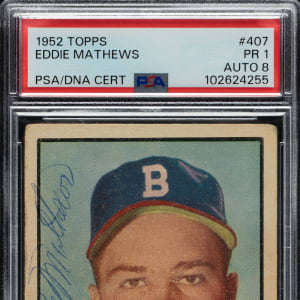Outstanding signed example of Boston Braves Hall of Famer Eddie Mathews' rookie card (#407) from the classic 1952 Topps high number series. The card is signed on the front in blue ballpoint. PSA/DNA has encapsulated the card, grading the signature NM-MT 8 and the card POOR 1. A very attractive signed example worthy of any 1952 Topps signed set or Hall of Fame collection.