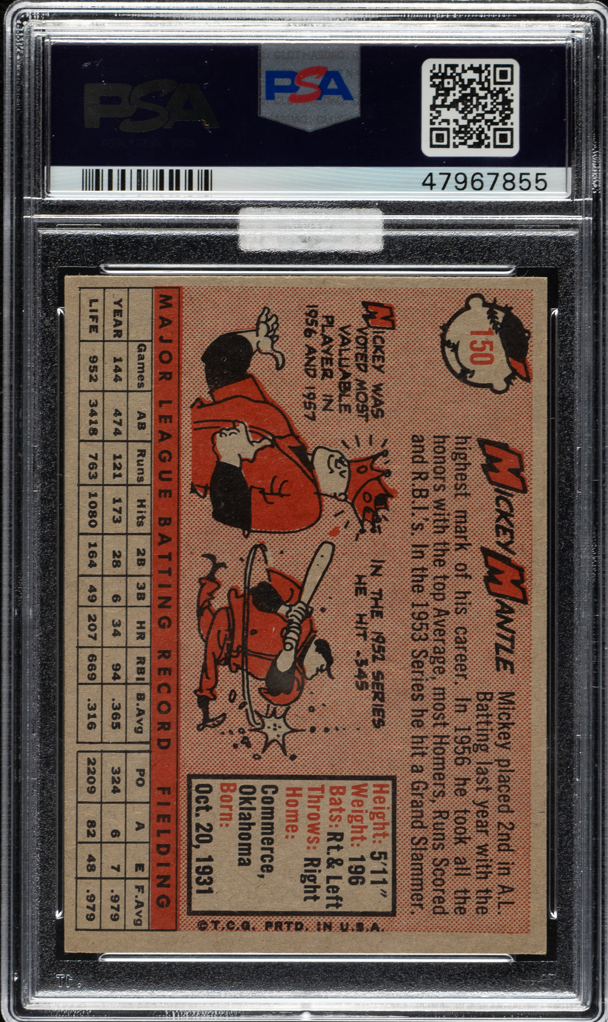 Graded NM-MT 8 by PSA. Stunning high-grade example of New York Yankees legend Mickey Mantle, the key card from the 1958 Topps set. This well-centered card has bold colors, superb clarity, and strong corners. Clean, boldly printed reverse. This is a remarkable, high-grade example of one of Mantle's popular cards and the key card from the 1958 Topps set. Awarded an MBA Silver Diamond by Mike Baker Authenticated for high-end eye appeal. A corresponding MBA sticker is affixed to the front of the holder.