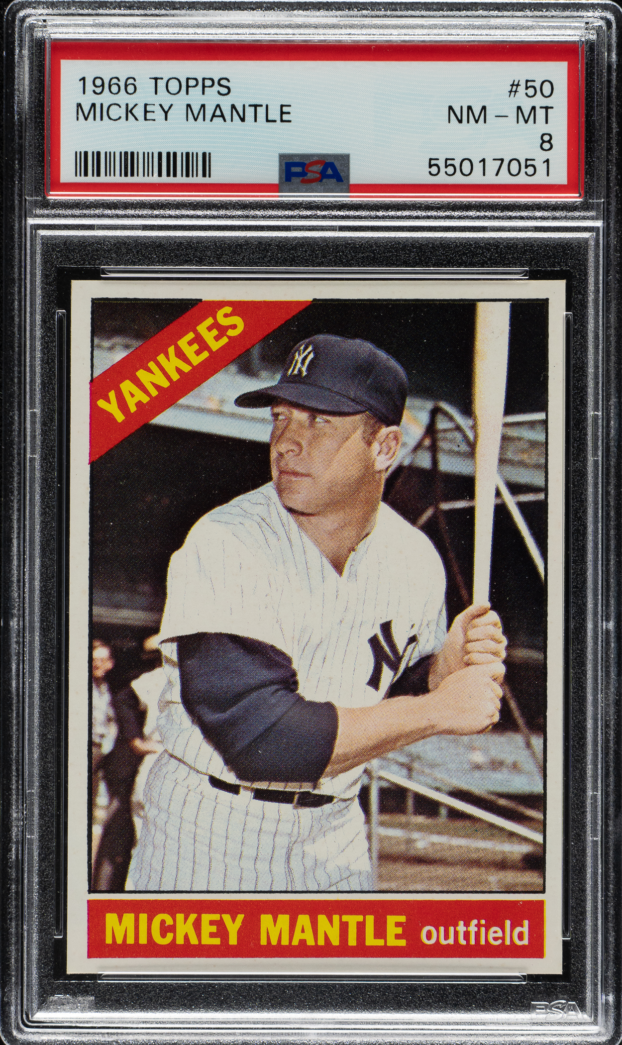 Graded NM-MT 8 by PSA. Beautiful high-grade example of the key card from the 1966 Topps set: New York Yankees Hall of Famer Mickey Mantle. Bright and clean with four strong corners and impressive centering. Clean reverse. This is an outstanding high-grade example.