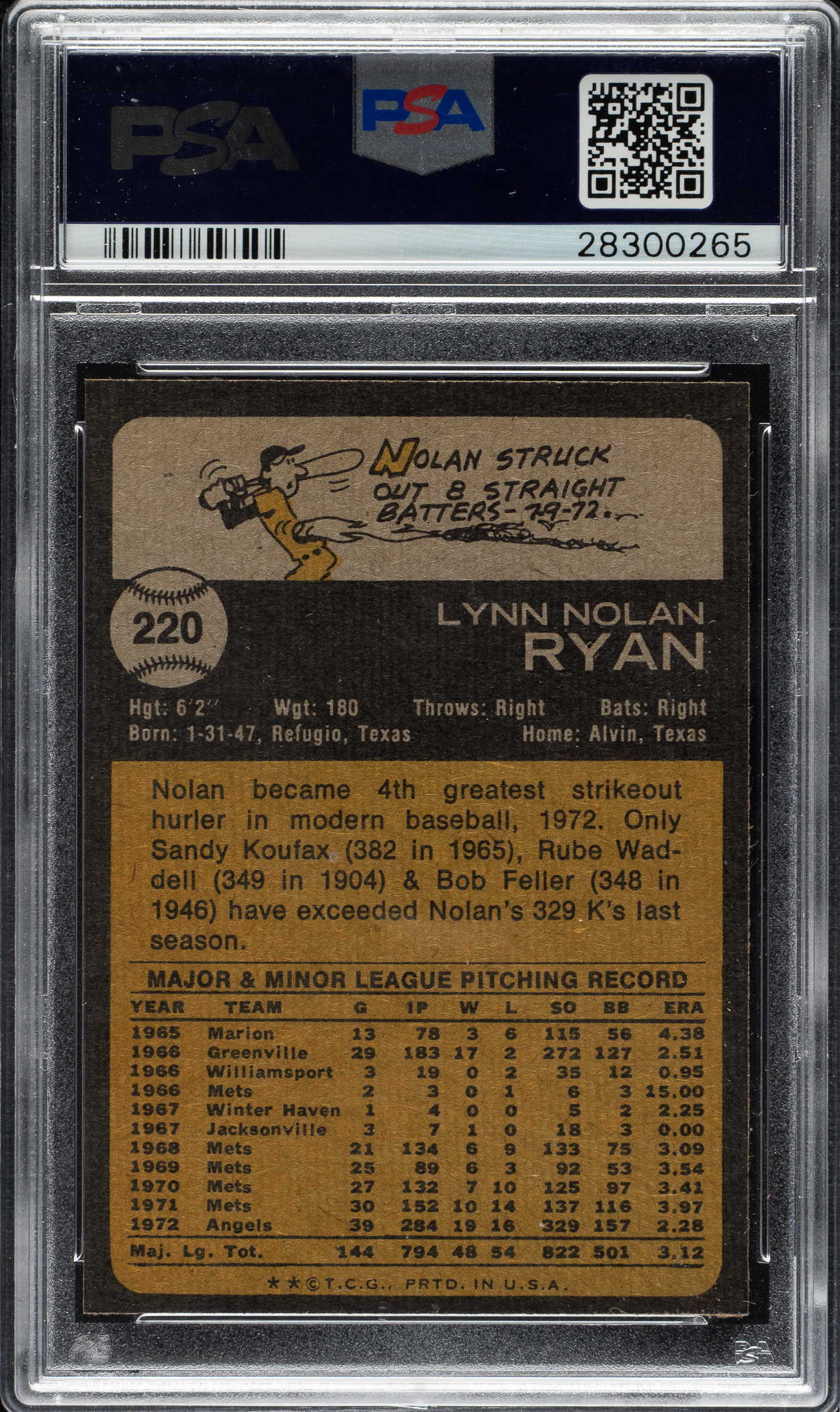 Graded MINT 9 by PSA. Exceptional ultra-high-grade example of California Angels Hall of Famer Nolan Ryan from the 1973 Topps set. Bright, crisp, and clean with four sharp corners and excellent centering. Clean reverse. A superb example worthy of any 1973 Topps set, Nolan Ryan, or Hall of Fame card collection.