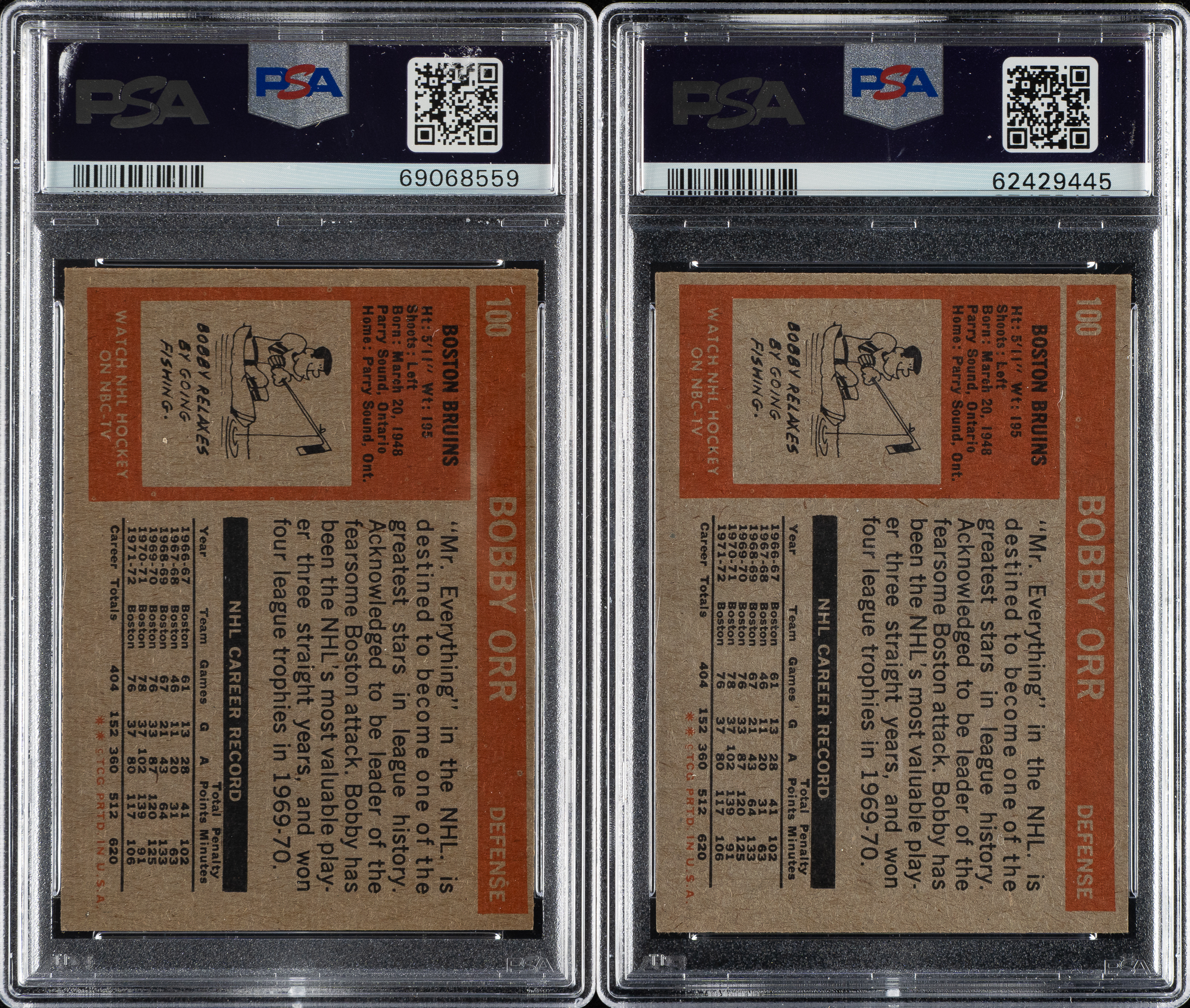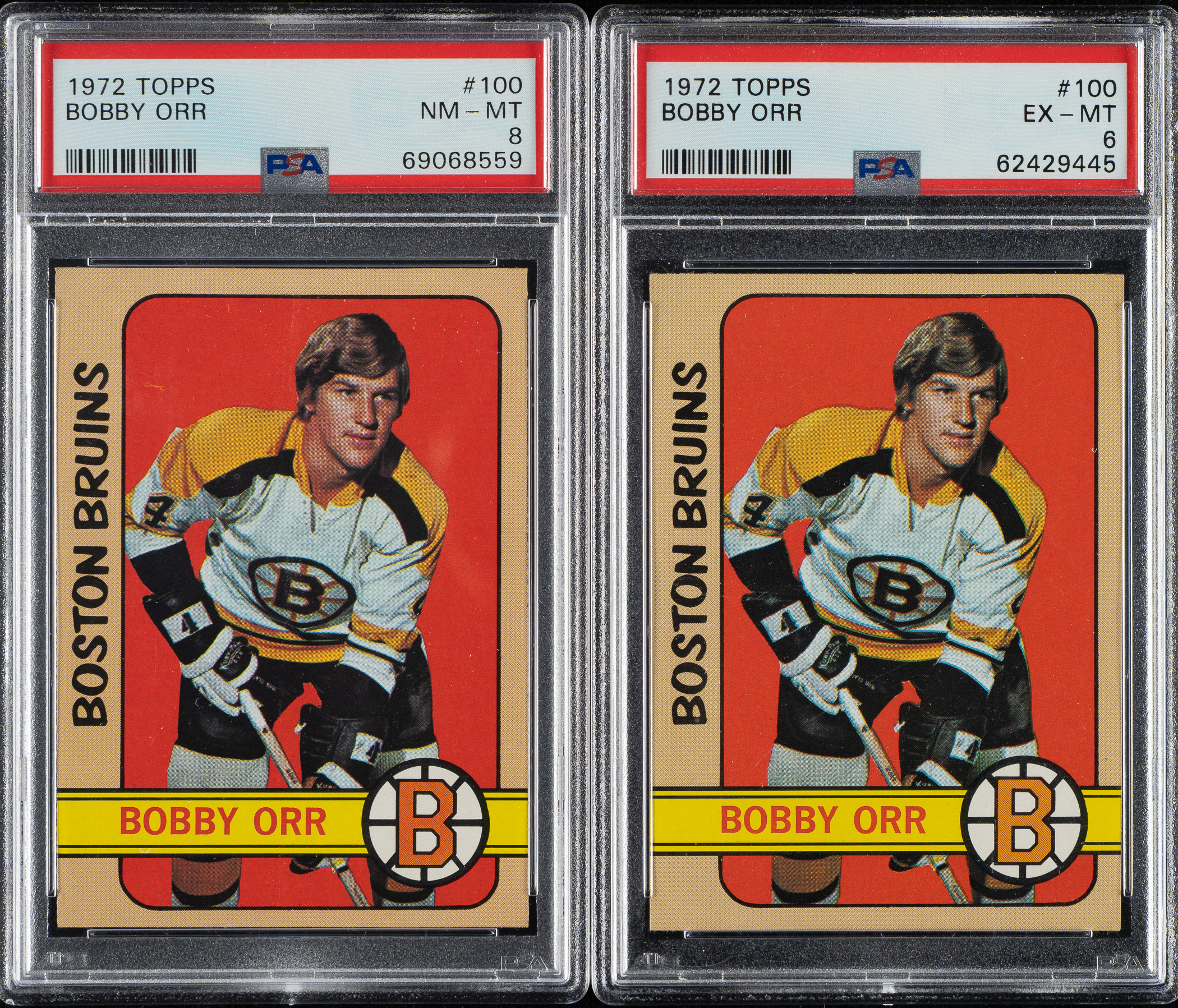 Pair of 1972-1973 Topps hockey cards, featuring Boston Bruins hockey Hall of Famer Bobby Orr. Both cards have been graded and encapsulated by PSA. This pair consists of the following: Two #100 Orr (NM-MT 8 and EX-MT 6). Total: 2 cards.