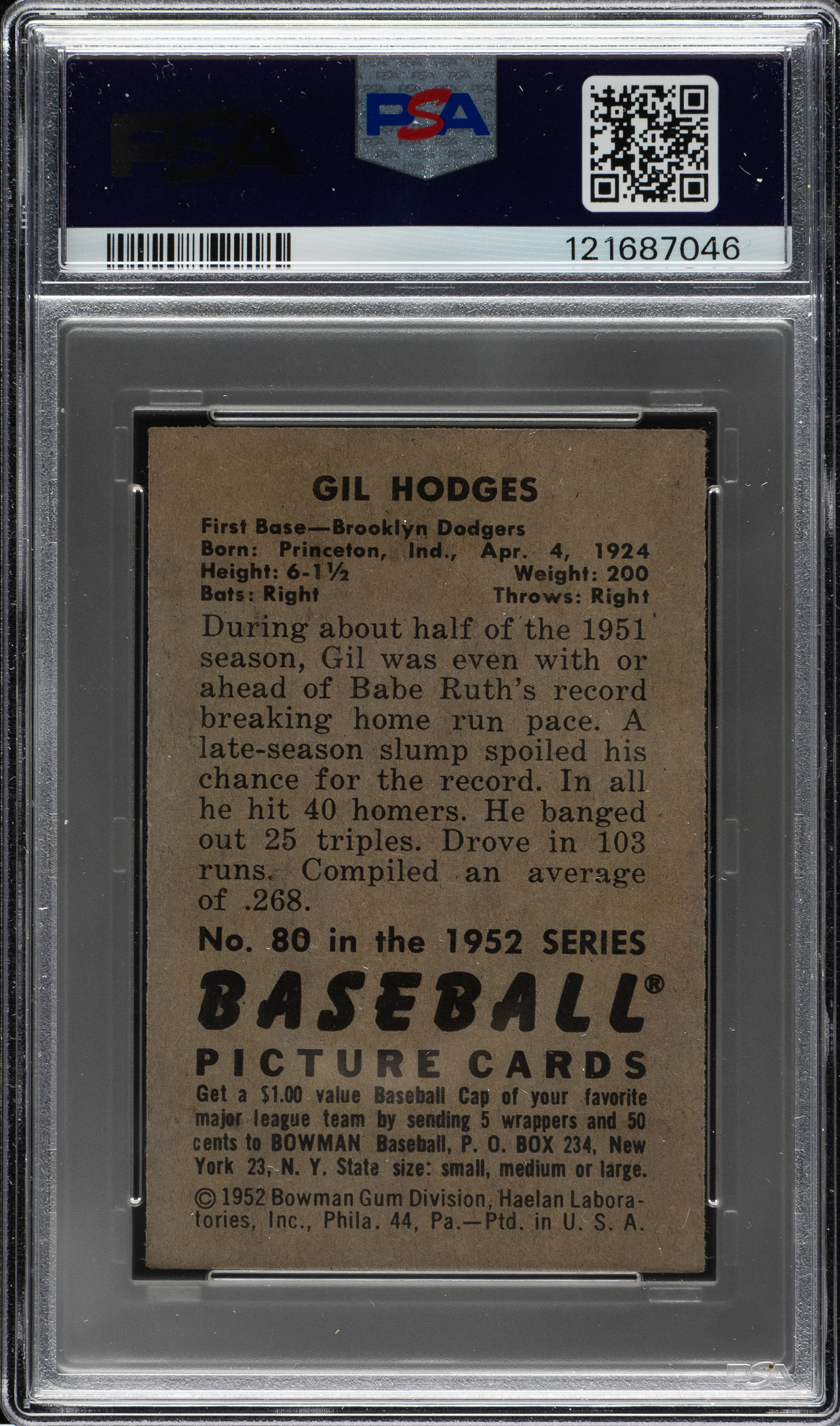 Lot # 1434: 1952 Bowman #80 Gil Hodges PSA NM 7