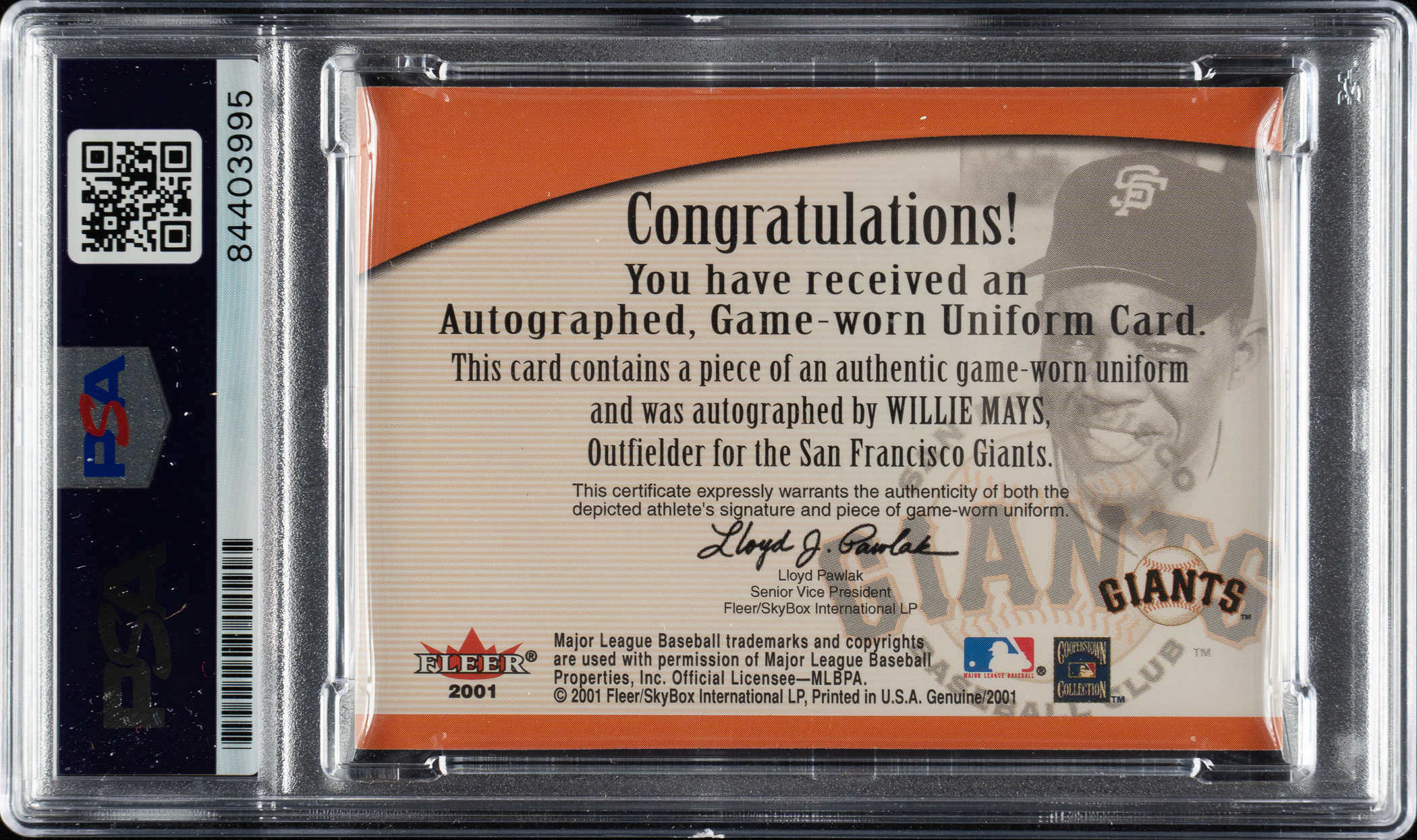 Graded GEM MINT 10 by PSA. San Francisco Giants Hall of Famer Willie Mays.