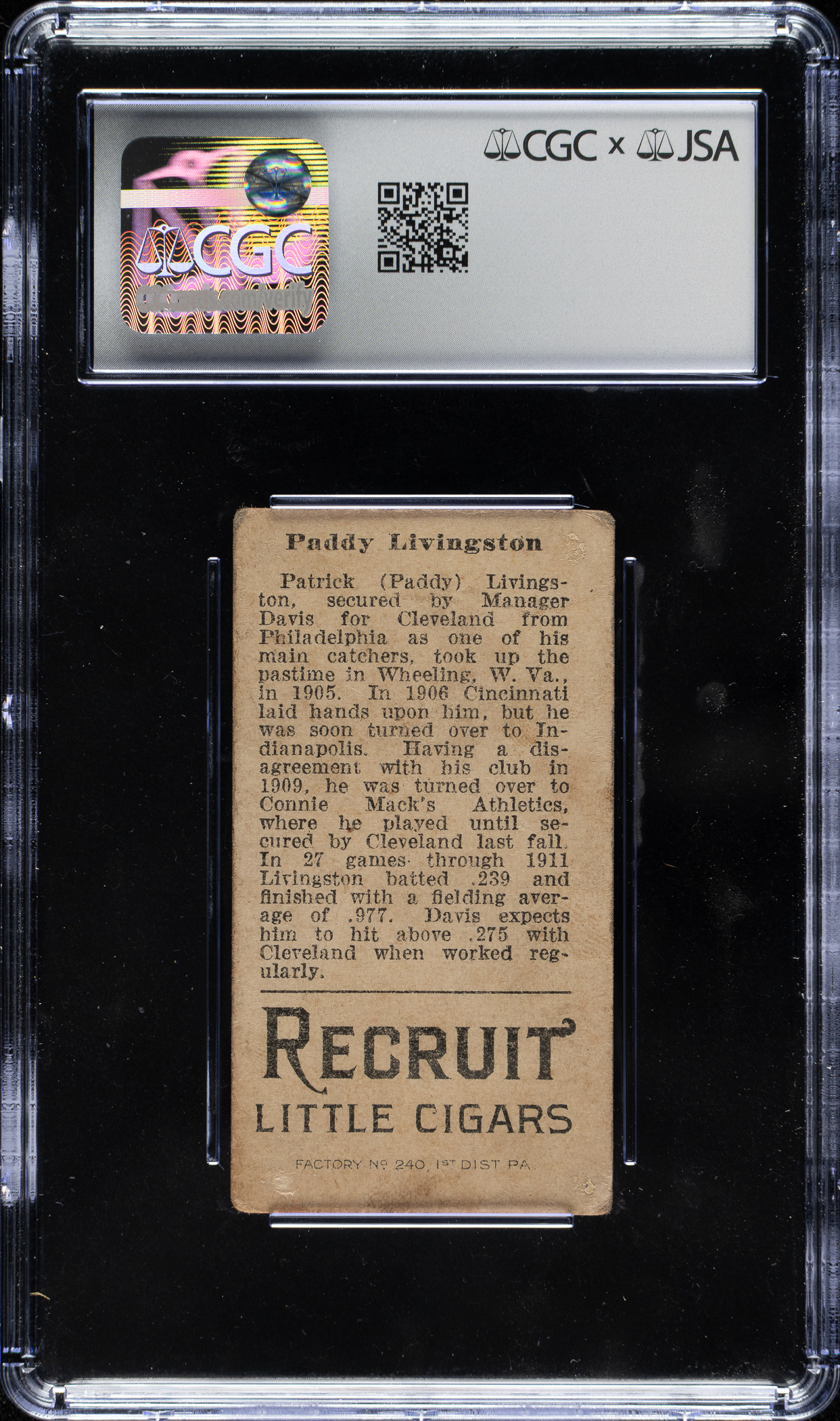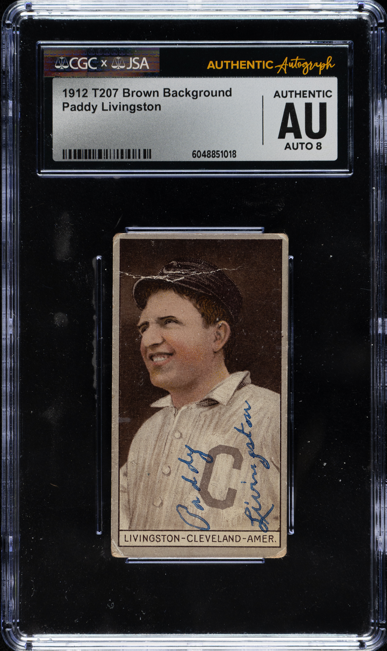 Exceptionally rare signed example of Paddy Livingston (Cleveland Indians) from the classic T207 Brown Background series. Signed cards dating to the 1910s or earlier are extremely rare, and this is just the third signed T207 that we have ever offered! CGC/JSA has encapsulated the card, grading the signature NM-MT 8 and certifying the card as "Authentic."