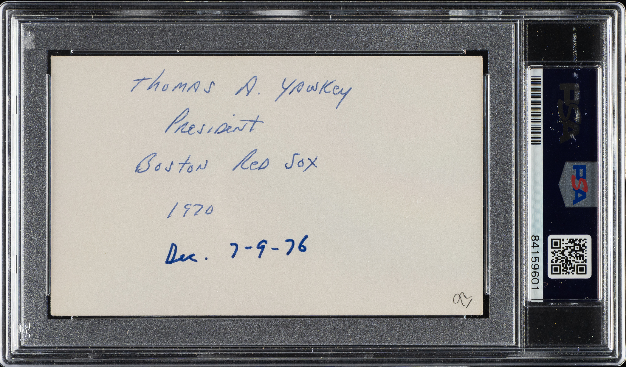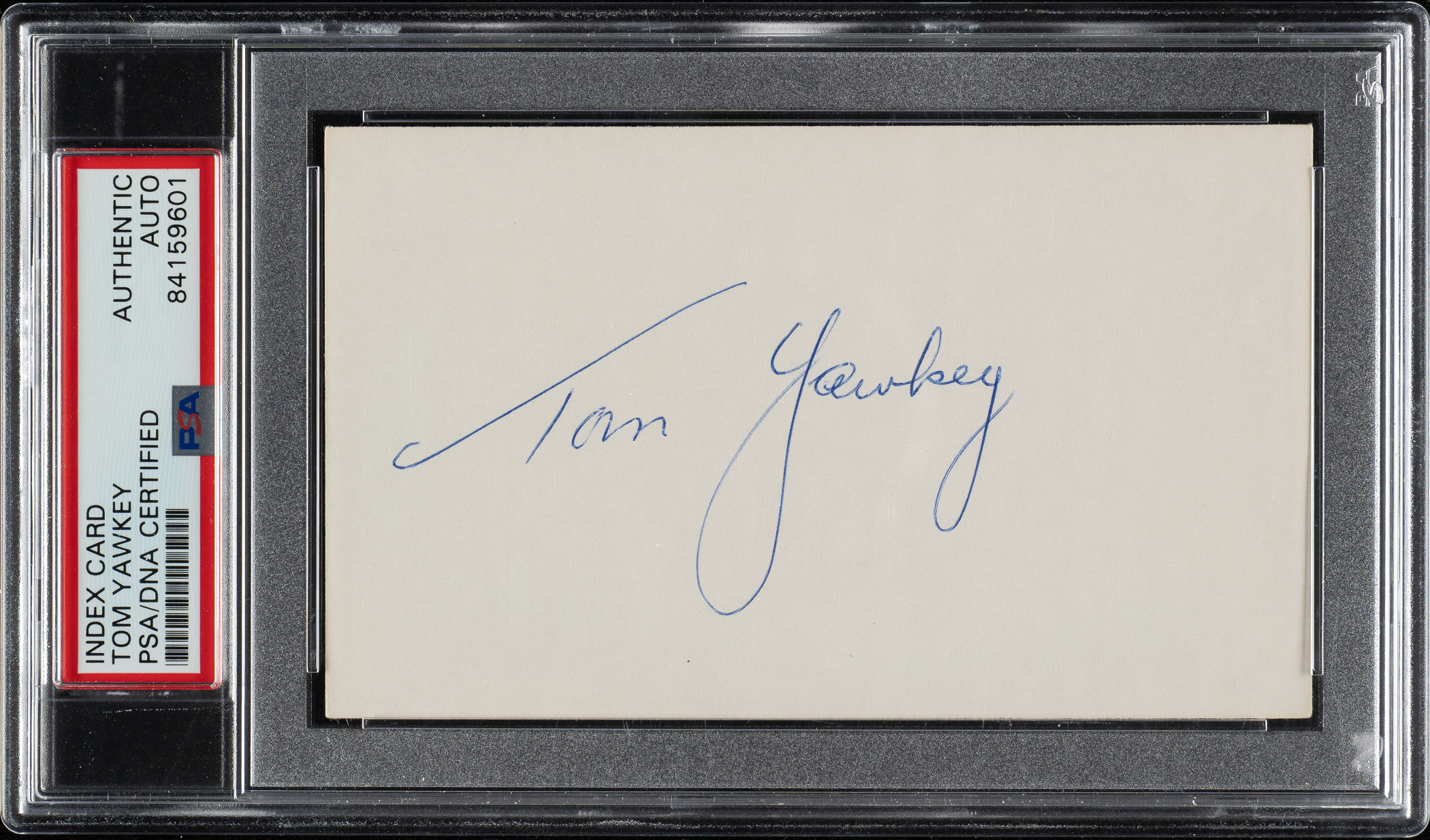 Index card signed by Hall of Famer Tom Yawkey. PSA/DNA has encapsulated the index card and certified the signature as "Authentic." Dimensions: 5 x 3 inches.