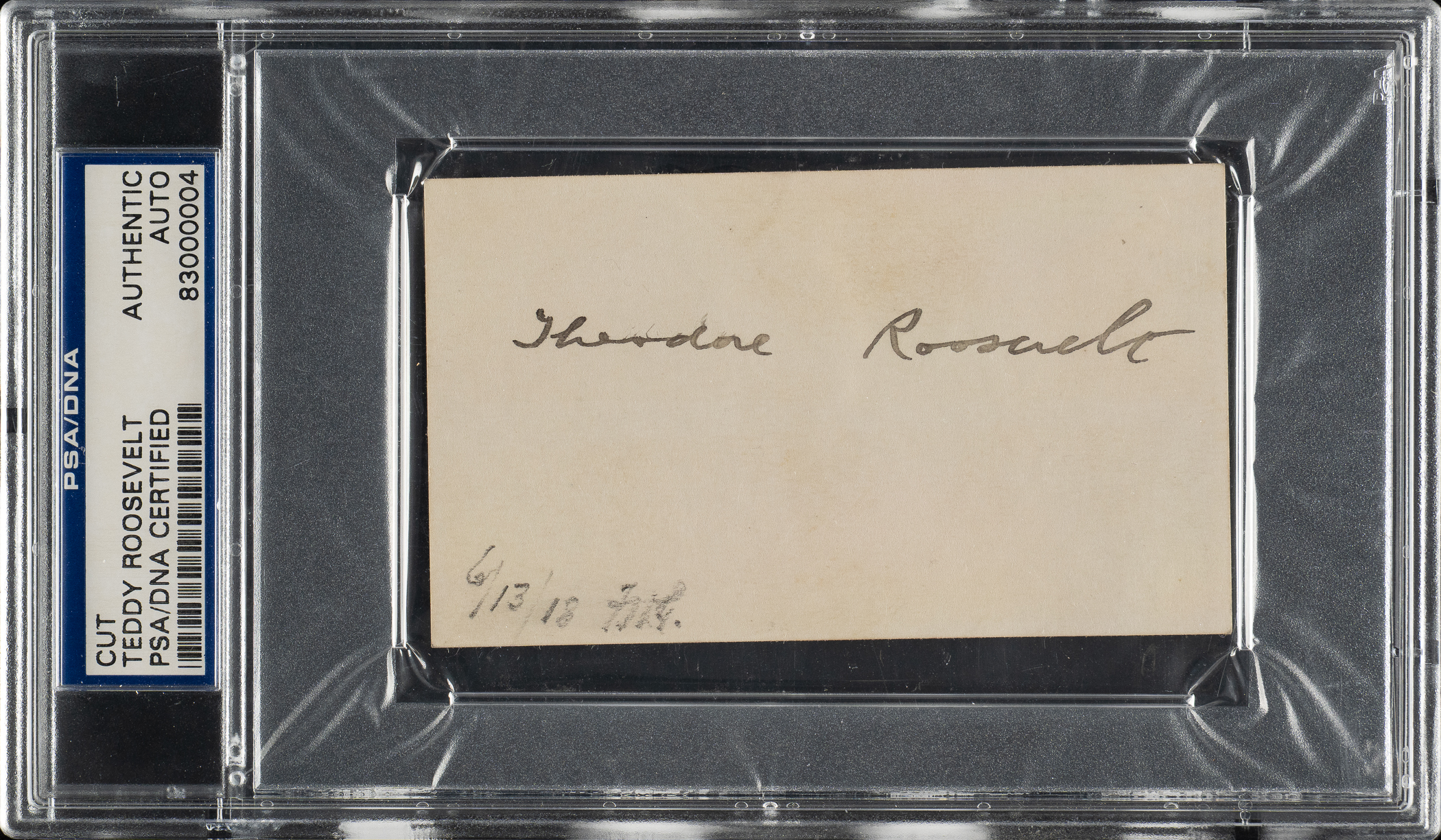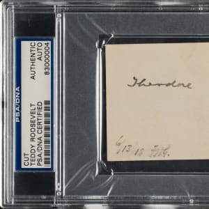 Cut signed in black fountain pen by Theodore Roosevelt (1858-1919), 26th President of the United States. PSA/DNA has encapsulated the cut and certified the signature as "Authentic." Dimensions: 4 x 2-3/8 inches.