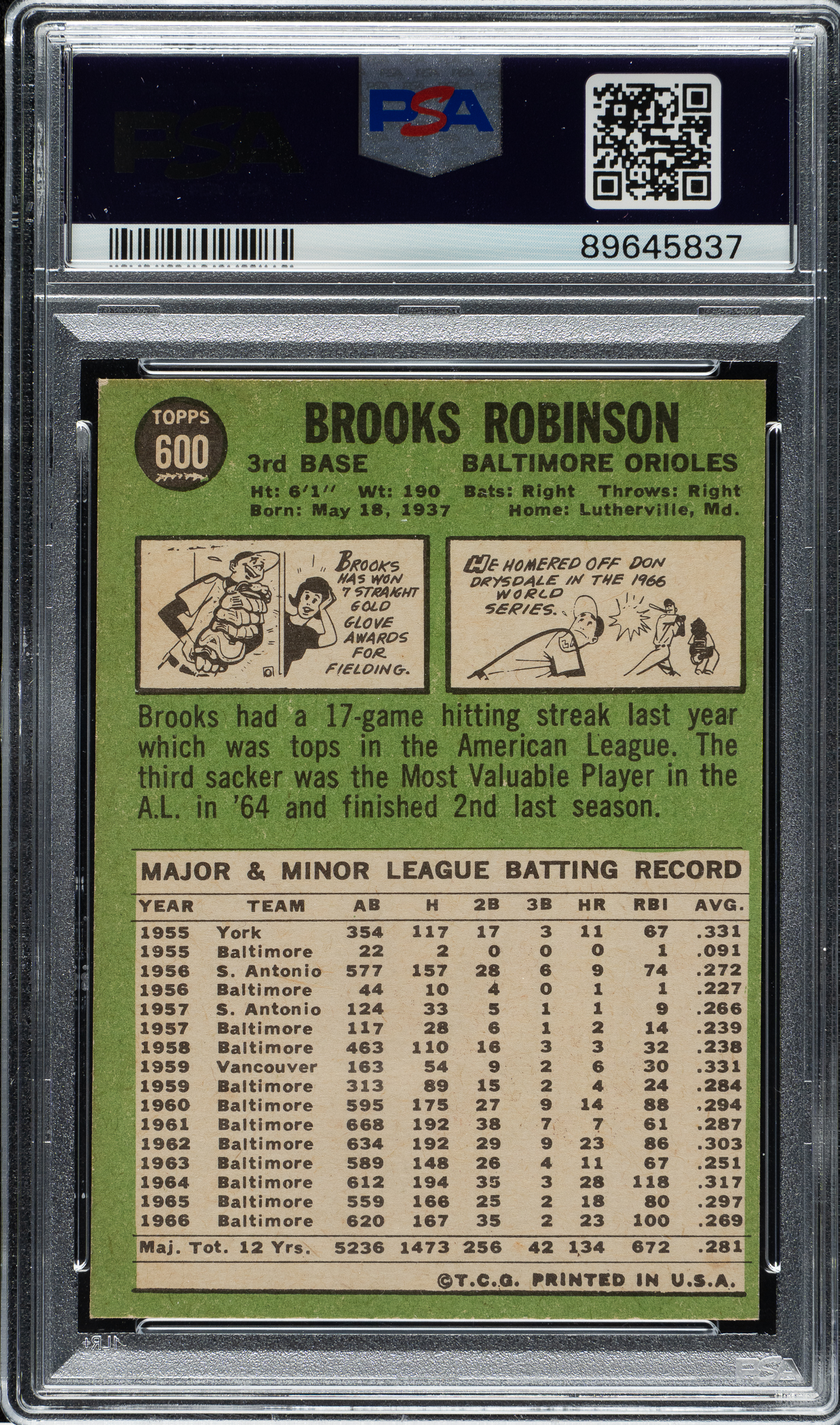 Graded NM 7 by PSA. Baltimore Orioles Hall of Famer Brooks Robinson.