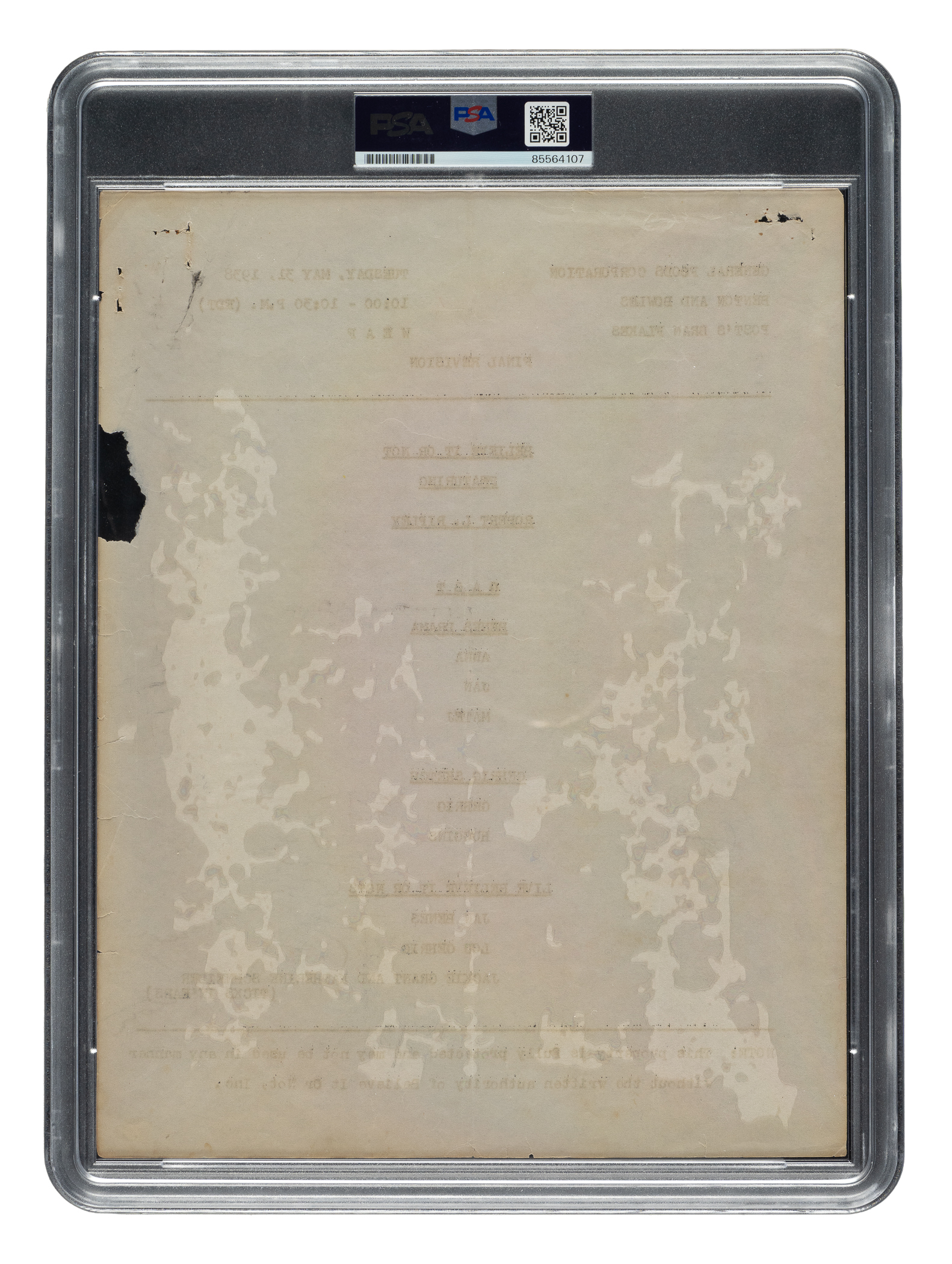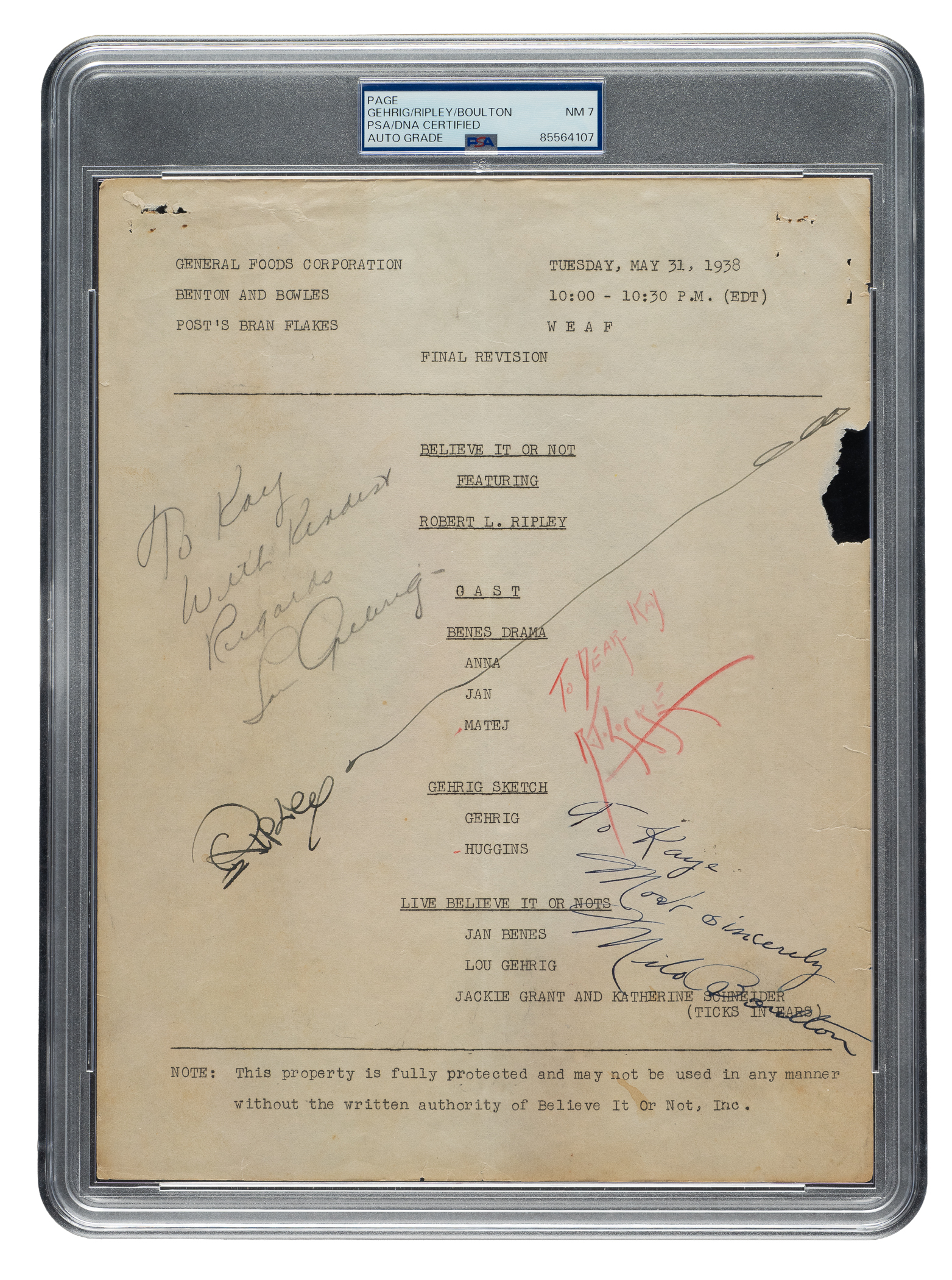 Presented is a 21-page typewritten script, dated May 31, 1938, from NBC's "Ripley's Believe It or Not!" radio program, signed on the "Final Revision" page by New York Yankees Hall of Famer Lou Gehrig, the host Robert Ripley, actor Milo Boulton, and minor league ballplayer R.J. Locke. Gehrig's signature, scripted in pencil, includes the salutation, "To Kay/With Kindest/Regards." Two other signees (Boulton and Locke) included a salutation as well. PSA/DNA has encapsulated the page and graded the signatures NM 7. On May 31, 1938, Gehrig played in his 2,000th consecutive game. This feat was considered a "Believe It or Not" event, and Gehrig was featured on the nationwide radio program that evening. During this era, Gehrig was a spokesman for both Huskies Cereal, the sponsor of the radio program, and Wheaties Cereal. It is interesting to note that during the live radio show, Gehrig mistakenly gave an endorsement for Wheaties Cereal and was quickly corrected by the announcer to properly give credit to Huskies Cereal. The pages numbered 11 through 14 of the script, which makes note of his 2,000th consecutive game multiple times, features the dialogue for the Gehrig segment of the radio program. The signature page has several staple holes and a small piece missing on the right edge, Fair condition. The remaining pages of the script feature a staple hole in the upper-left corner of each page, as well as a vertical fold and light creasing. Good condition overall.