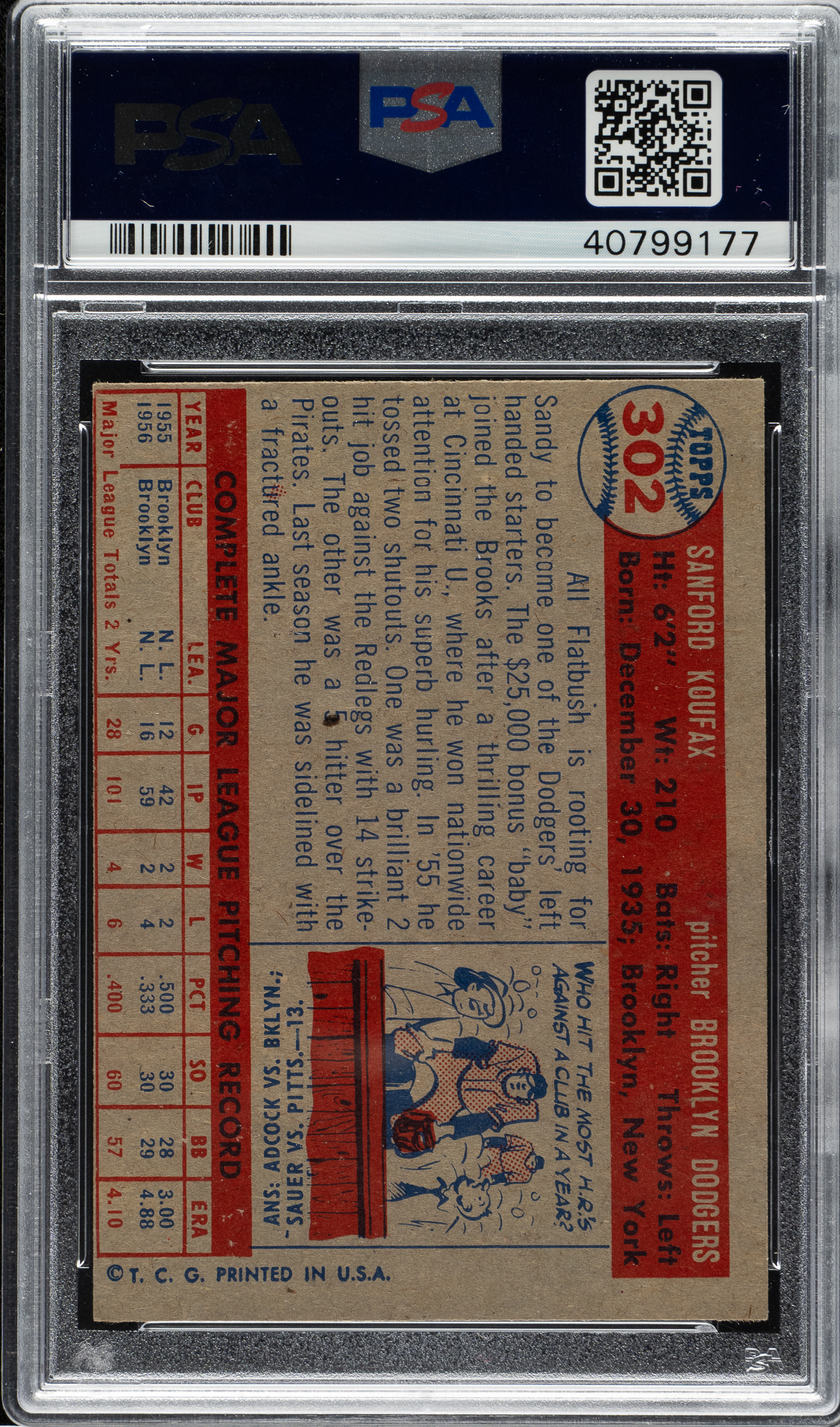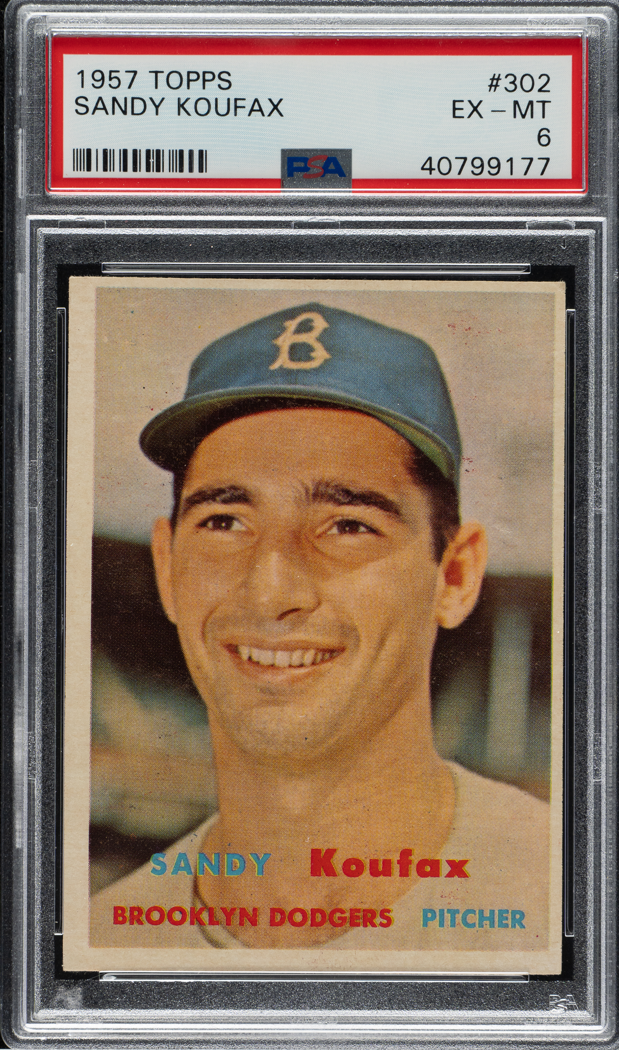 Graded EX-MT 6 by PSA. Brooklyn Dodgers Hall of Famer Sandy Koufax.