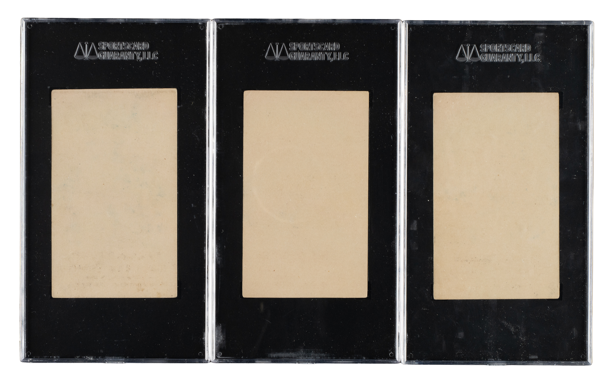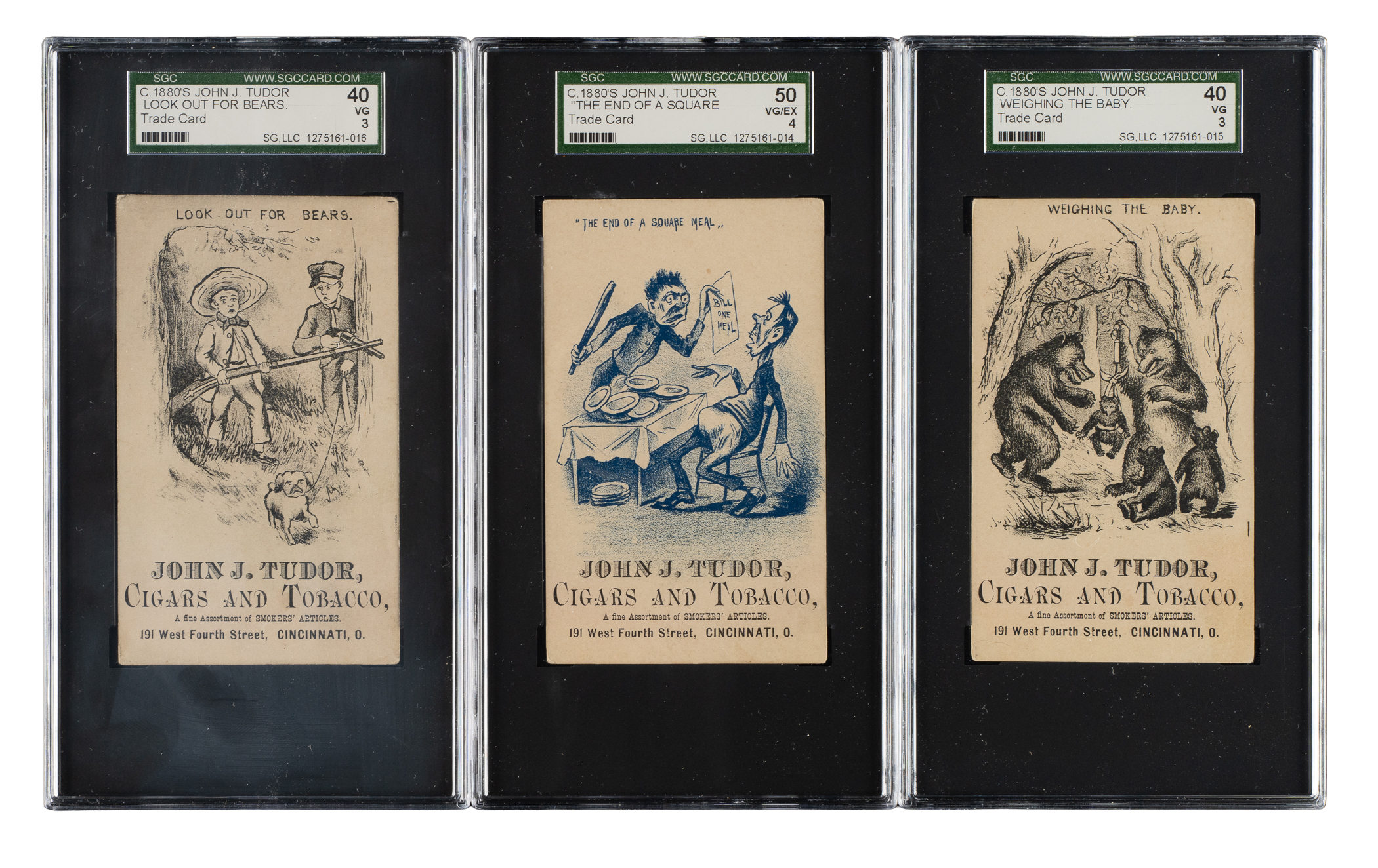 Presented is a trio of circa 1880s John J. Tudor trade cards, each professionally graded and encapsulated by SGC. This collection consists of the following: Look out for Bears (VG 40), The End of a Square (VG/EX 50), and Weighing the Baby (VG 40). Total: 3 cards.