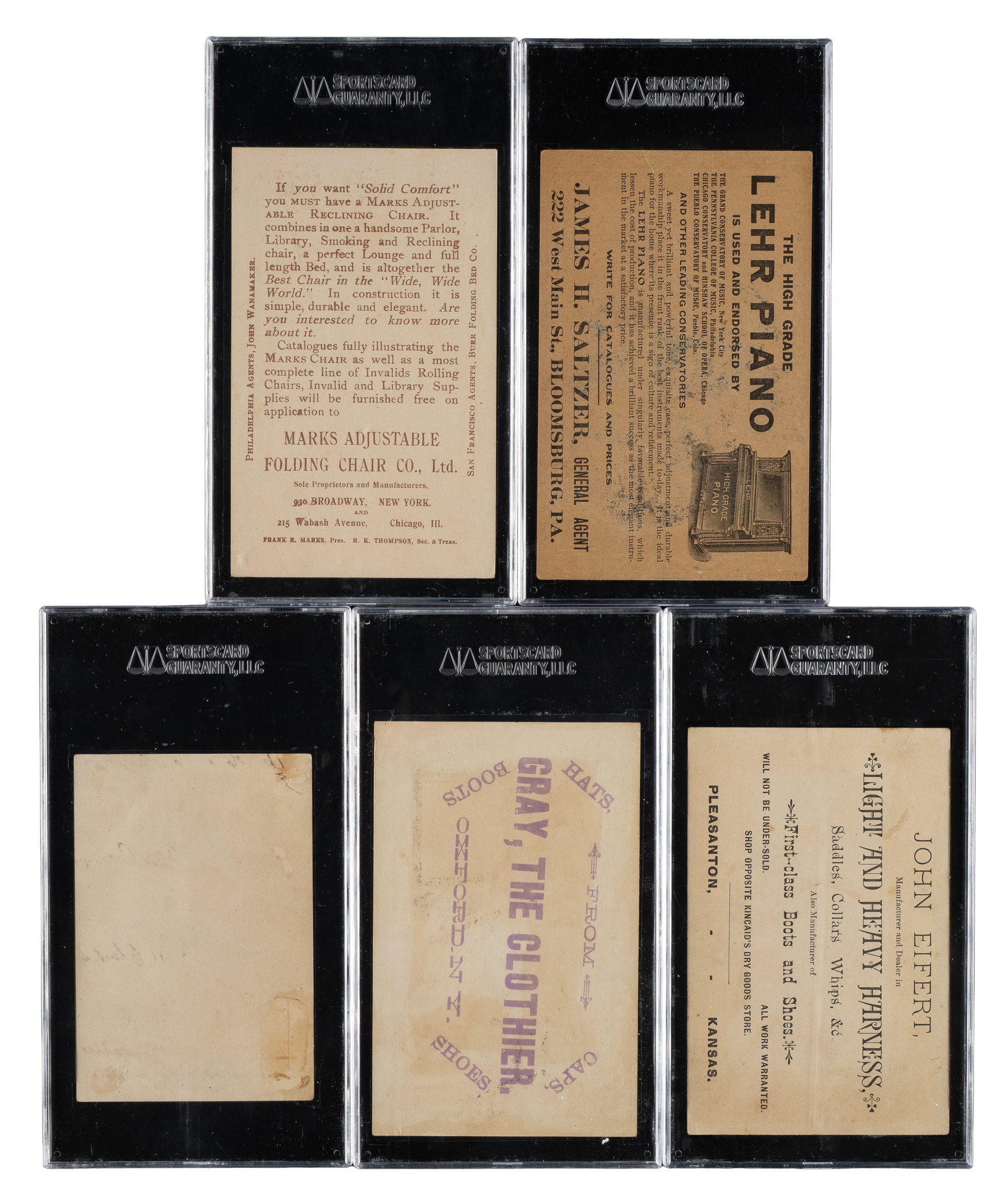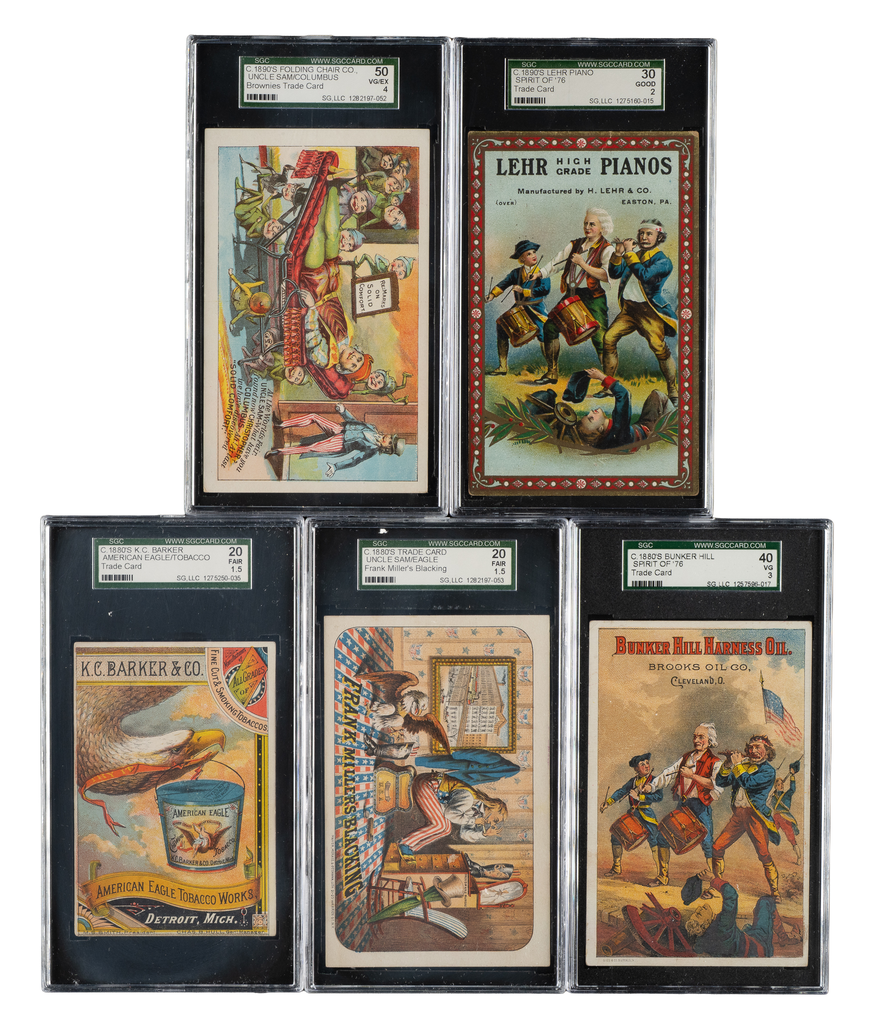 Presented is a collection of five circa 1880s and 1890s America-Themed trade cards, each professionally graded and encapsulated by SGC. This collection is highlighted by Uncle Sam and American Eagle. Consists of: 1) c1880s Bunker Hill (1 card): Spirit of '76 (VG 40). 2) c1880s Frank Miller's Blacing (1 card): Uncle/Sam Eagle (FAIR 20). 3) c1880s K. C. Barker (1 card): American Eagle/Tobacco (FAIR 20). 4) c1890s Lehr Piano (1 card): Spirit of '76 (GOOD 30). 5) c1890s Folding Chair Co. (1 card): Uncle Sam/Columbus (VG/EX 50). Total: 5 cards.