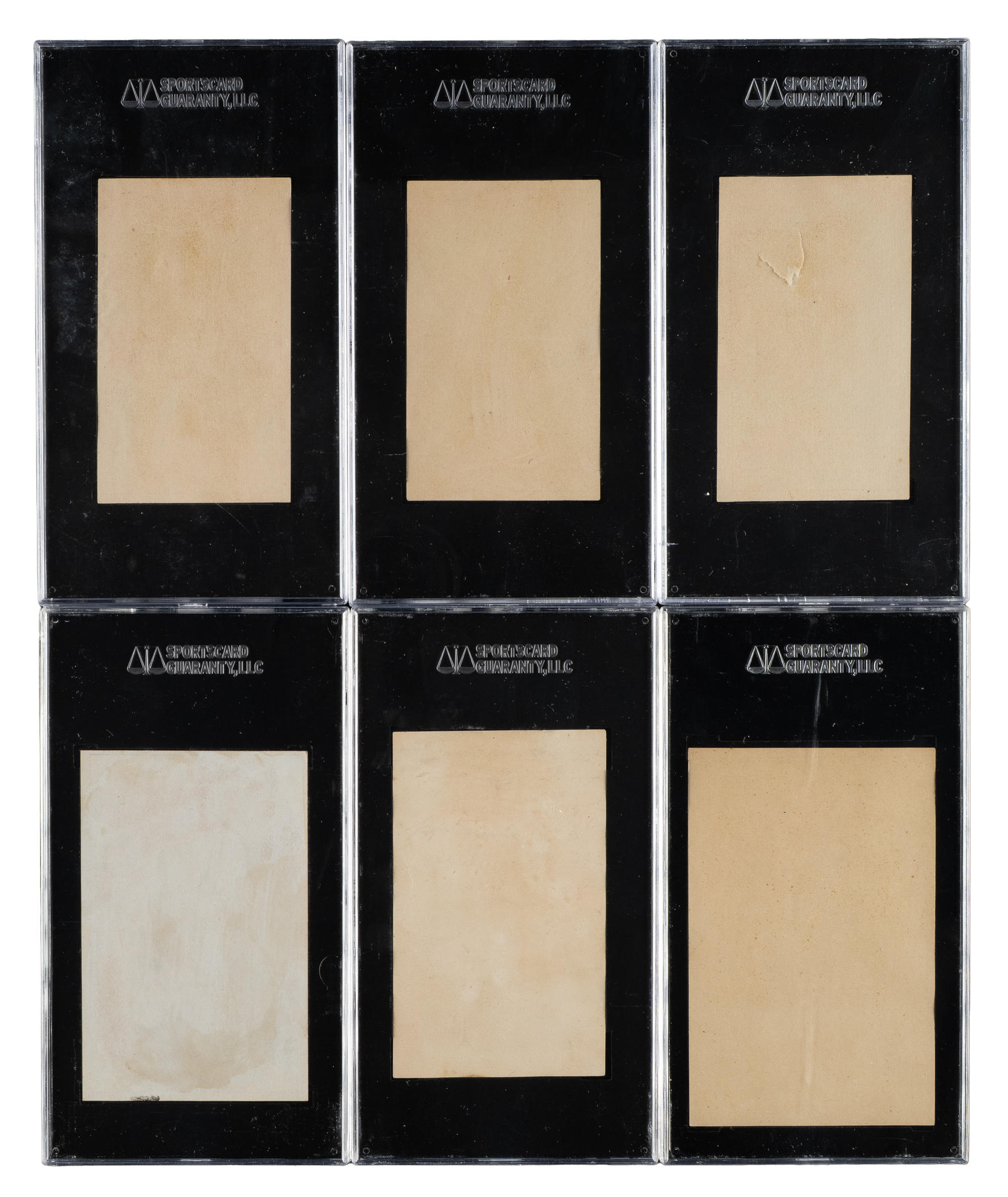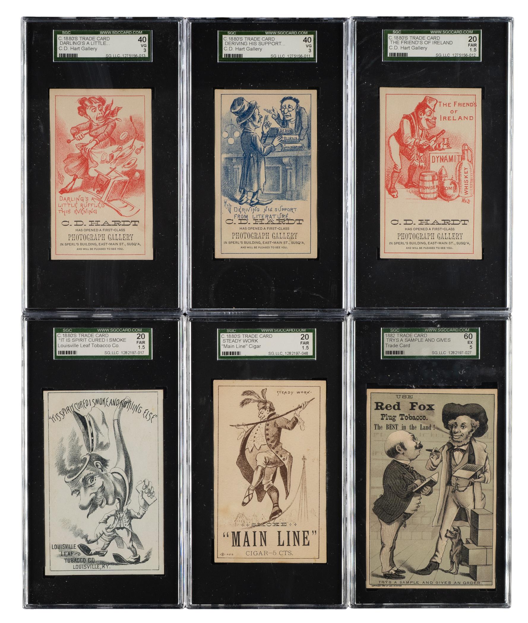 Presented is a collection of six circa 1880s (unless noted) trade cards, each professionally graded and encapsulated by SGC. This collection consists of the following: 1) C. D. Hart Gallery (3 cards): Darling's a Little (VG 40), Deriving His Support (VG 40), and The Friend's of Ireland (FAIR 20). 2) Louisville Leaf Tobacco Co. (1 card): It Is Spirit Cured I Smoke (FAIR 20). 3) Main Line Cigar (1 card): Steady Work (FAIR 20). 4) 1882 Trade Card (1 card): Trys a Sample and Gives (EX 60). Total: 6 cards.