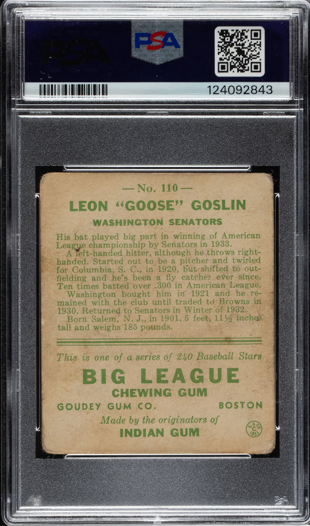 Graded FAIR 1.5 by PSA. Washington Senators Hall of Famer Goose Goslin.