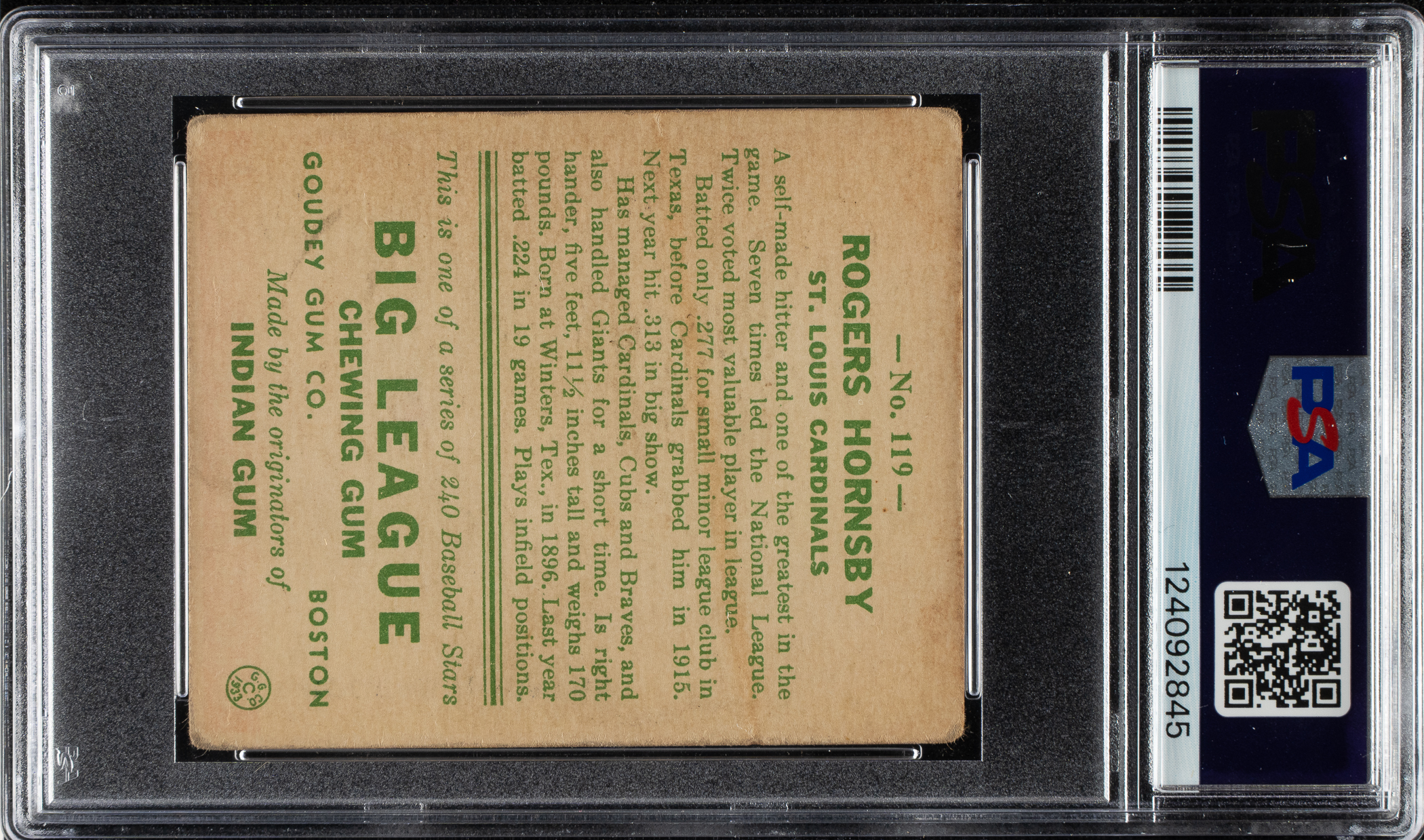 Graded GOOD 2 (MK) by PSA. St. Louis Cardinals Hall of Famer Rogers Hornsby.