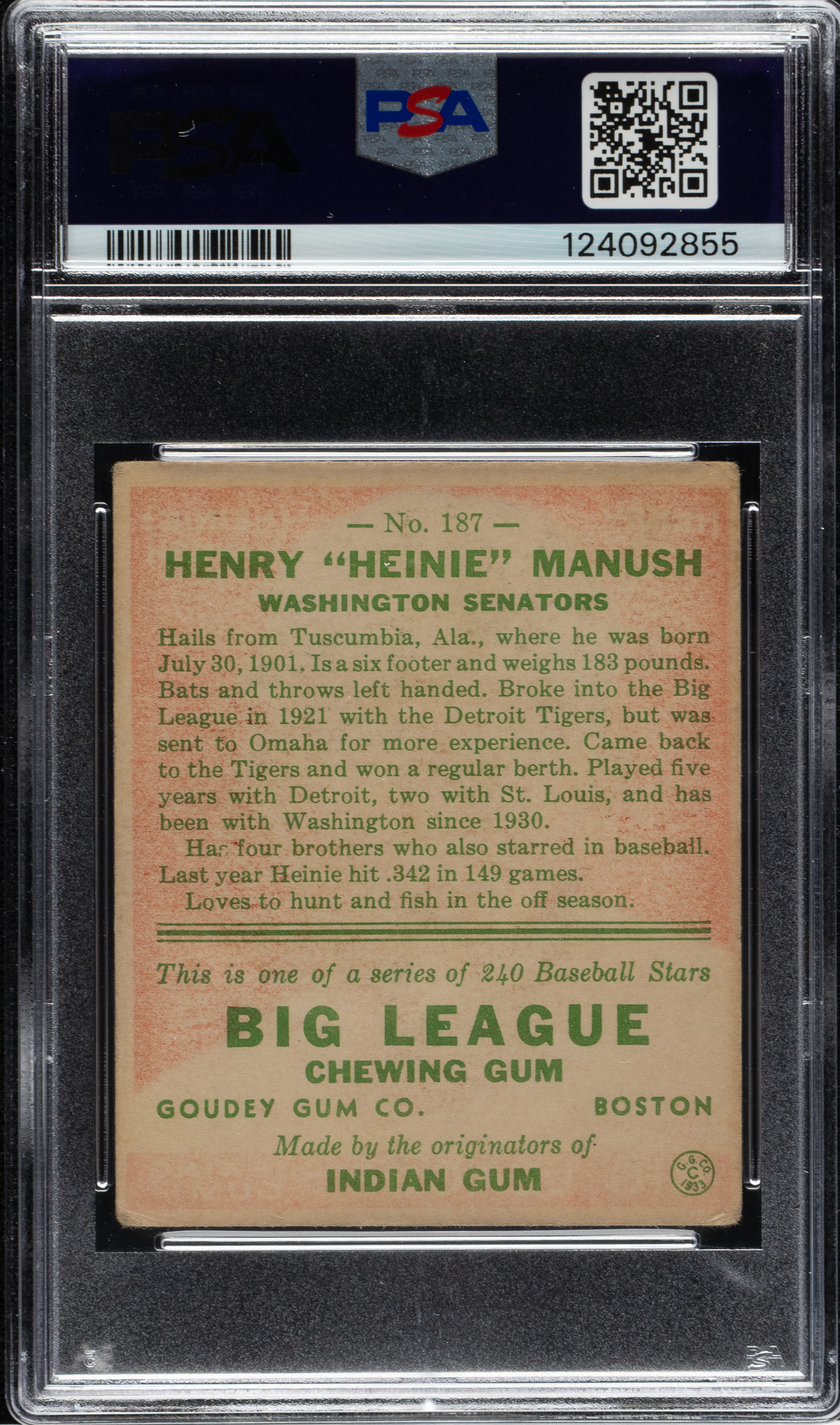 Graded GOOD 2 by PSA. Washington Senators Hall of Famer Heinie Manush.