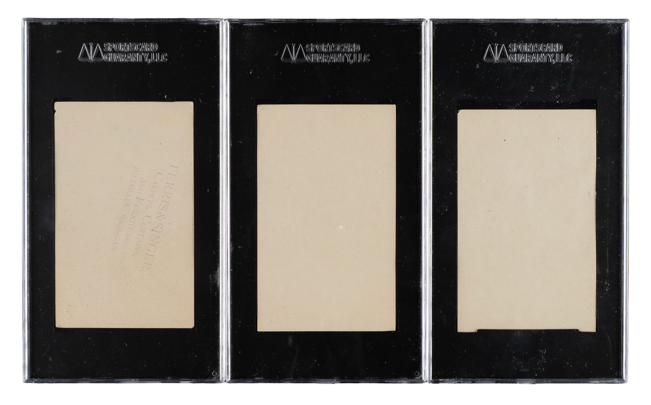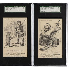 Presented is a trio of circa 1880s Ferris & Singer's Furniture trade cards, each professionally graded and encapsulated by SGC. This collection consists of the following: Little Bear Foot (VG 40), One of the Finest (VG 40), and Practicing the Scales (VG 4). Total: 3 cards.
