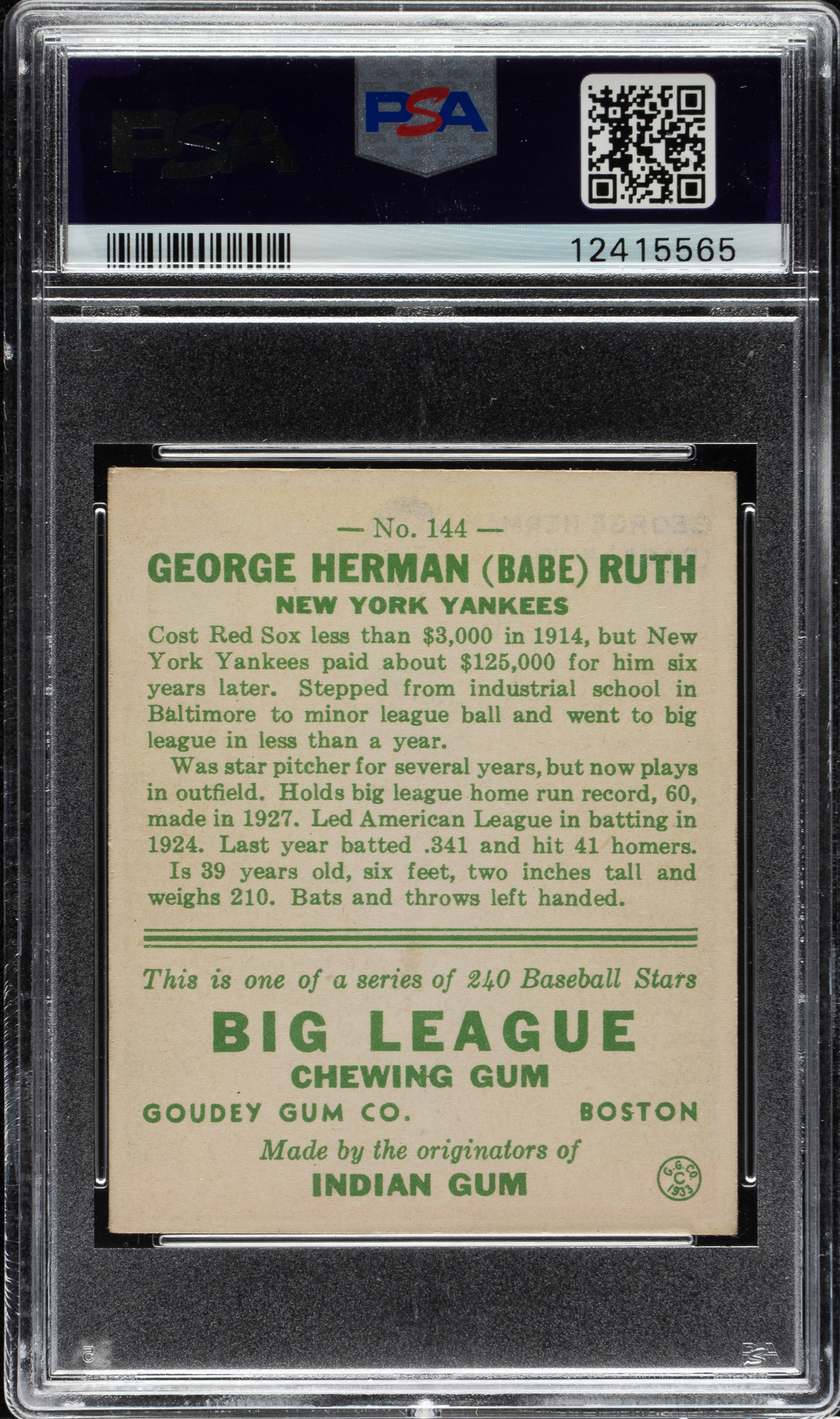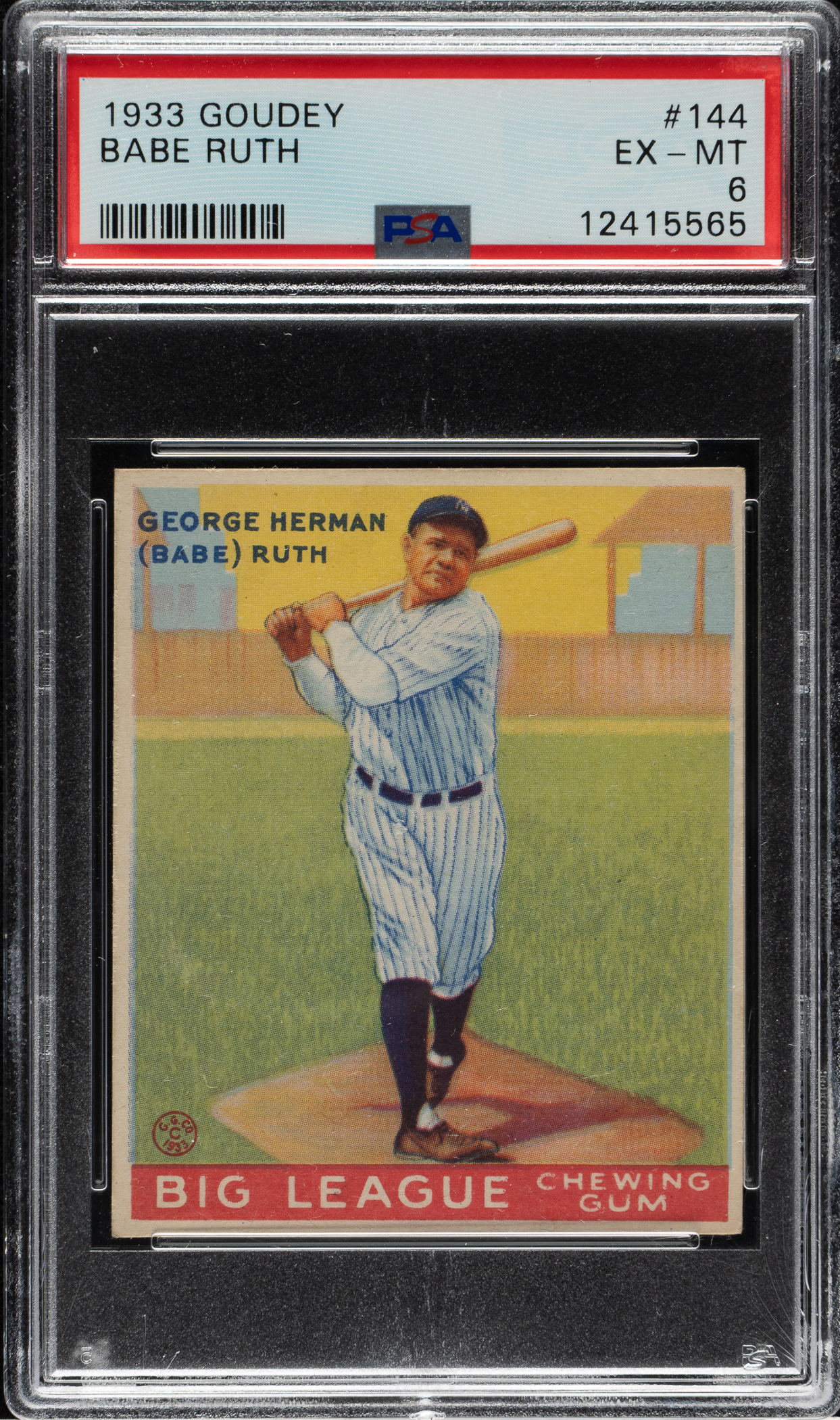 Graded EX-MT 6 by PSA. Magnificent example of a classic Babe Ruth card featuring him in his classic follow-through batting pose. Goudey must have also realized this was a classic pose because, of all the cards in the set, this is the one it chose to double print when replacing the missing #106 during production. This continues to be one of Ruth's most popular and recognizable baseball cards. Because of being double-printed by Goudey (there were exactly twice as many Ruth #144s printed as any other card in the same series), this card also represents the best value among the four Babe Ruth cards in the 1933 Goudey set. The offered card has brilliant colors, outstanding registration, and light corner wear. Clean reverse with bold green text. This is a stunning example of one of Babe Ruth's most classic cards from the popular 1933 Goudey Gum series which would be a very significant addition to any 1933 Goudey set Babe Ruth card collection.