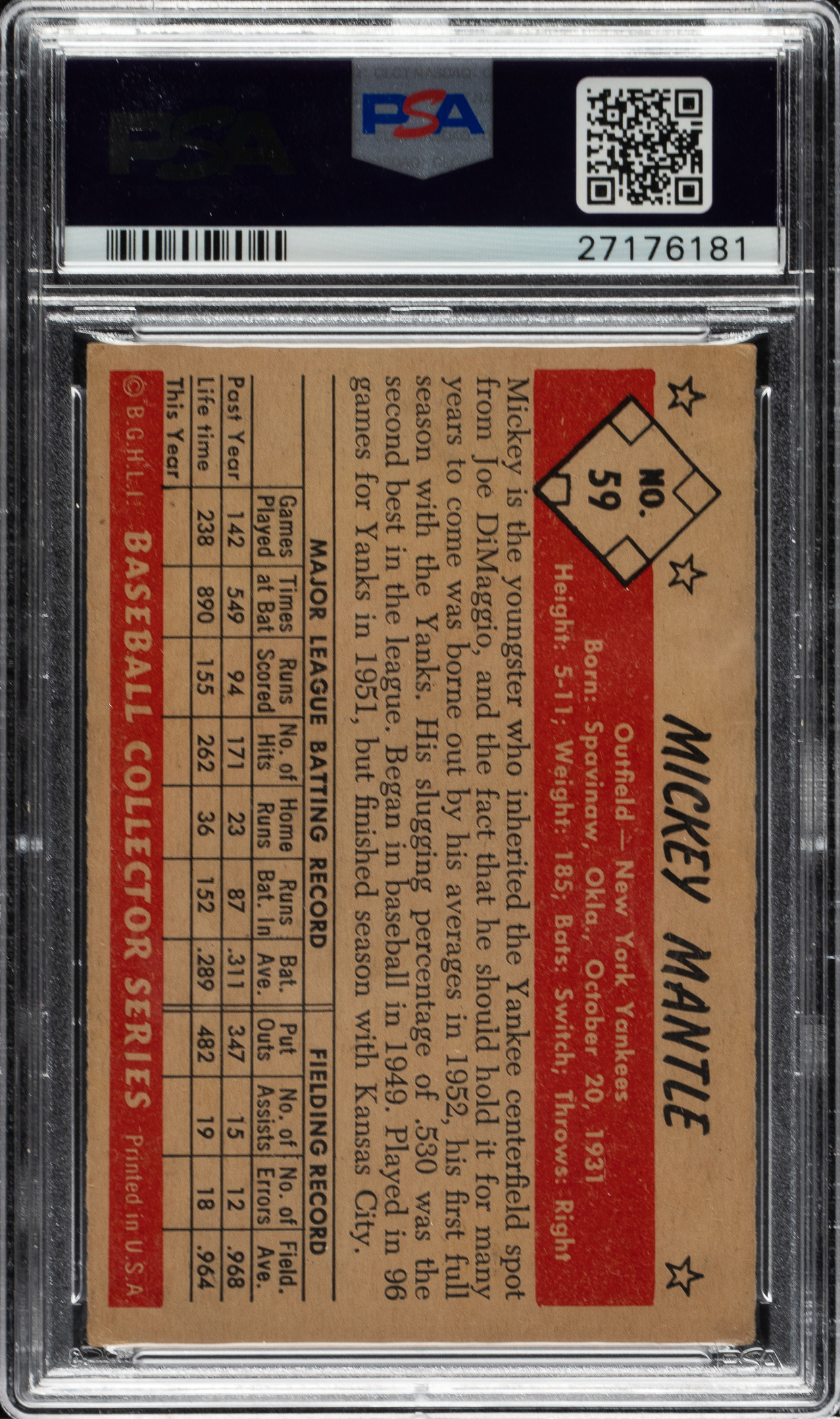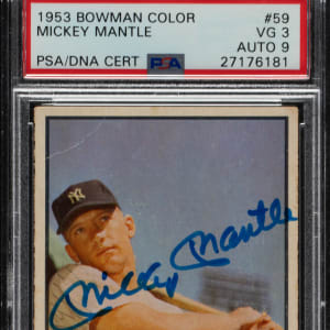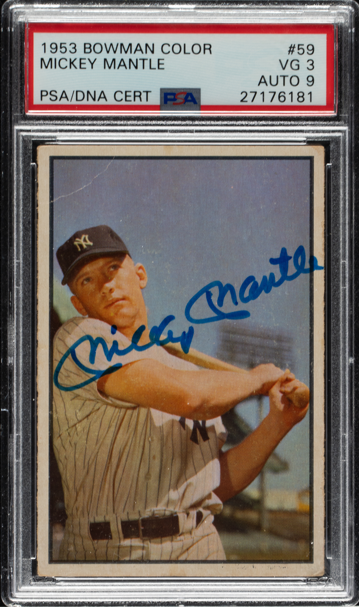 Outstanding signed example of New York Yankees Hall of Famer Mickey Mantle (#59) from the classic 1953 Bowman Color series. Mantle has signed the card in blue ink along the front. PSA/DNA has encapsulated the card, grading the signature MINT 9 and the card VG 3. Mantle-signed baseball cards, especially those dating from the early 1950s, have always been highly prized by autograph collectors. This is a classic Mantle card and one that would be a great addition to any Mickey Mantle, Hall of Fame, or 1953 Bowman Color signed collection.