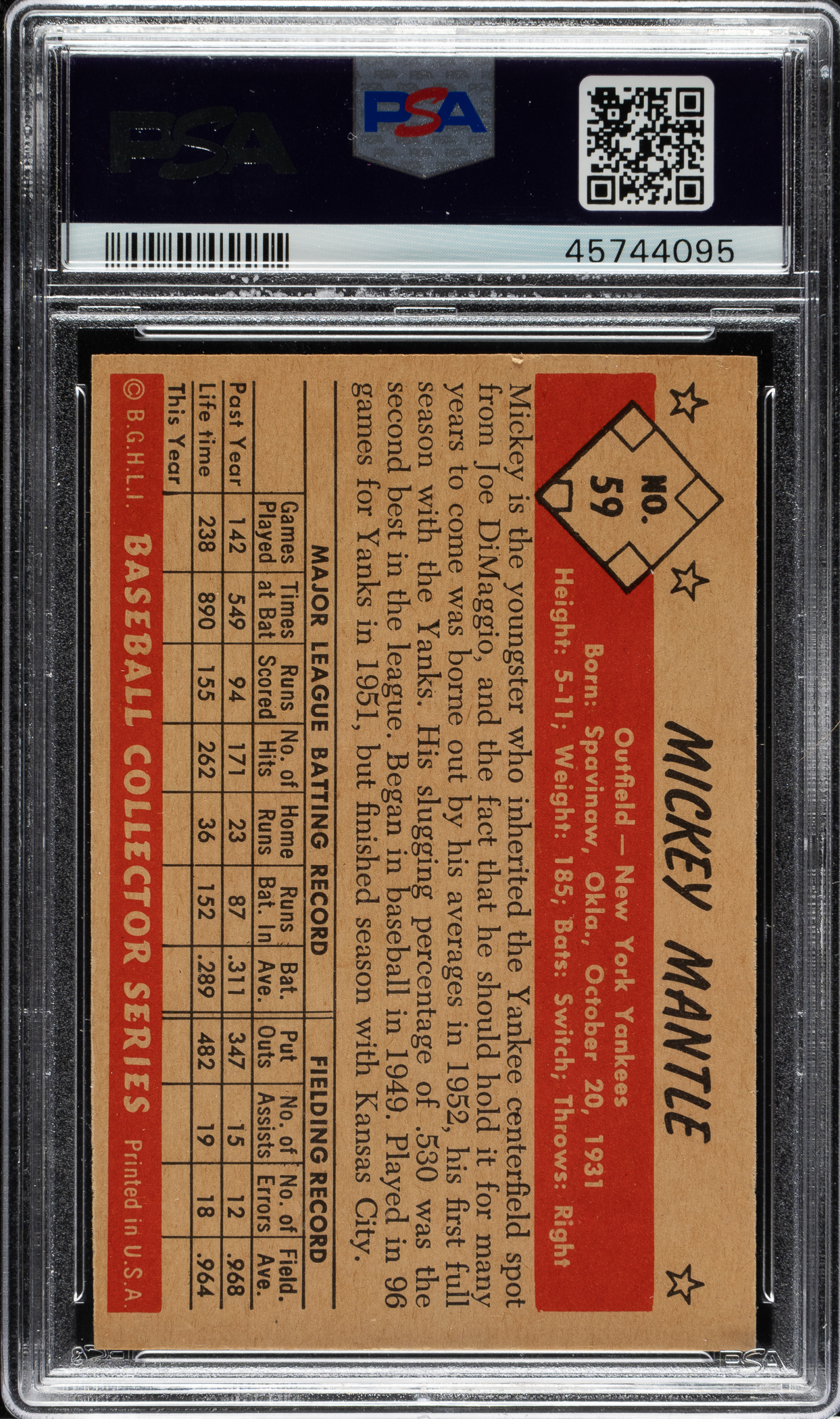 Graded NM+ 7.5 by PSA. High-grade example of this classic card featuring New York Yankees Hall of Famer Mickey Mantle. Bowman's third Mantle card is regarded by many as its best effort. The card features a magnificent photo of Mantle in his follow-through swing. Mantle looks like a youngster in his Yankee pinstripes (he was 21 years old in this photo), and the blue sky provides a perfect backdrop. This example has bright colors, a crisp image, and strong corners. Boldly printed reverse. A fantastic example of one of collecting's most famous cards.